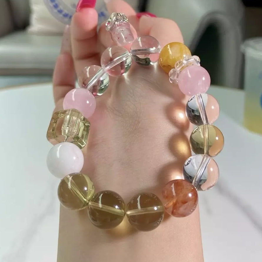 Indulge in the sweet, nourishing energy of this crystal blend💎! Citrine and Yellow Rutile spark joyful wisdom and boost inner confidence, while Rose Quartz adds warm, loving vibes. Red Rutile calms fluctuating moods gently, and Clear Quartz plus White Phantom purify negative energy, sharpen focus and nurture holistic health. Its soft yellow-pink-clear-red palette glows like a honeyed paradise—wear daily for vitality, clarity and abundant positivity✨!