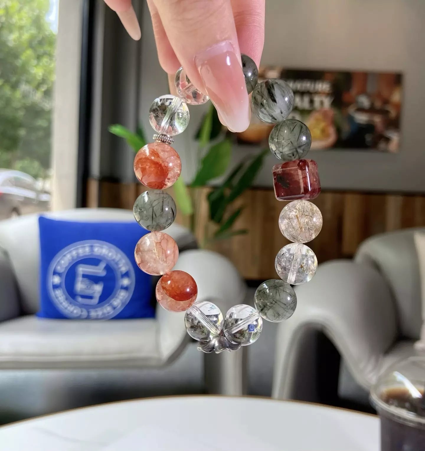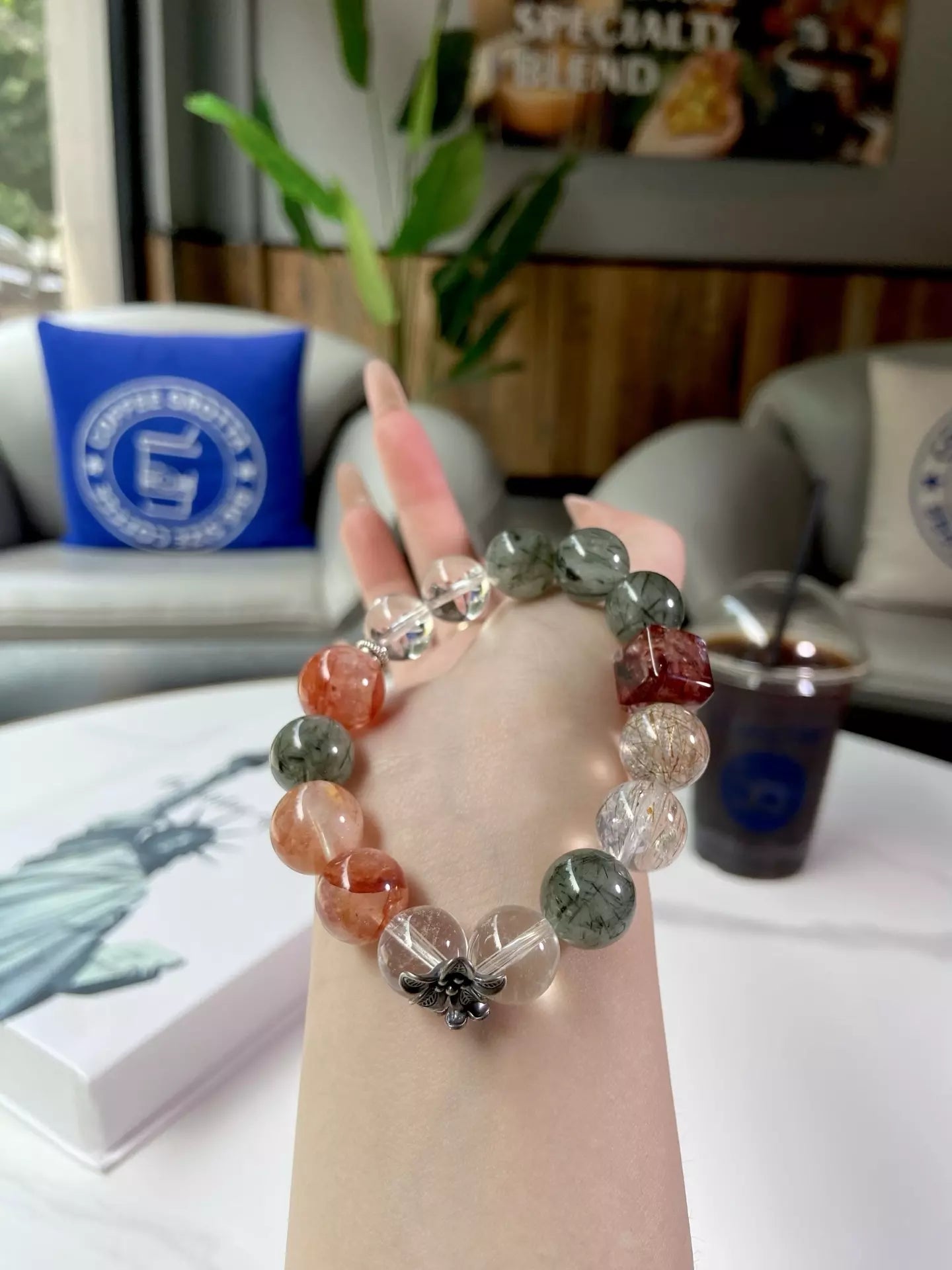 This striking bracelet fuses vivid red rutile quartz, lush green rutilated quartz, rare black gold super seven and clear quartz 💎, glowing like a hidden rainbow courtyard nestled in the abyss. It calms your restless mind to sharpen thinking, nourishes your body by aiding trace element absorption, boosts your inner confidence and helps you build harmonious interpersonal relationships, adding a bold, mystical touch to your wrist 🌟.