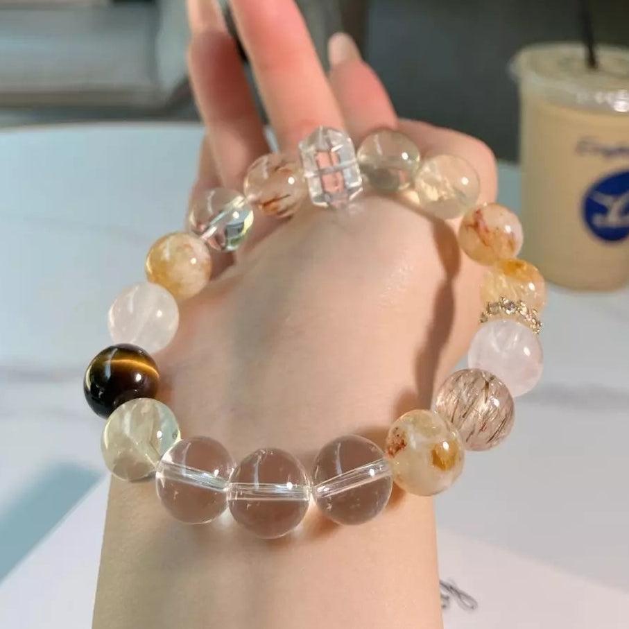 Unleash the perfect balance of fire & calm with this stunning bracelet🔥❄️! Yellow Tiger's Eye 🐅 anchors mood stability, while Citrine & Golden Tower Quartz 💰 draw in wealth and spark academic wisdom📚. Clear Quartz ✨ supercharges confidence to new heights, and Black Gold Super Seven 🖤 melts away stress and anxiety instantly. The bold mix of transparent clarity, sunny yellow, and sleek black shines like a powerful alliance—vibrant, grounded, and unbeatable! Wear daily to crush goals, stay centered, and embrace prosperity with unshakable calm🎇!