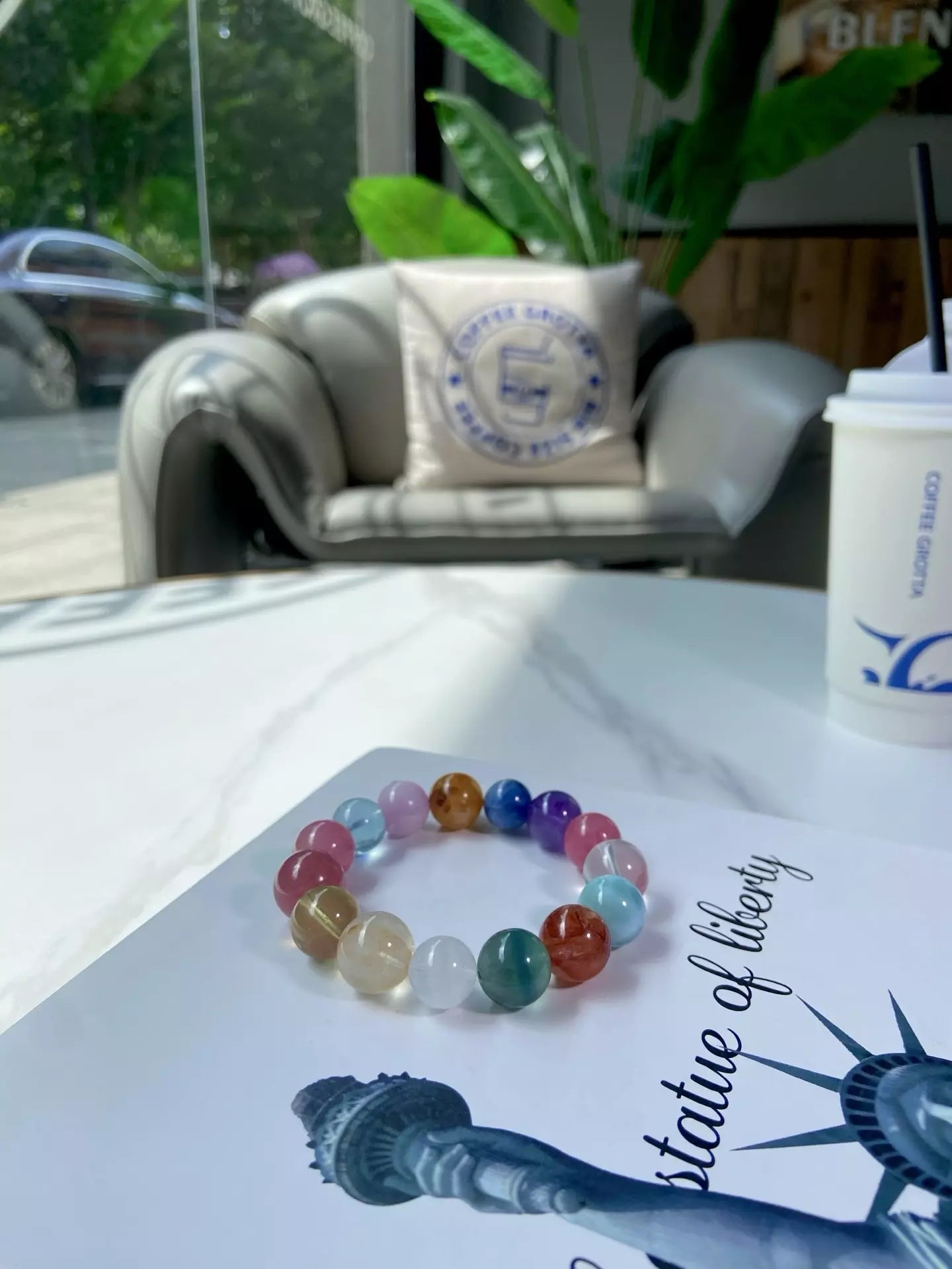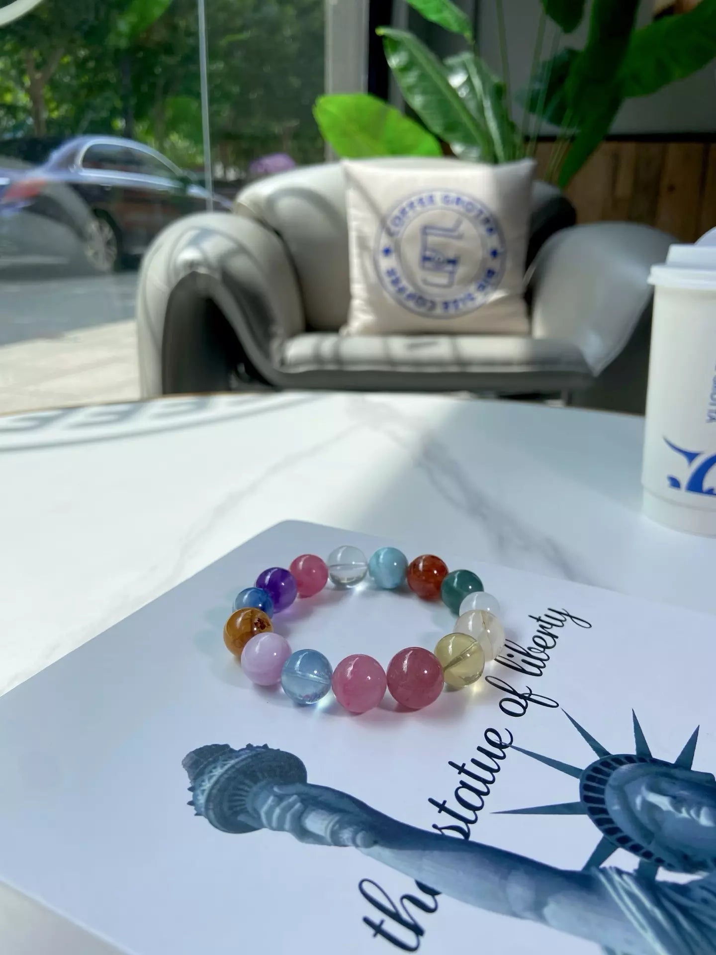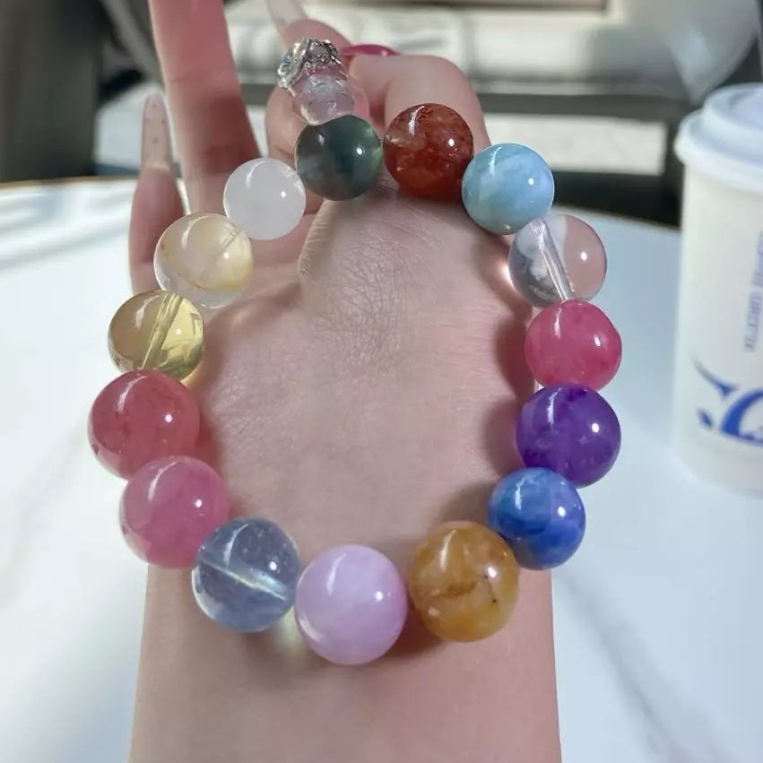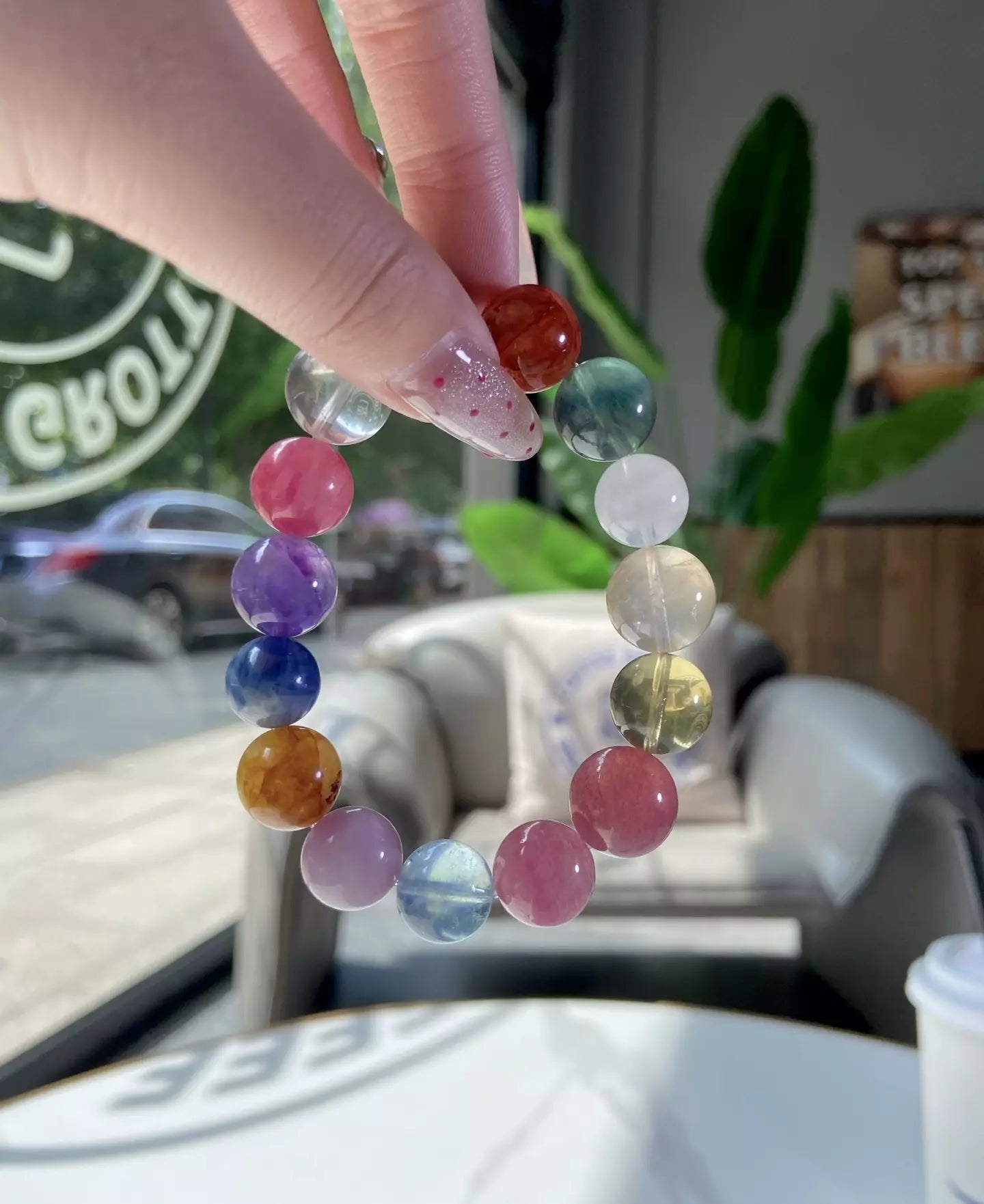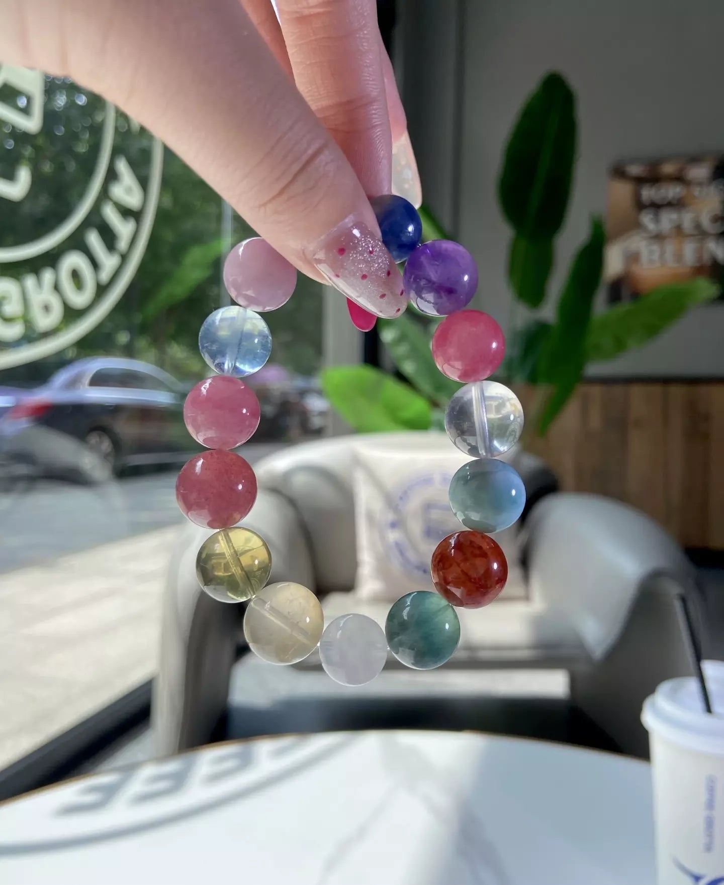 Indulge in the vibrant, joyful energy of this dazzling crystal medley💎! Kyanite and Aquamarine calm fluctuating moods smoothly, while Strawberry Quartz and Rhodonite weave sweet vibes for love and connections. Citrine sparks positivity and vitality, Rainbow Fluorite sharpens intuition, and White Phantom purifies negative energy. Its vivid colorful palette glows like a blooming rainbow—wear daily for joy, balance and charming vibes✨!
