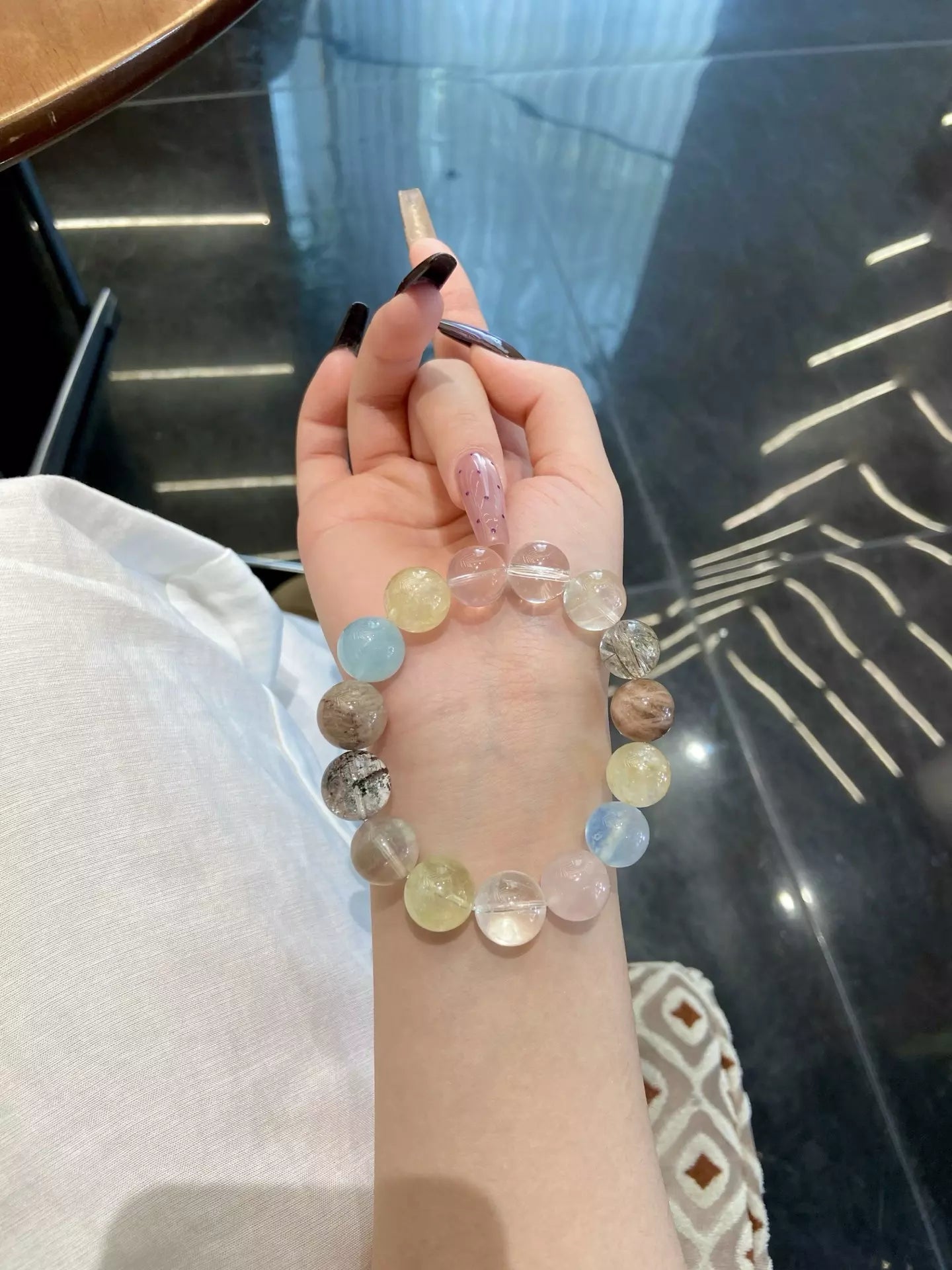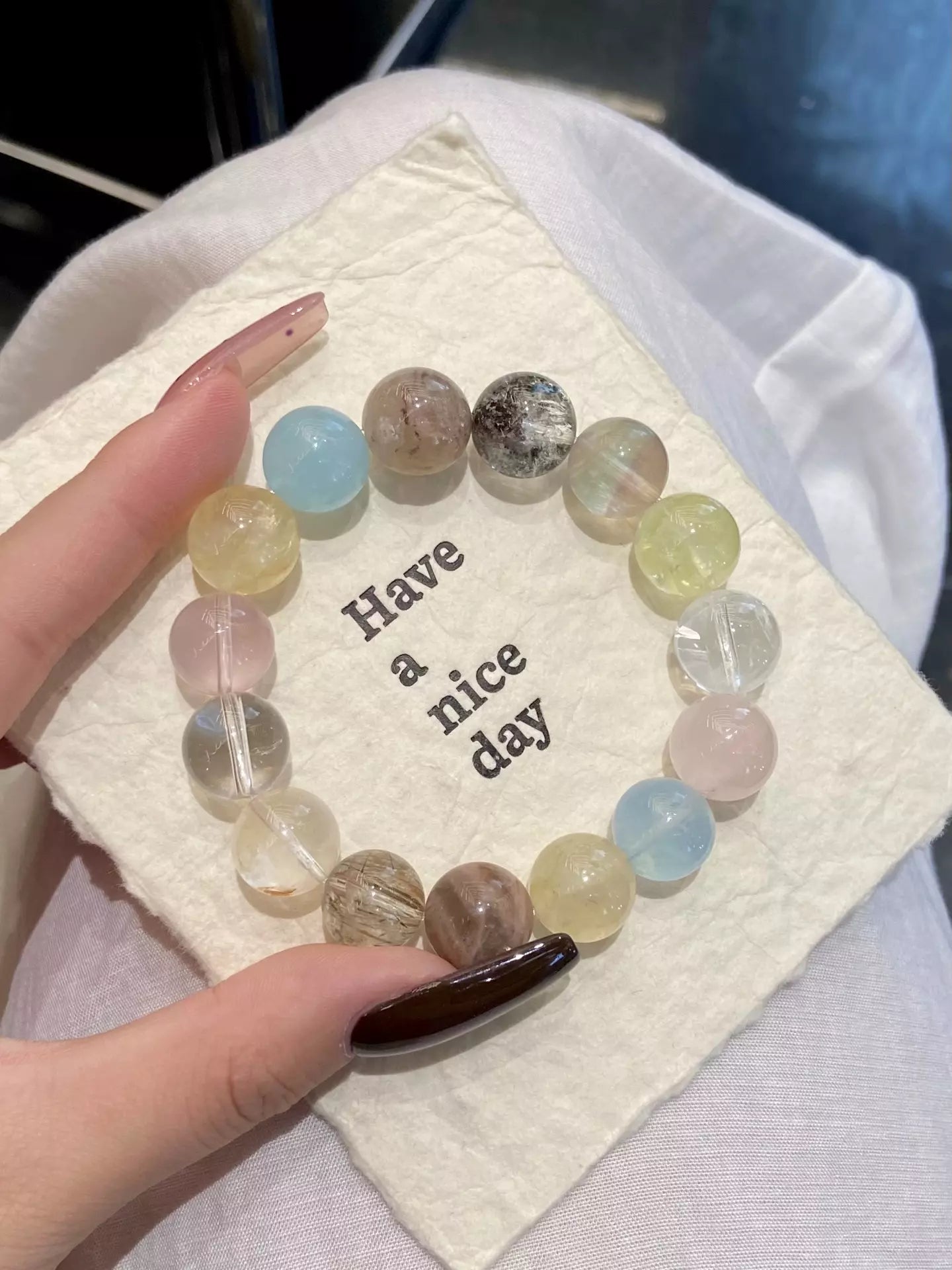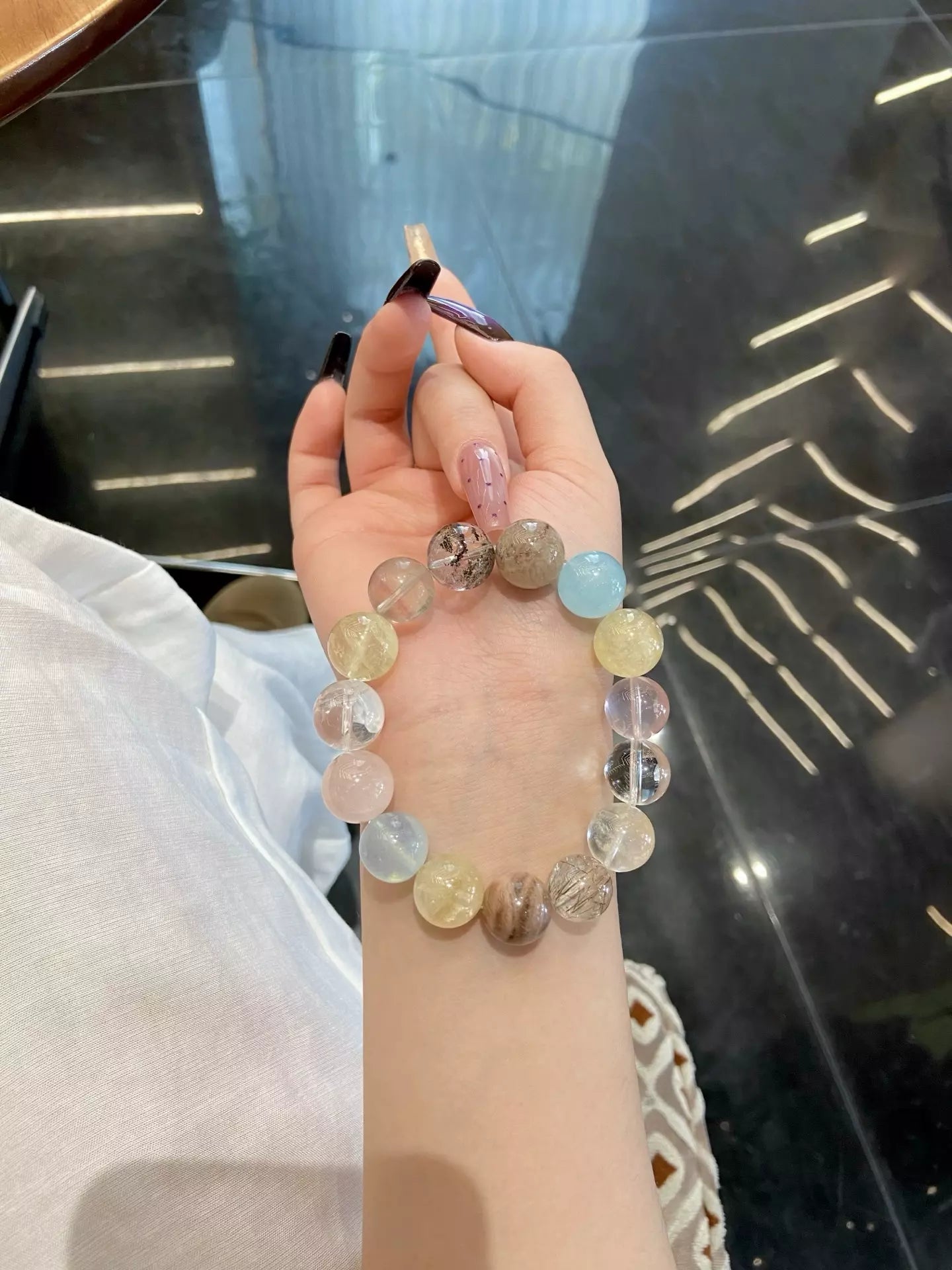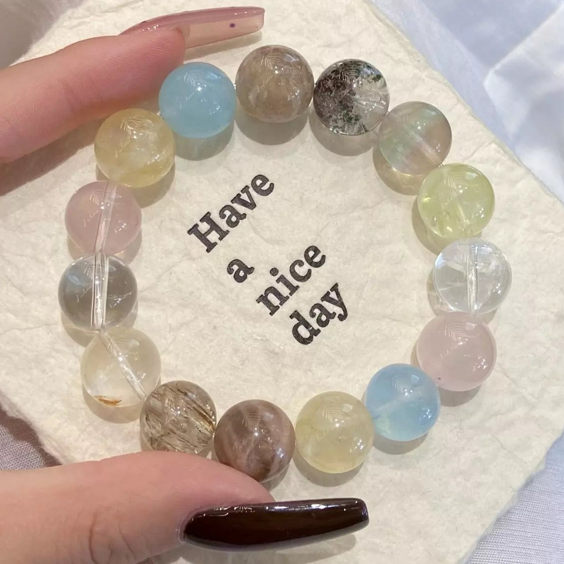 Step into a whimsical crystal paradise🌴💎! Green/Layered Phantom Quartz wrap you in safe protection🛡️, while Aquamarine soothes discomfort. Rose Quartz adds gentle warmth❤️, Clear Quartz + White Auralite purify energy🧹, and Black Gold Super Seven + Skeletal Quartz amplify vitality. Yellow Rutilated Quartz + Citrine boost unshakable confidence💪, all blended in vibrant multicolor hues. This dreamy mix balances mind-body harmony, perfect for daily wear to embrace calm, courage, and radiant positive energy✨!