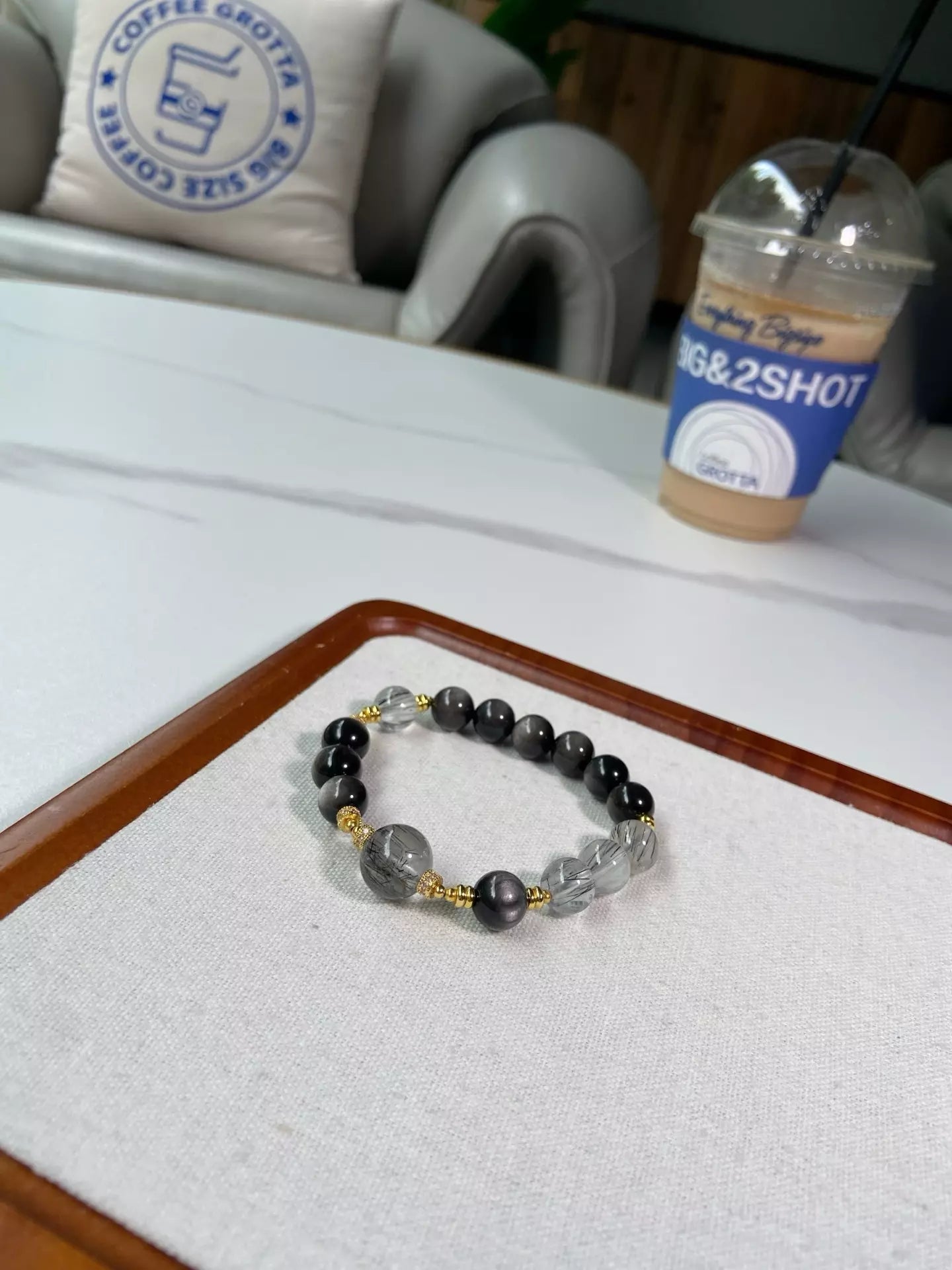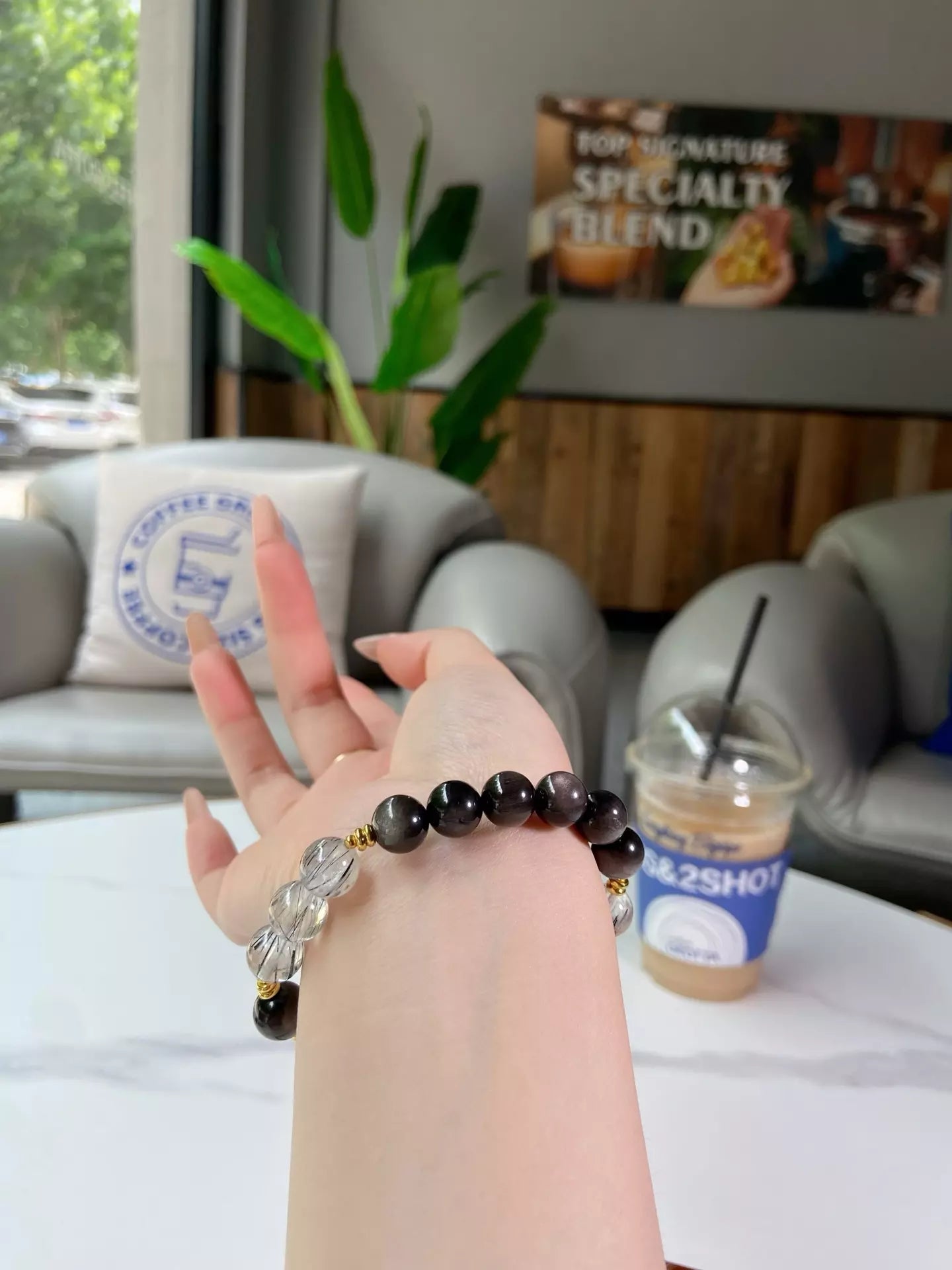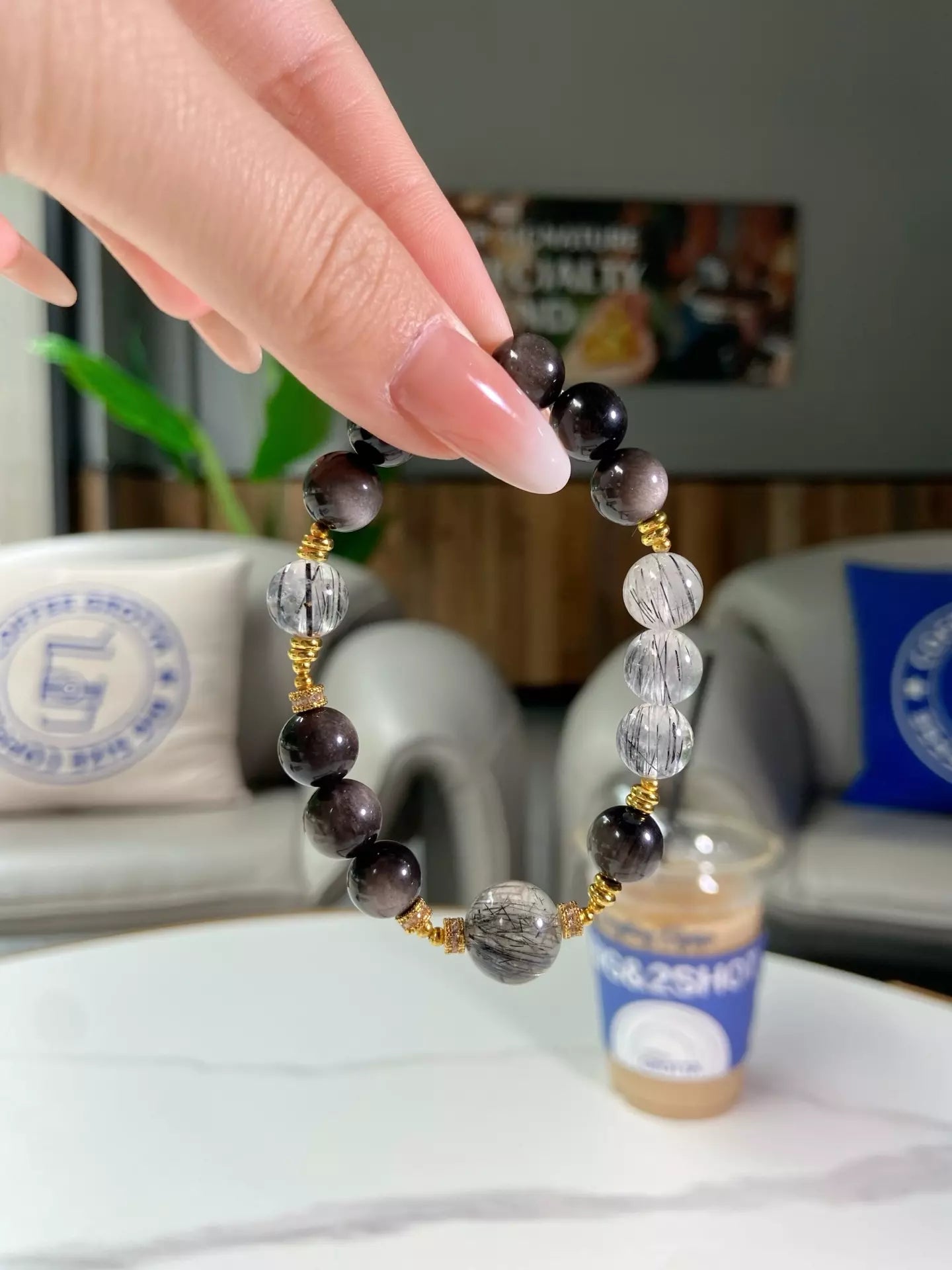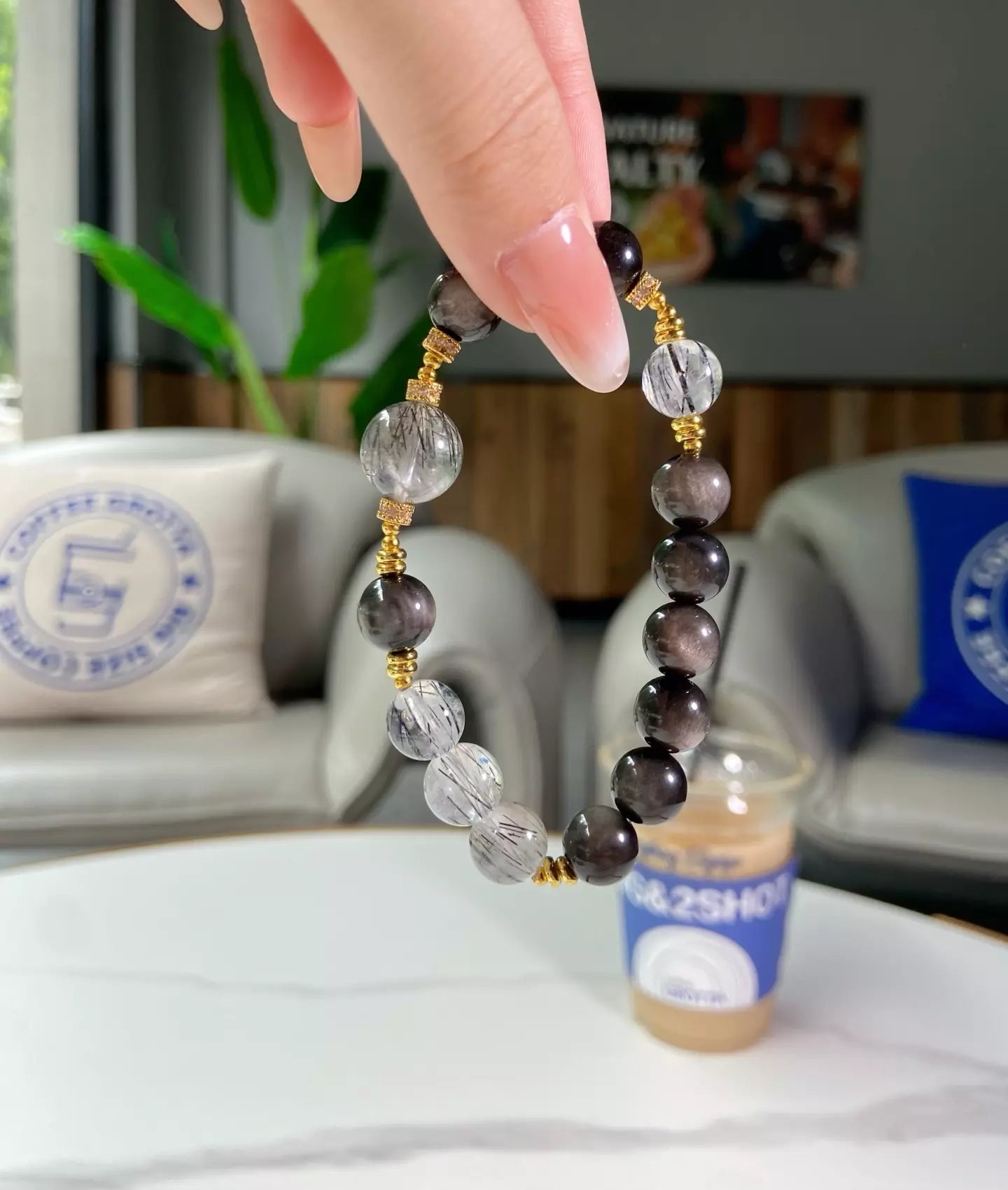 Step into mysterious cosmic vibes with Dark Cosmos & Flowing Silver🌌! Silver Obsidian’s sleek black surface glimmers with silvery streaks, calming your mind😌 and warding off negative energy🛡️. Black Rutilated Quartz boosts blood circulation♻️, relieves daily fatigue🥱, and regulates your physical state. The blend of deep black and transparent threads mirrors a starry night sky—wear daily to stay grounded, energized, and wrapped in quiet protection that exudes cool, understated charm🖤!
