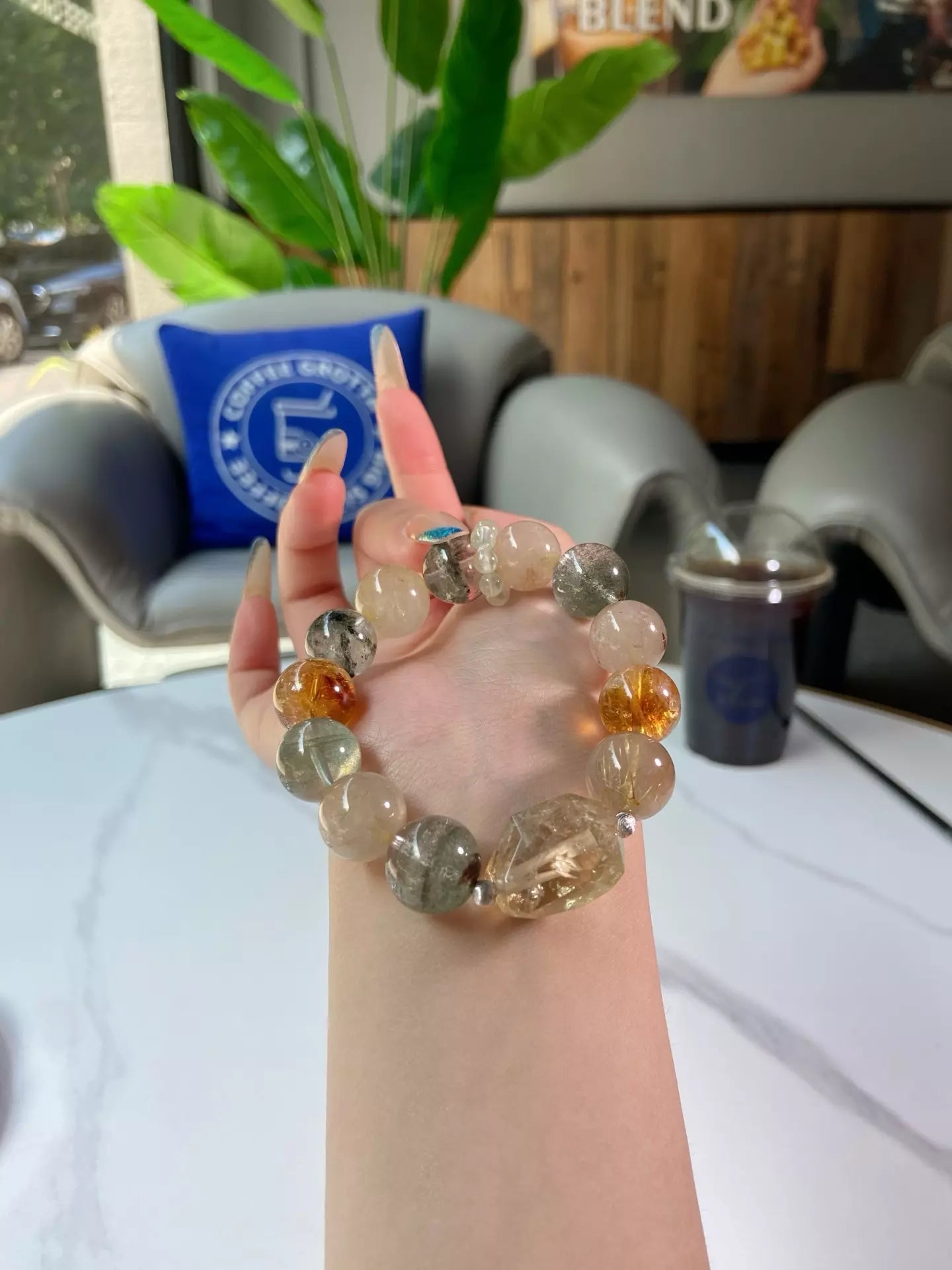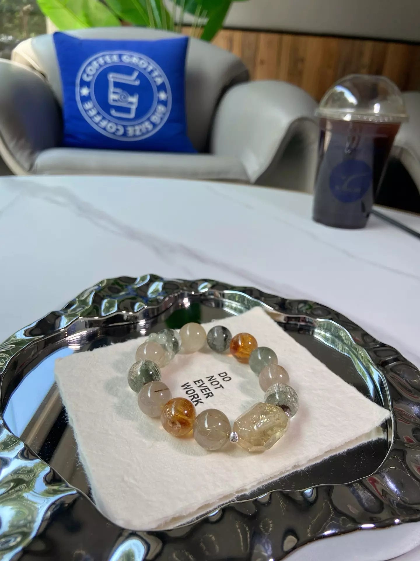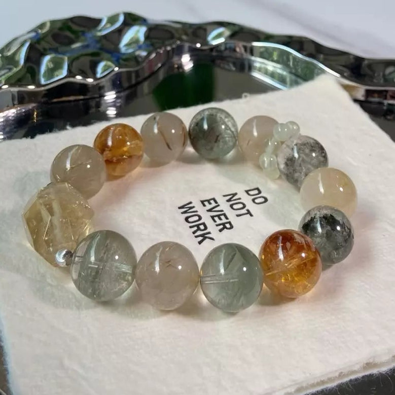 Immerse in the lush, luxurious energy of this bracelet💎✨! Green Phantom nurtures your holistic wellness and balances inner vibes. Golden Rutilated Quartz boosts skin radiance for a glowing complexion, while Golden Tower Quartz calms your mind to upgrade sleep quality. Its striking green-black-yellow palette glows like gilded light through emerald foliage. Wear daily to embrace vitality, beauty and restful nights💫!