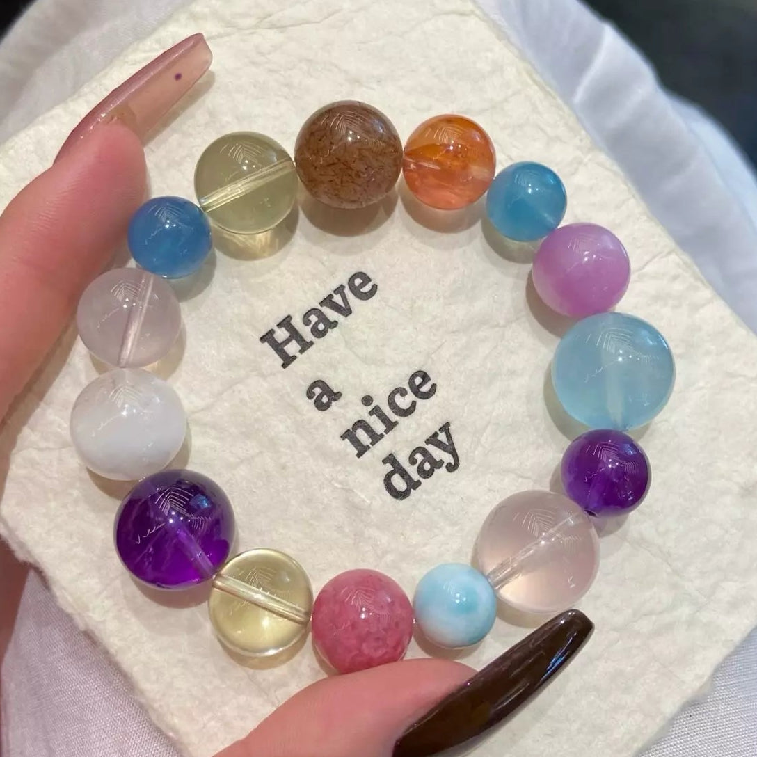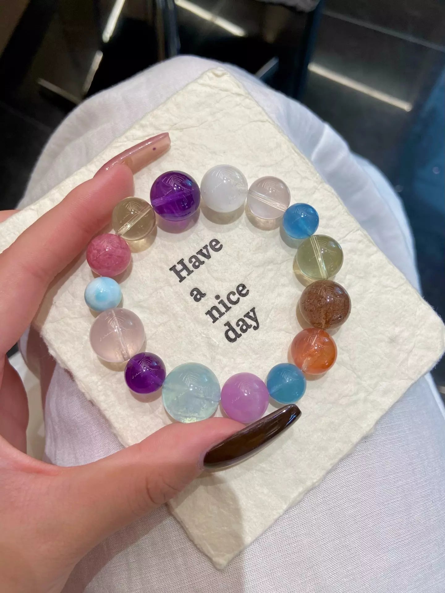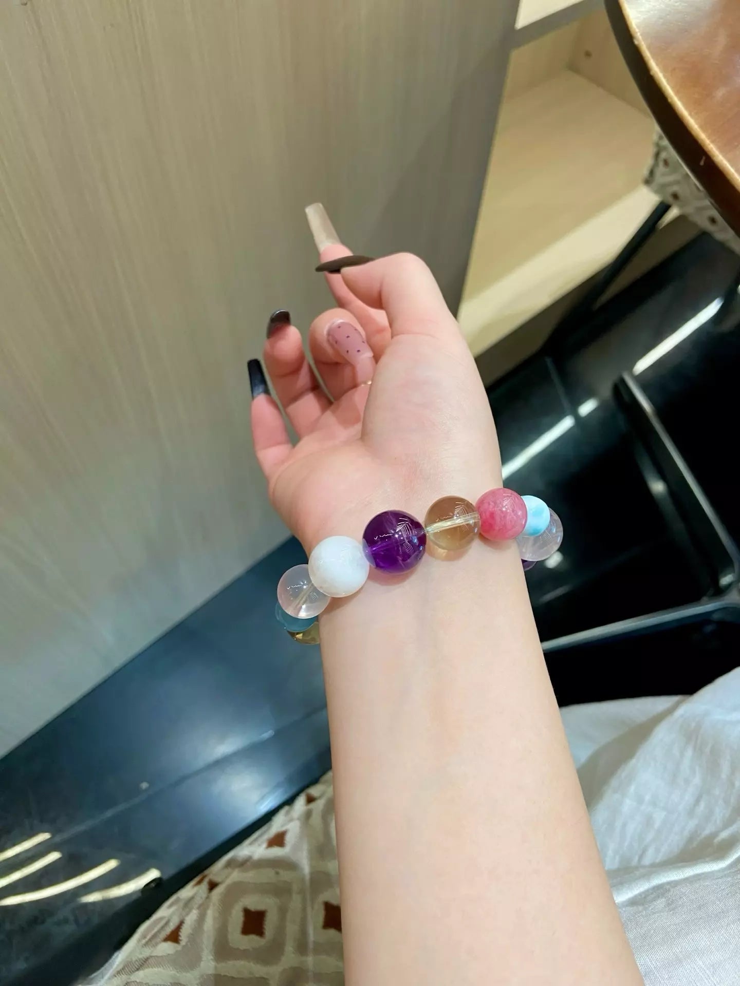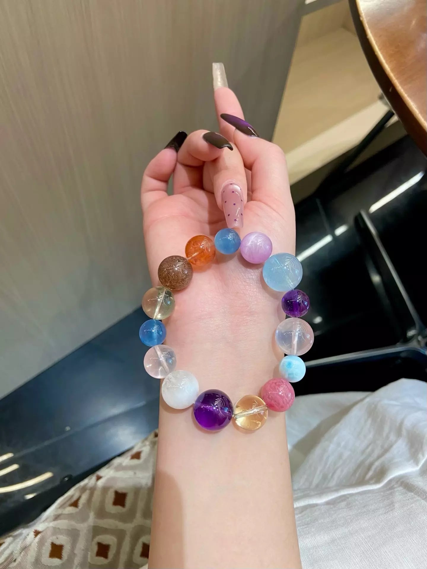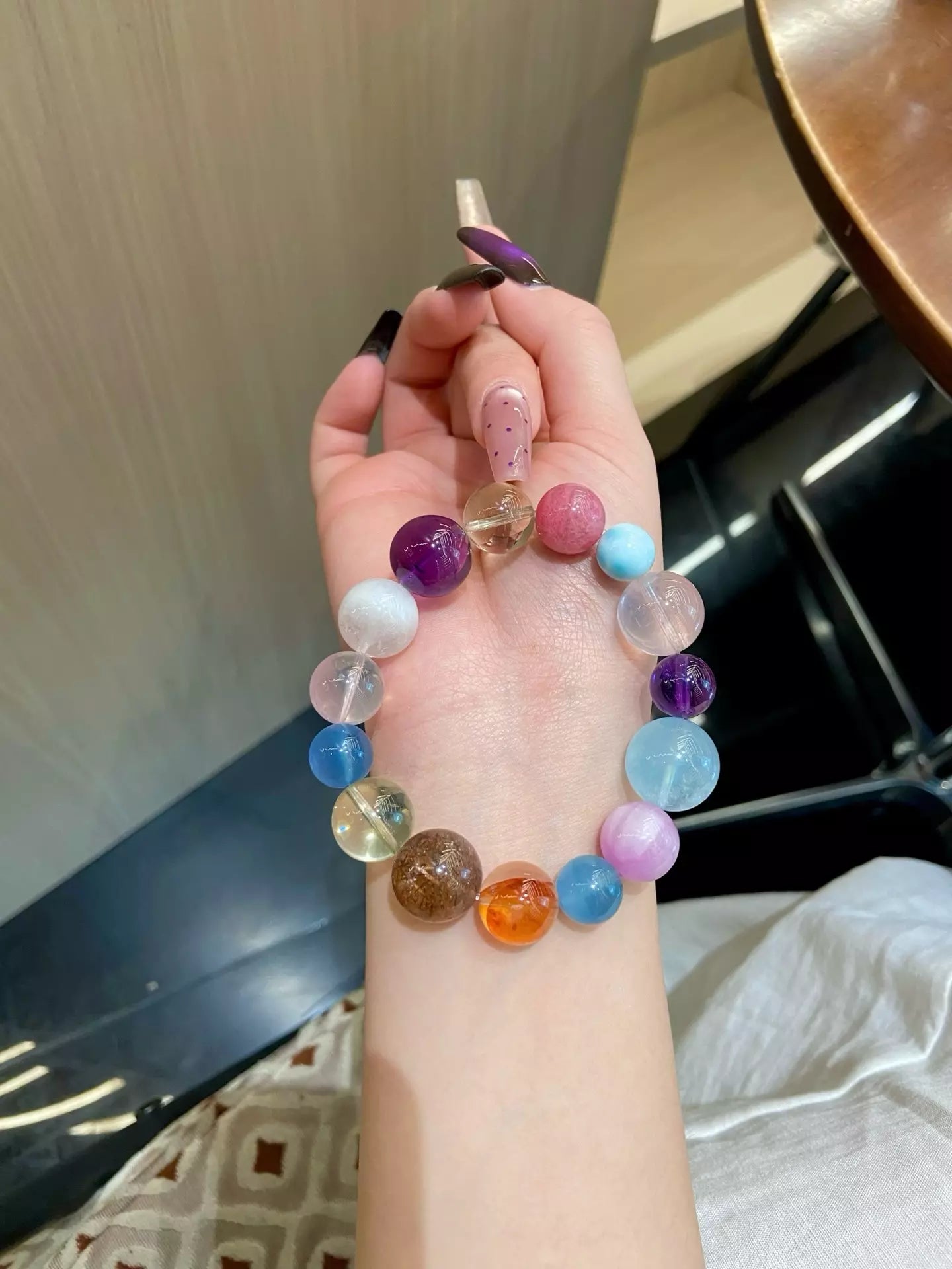 Dive into the enchanting glow of this galaxy-inspired crystal blend💎! Amethyst🔮 & Kunzite💜 spark wisdom, Rose Quartz💖 nurtures sweet romance, and Aquamarine💧 & Larimar🌊 soothe your mood deeply. Citrine☀️ brings lucky vibes, White Phantom Quartz👻 purifies negative energy, and Red Rutilated Quartz❤️ boosts vitality. Its vivid multicolor hues mirror the eternal night sky—wear daily to shine with cosmic charm, embrace inner peace, and attract wonderful blessings🌟!