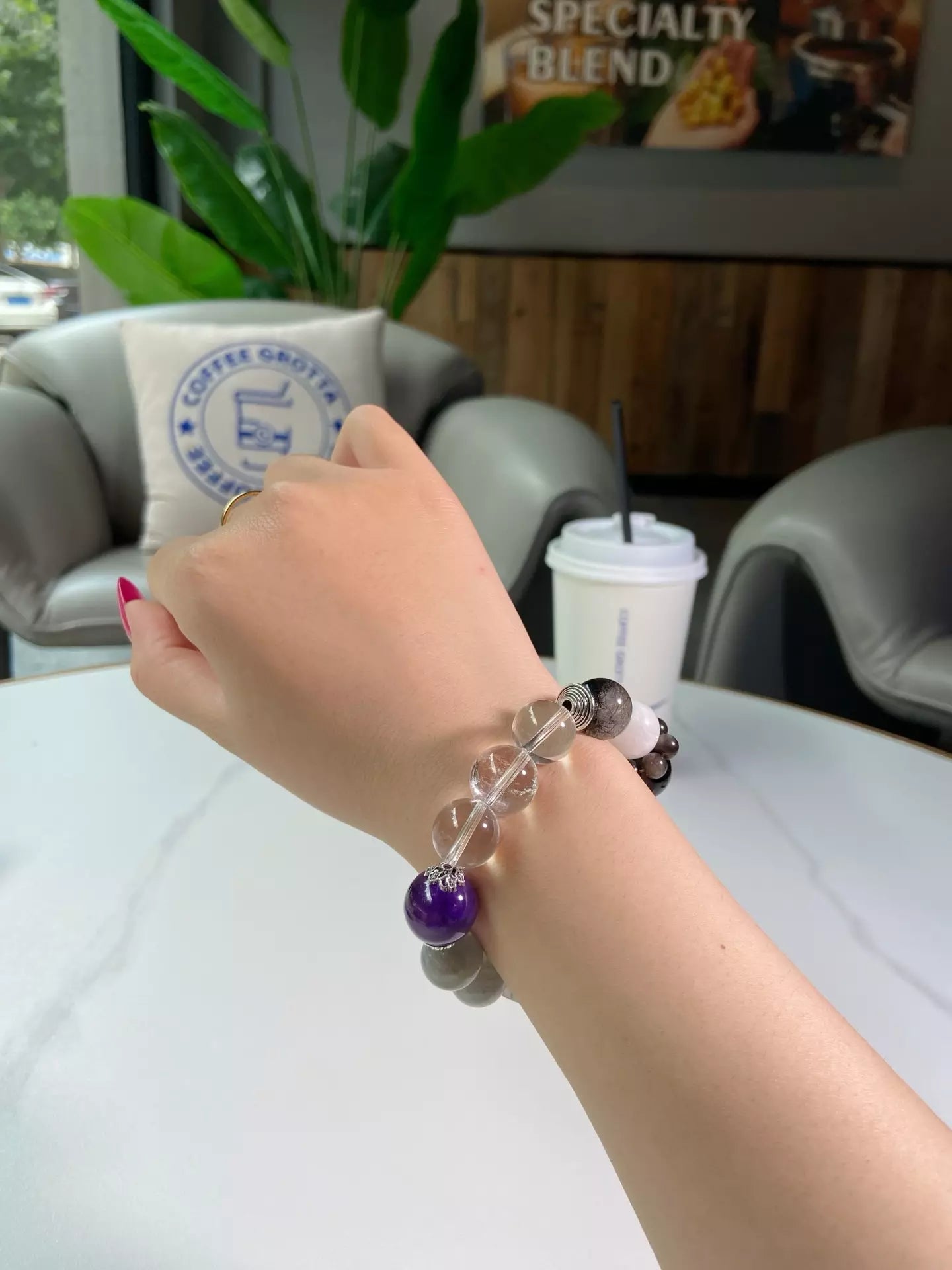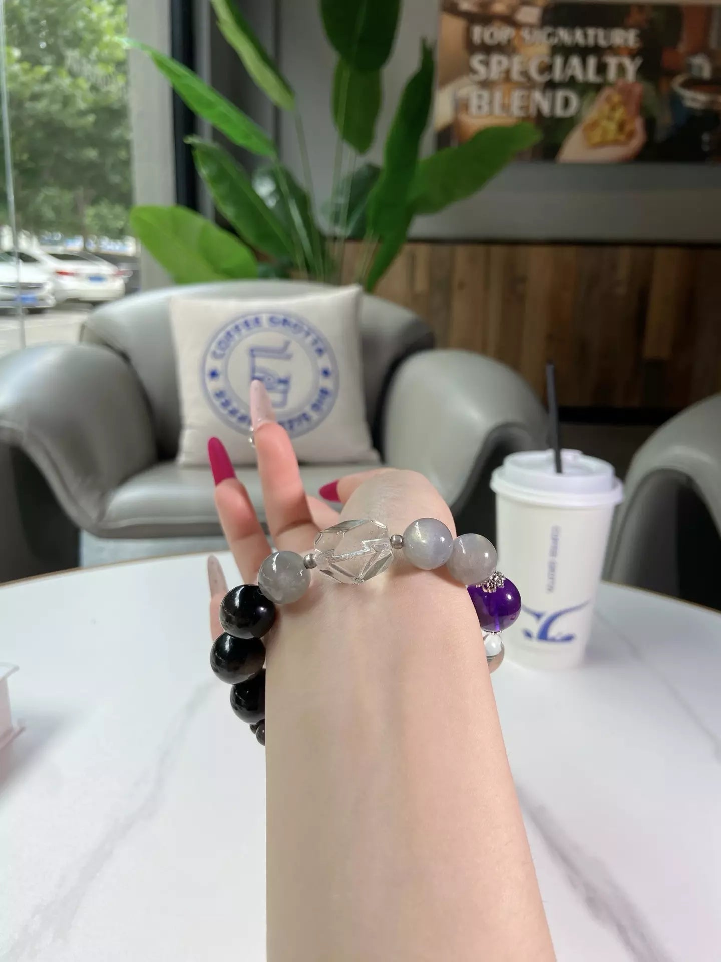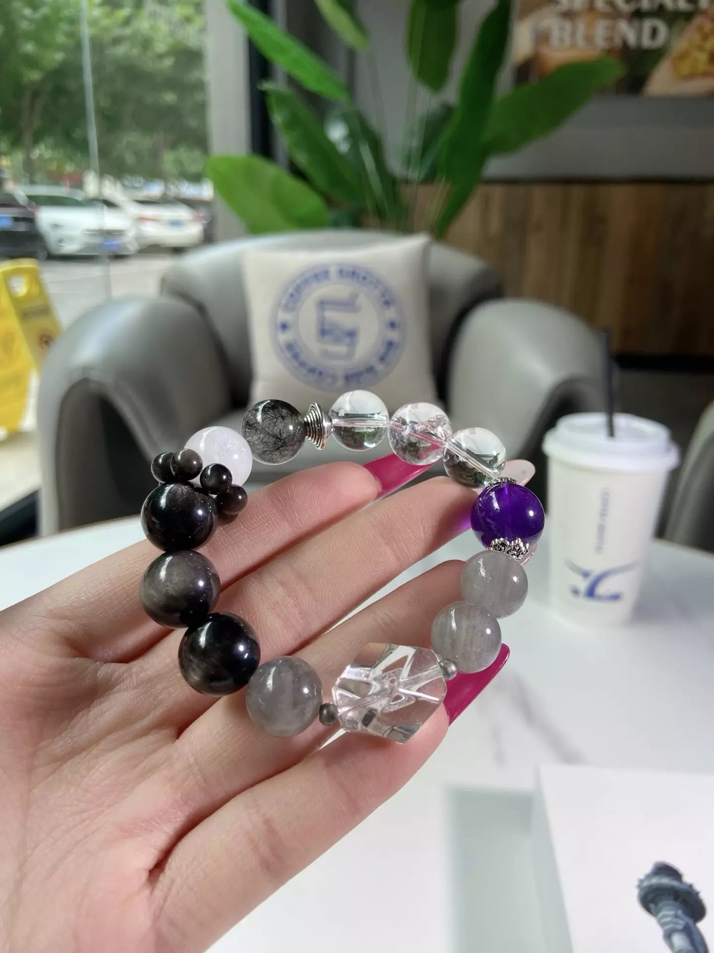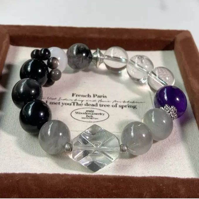 Immerse in the calm, mystical energy of this bracelet💎🌙! Grey Moonstone & Silver Sheen Obsidian balance fluctuating emotions and sharpen intuitive senses🔮. Amethyst soothes your restless mind, while Clear Quartz purifies negative vibes and Black Rutilated Quartz grounds your energy. Its sleek black-clear-purple-grey palette glows like soft dawn breaking through eternal night—wear daily to embrace inner harmony, intuitive clarity and tranquil strength✨!