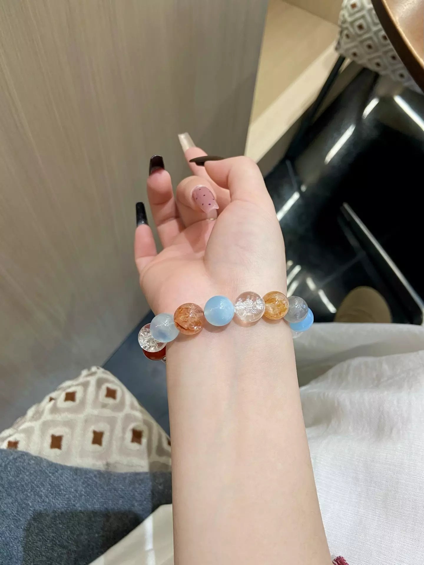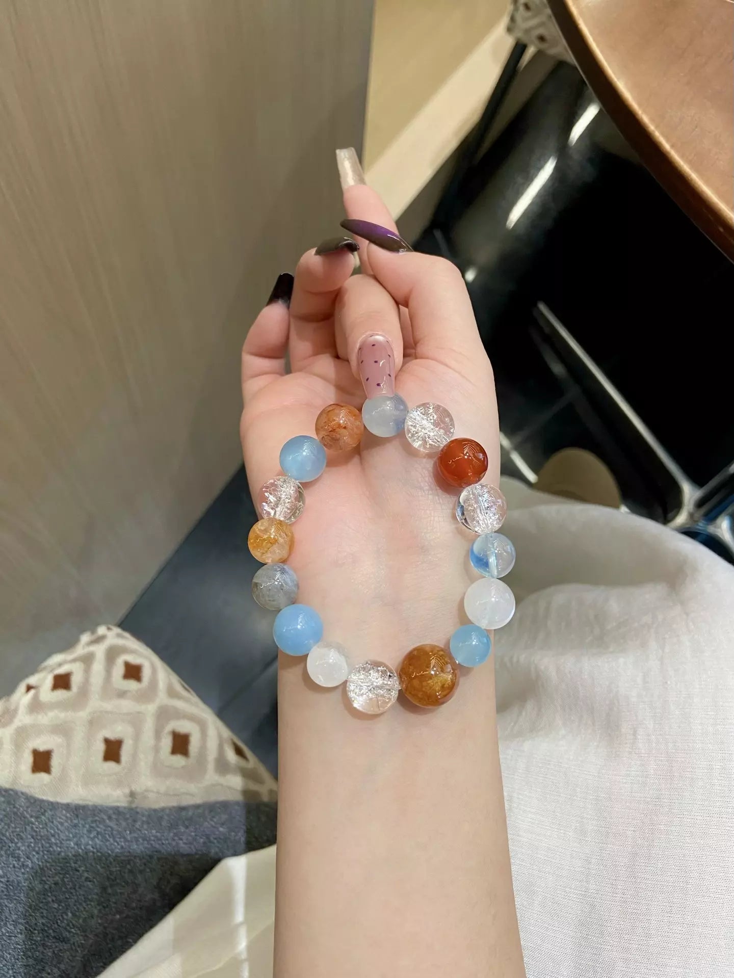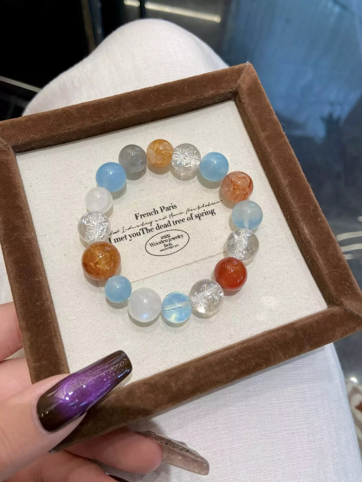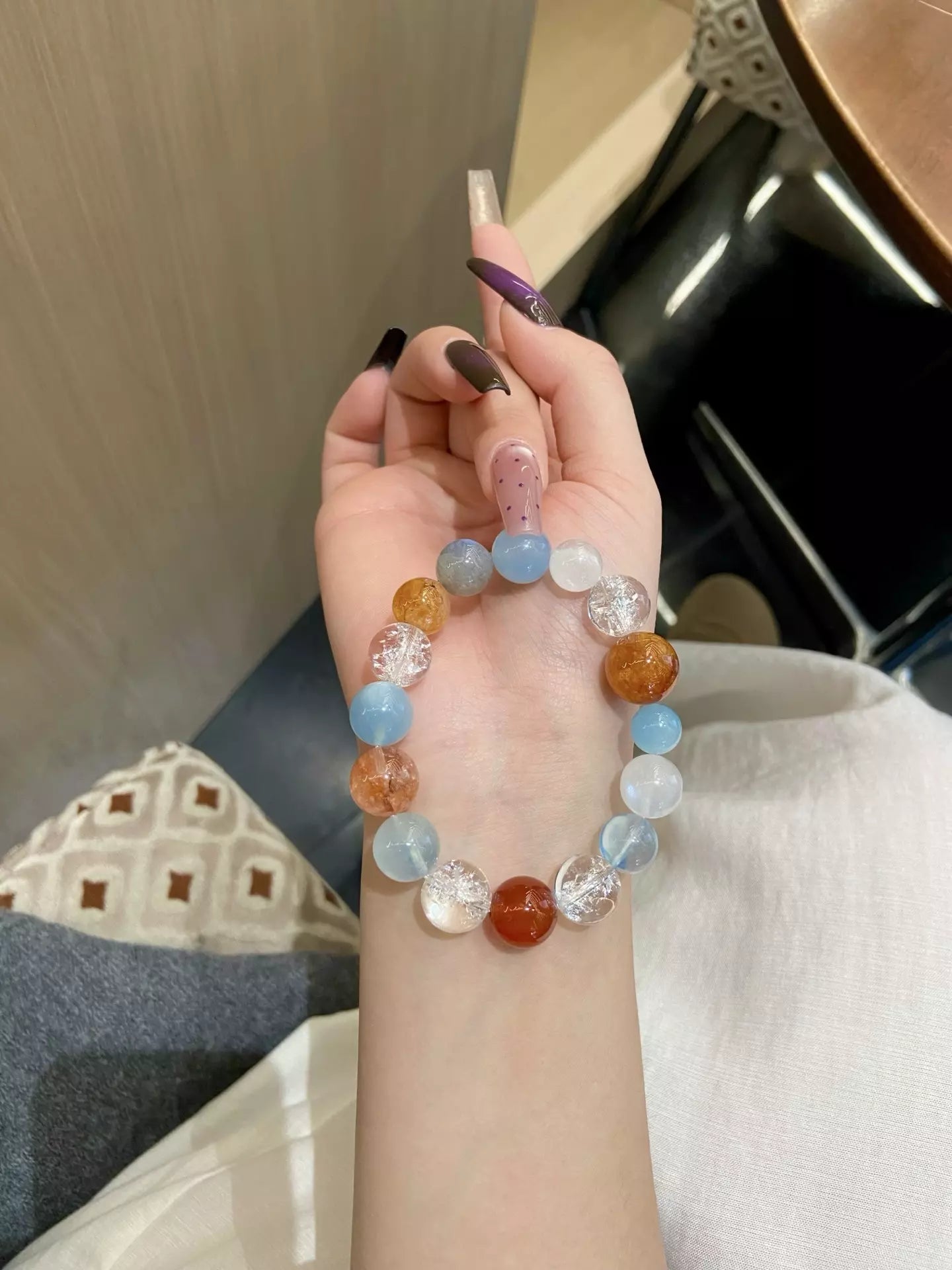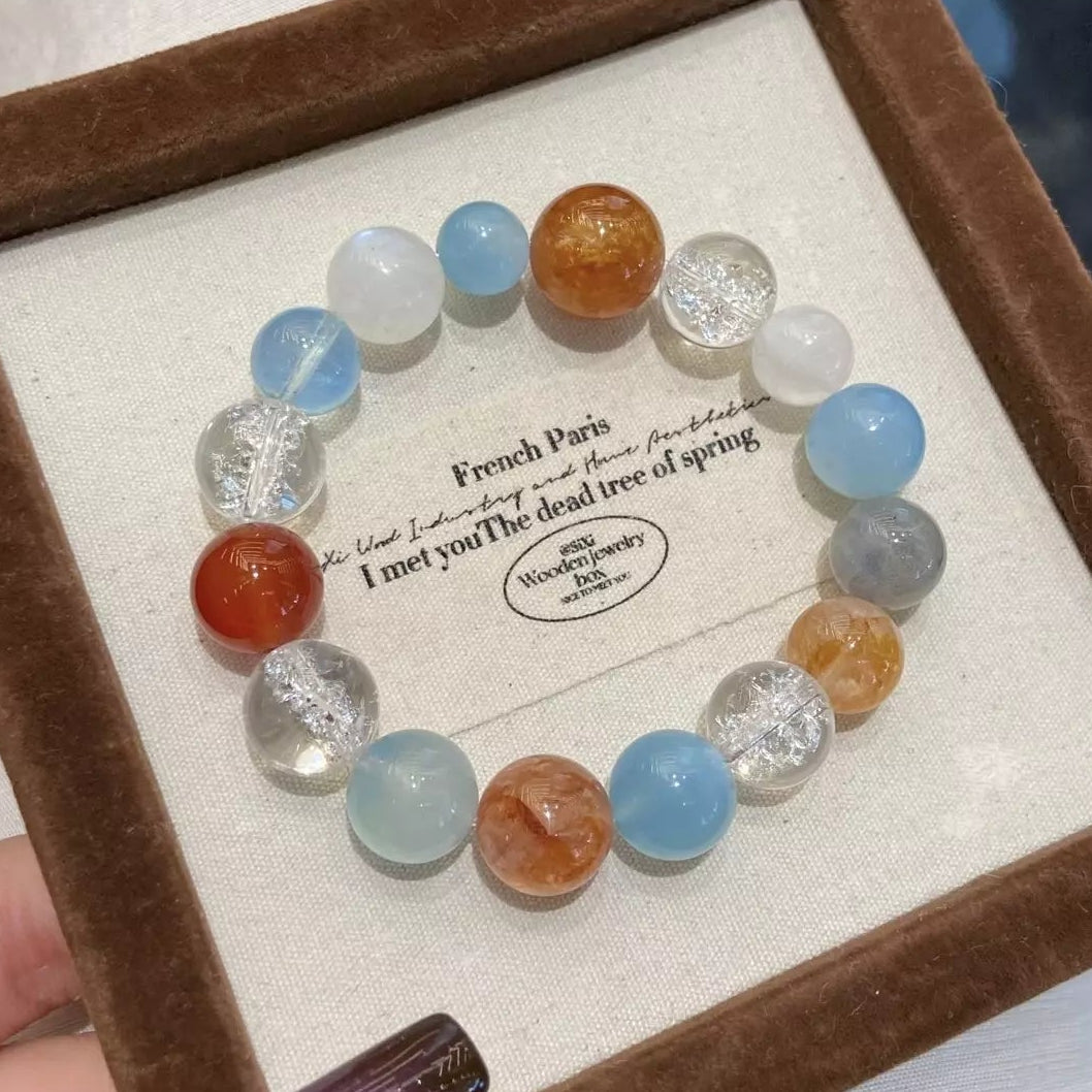 Dance with ethereal magic like fireflies in the night✨! Blue Moonstone guards sweet dreams🌙, while Aquamarine’s calm blue soothes the mind. Gray Moonstone stabilizes mood😌, Yellow Rutilated Quartz ignites sunny vitality⚡, and Himalayan Quartz purifies energy with transparent clarity. Red Agate boosts courage❤️, White Phantom Quartz sharpens intuition🔮—blending yellow warmth, white purity, gray calm, transparent clarity, and red passion. This dreamy blend weaves comfort and vitality, perfect for daily wear to embrace joy and inner peace✨!