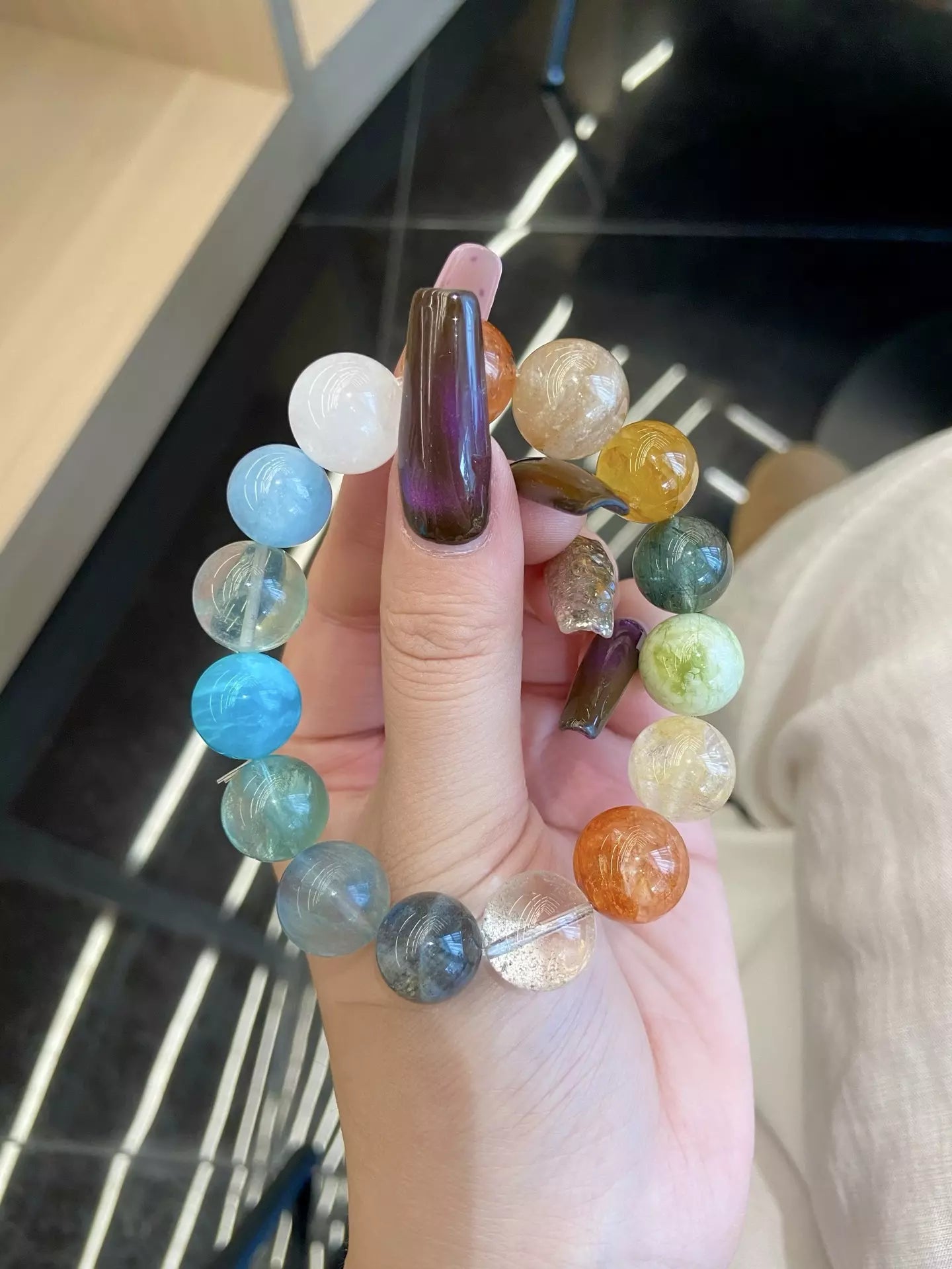 Elements: Green Rutilated Quartz🌱, Green Grape Milk Cap Quartz🍇, Yellow Rutilated Quartz🌞, Red Rutilated Quartz❤️, Green Phantom Quartz🌿, Gray Moonstone🌙, Rainbow Fluorite🌈, Green Fluorite💚, Amazonite💧, Aquamarine🌊, White Phantom Quartz☁️, Layered Phantom Quartz🌀