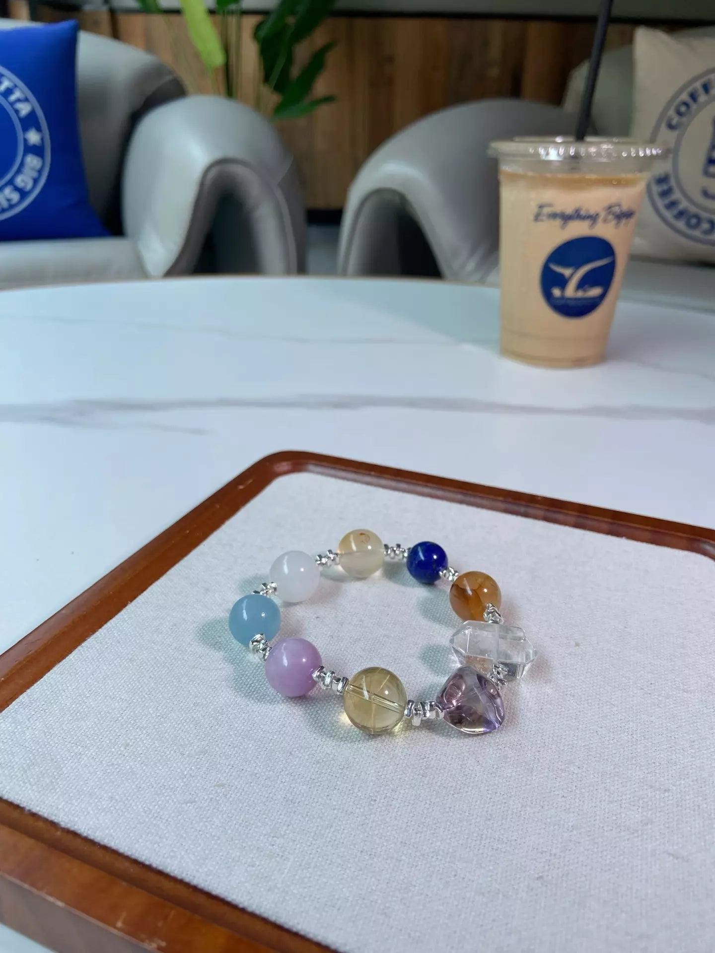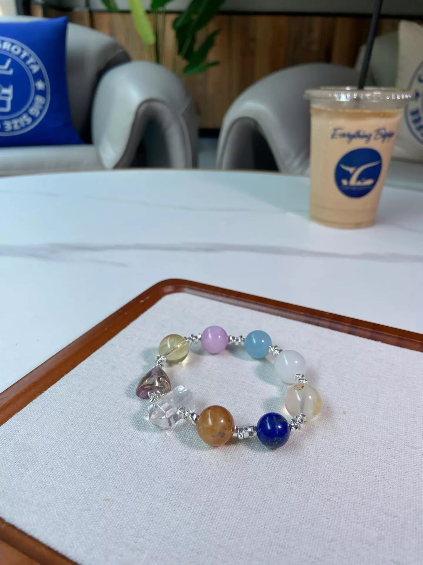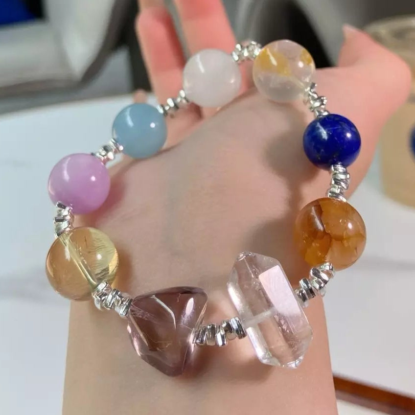 Embrace the soothing warmth of this multi-crystal blend💎! Citrine💛 & Yellow Rutilated Quartz🌼 infuse sunny energy to balance mood swings. Kunzite💖 wraps your heart in gentle calm, while Aquamarine💧 cools restless thoughts. White Phantom Quartz🌨️ purifies negative vibes, and Lapis Lazuli💙 brings inner peace. Their colorful palette glows softly—warm yet delicate. Wear daily to stay emotionally balanced, ease mental clutter, and radiate gentle, steady vibes wherever you go🌟!