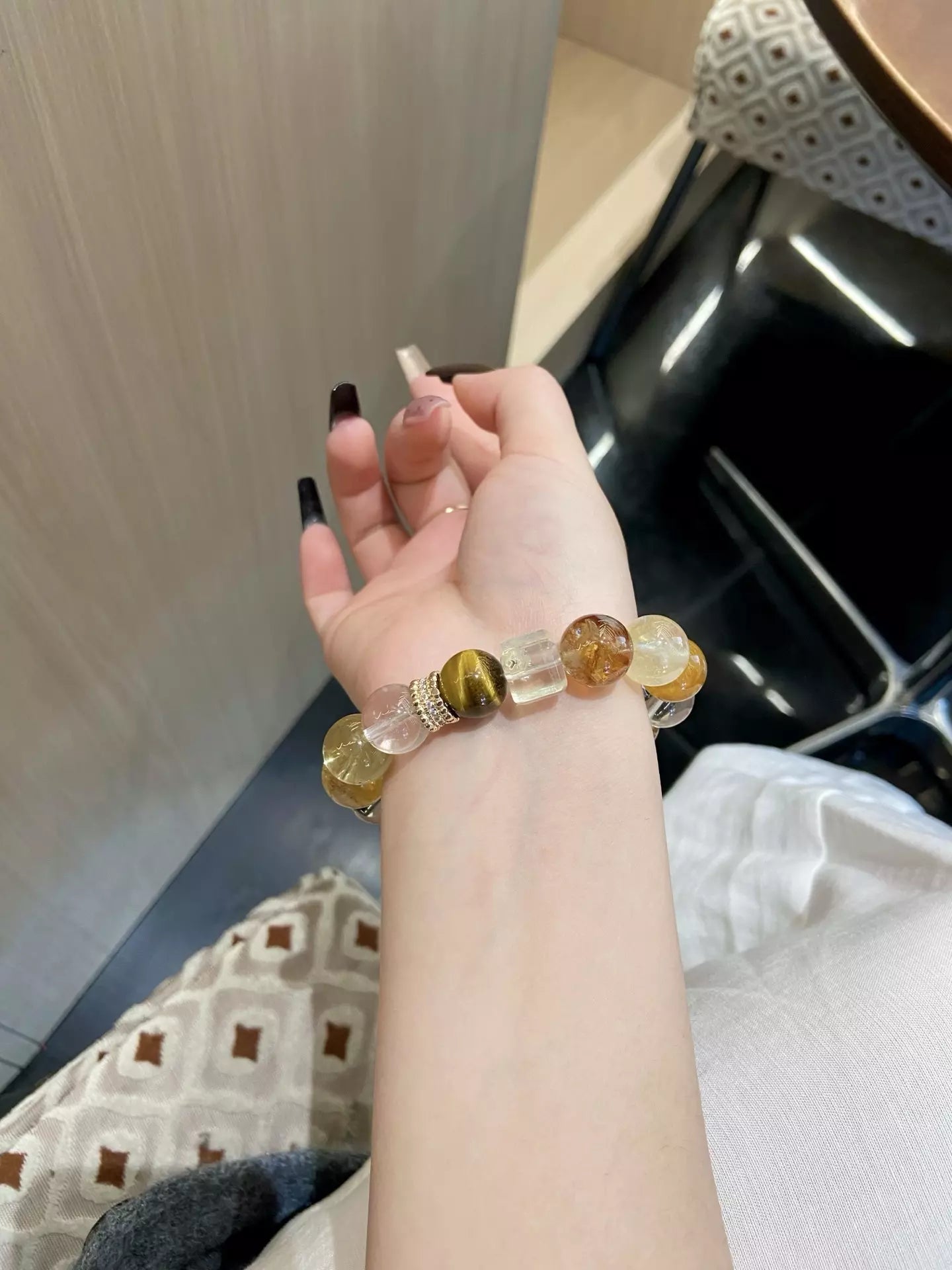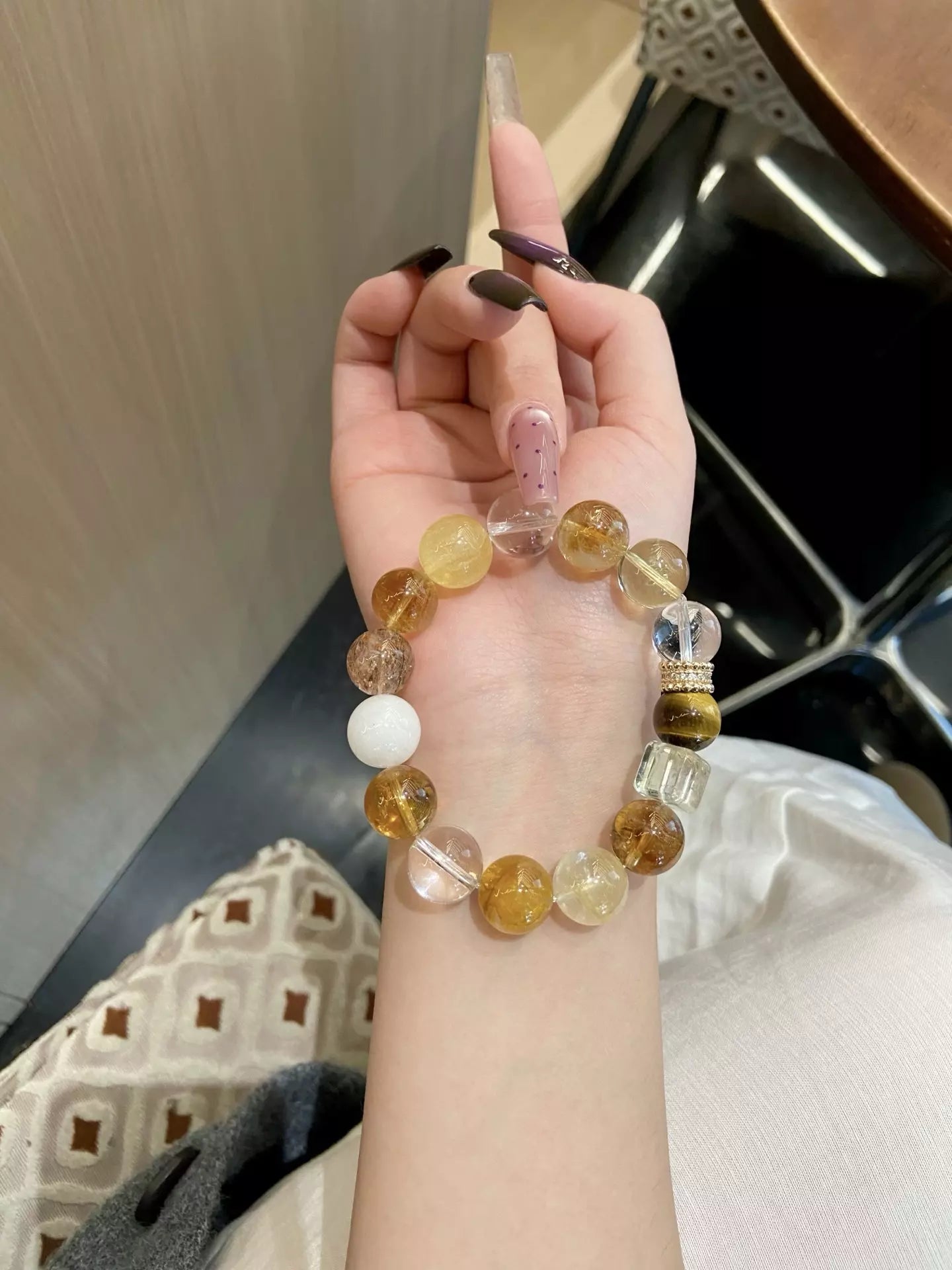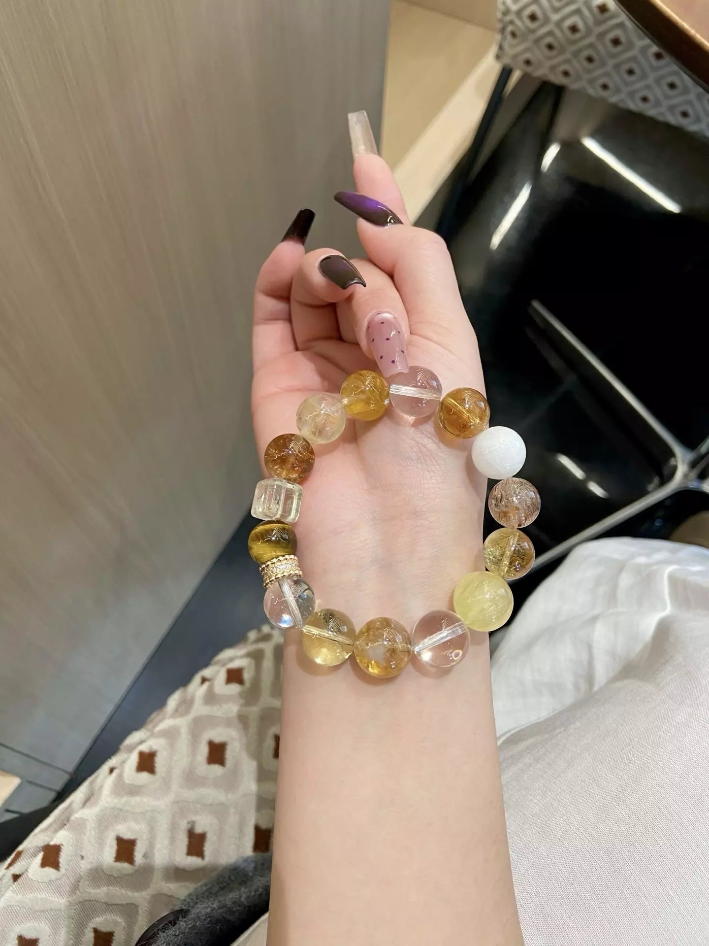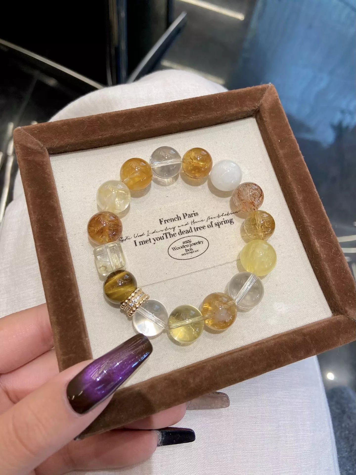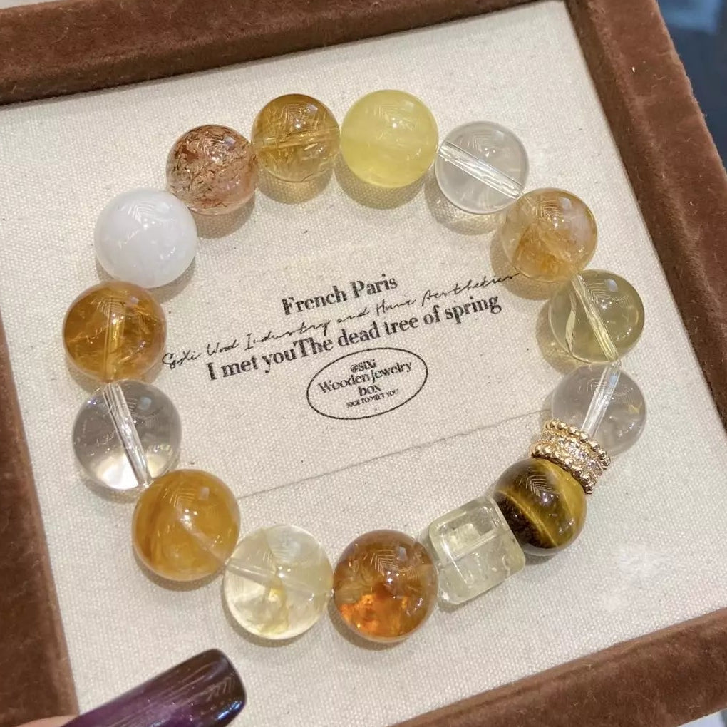 Unveil the golden charm hidden in the night✨💰! Yellow Tower Quartz + Citrine + Yellow Tiger's Eye attract wealth and fuel wisdom for academic wins. Silk Yellow Fluorite eases stress😌, Black Gold Super Seven shields from negativity🛡️, and Clear Quartz amplifies all crystal powers. White Phantom Quartz adds pure protection, blending yellow radiance, transparent clarity, black depth, and white purity. Wear daily to embrace prosperity, confidence, and calm in every moment!