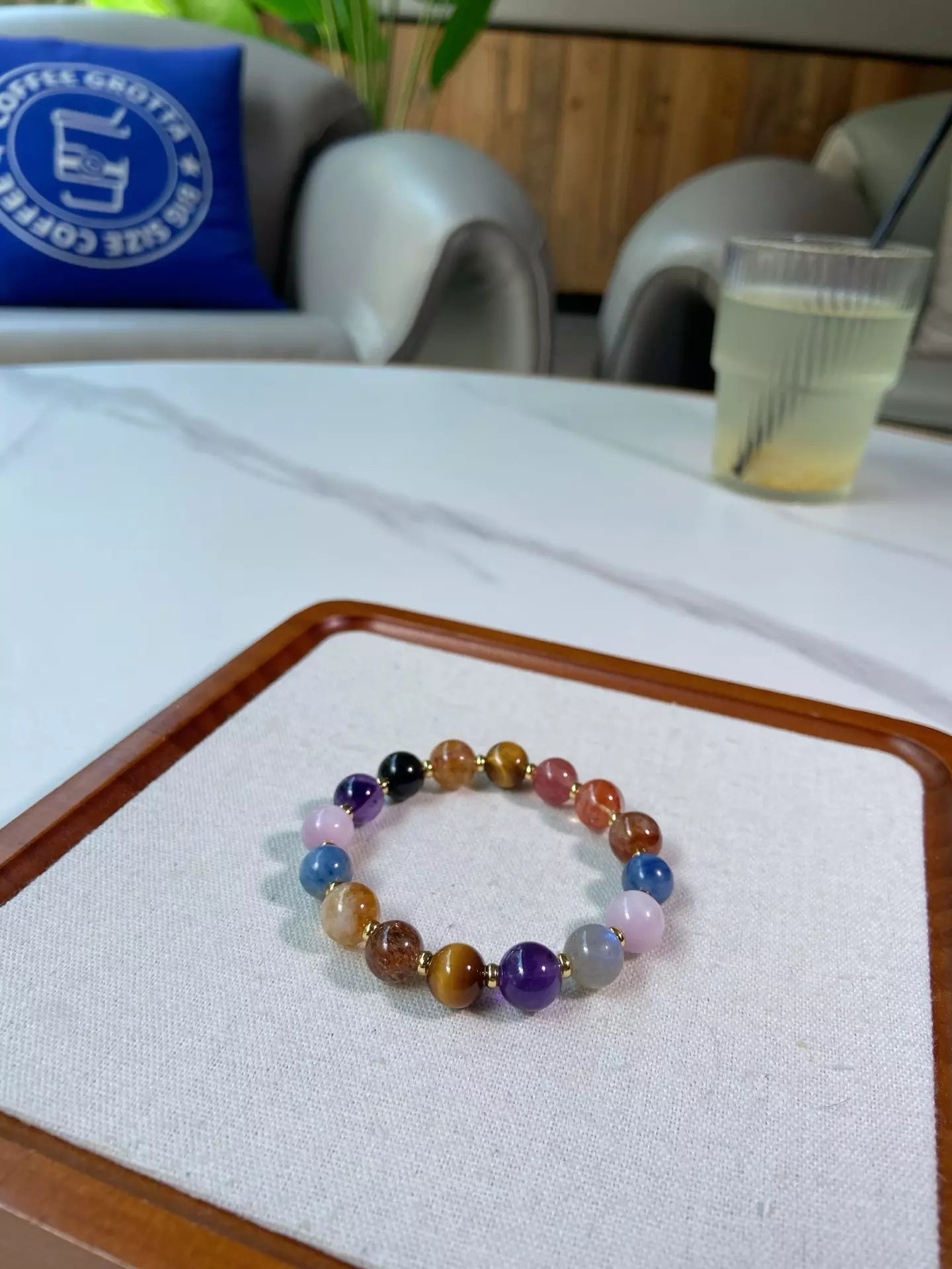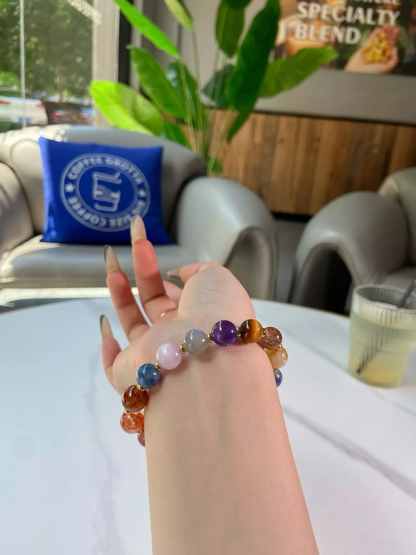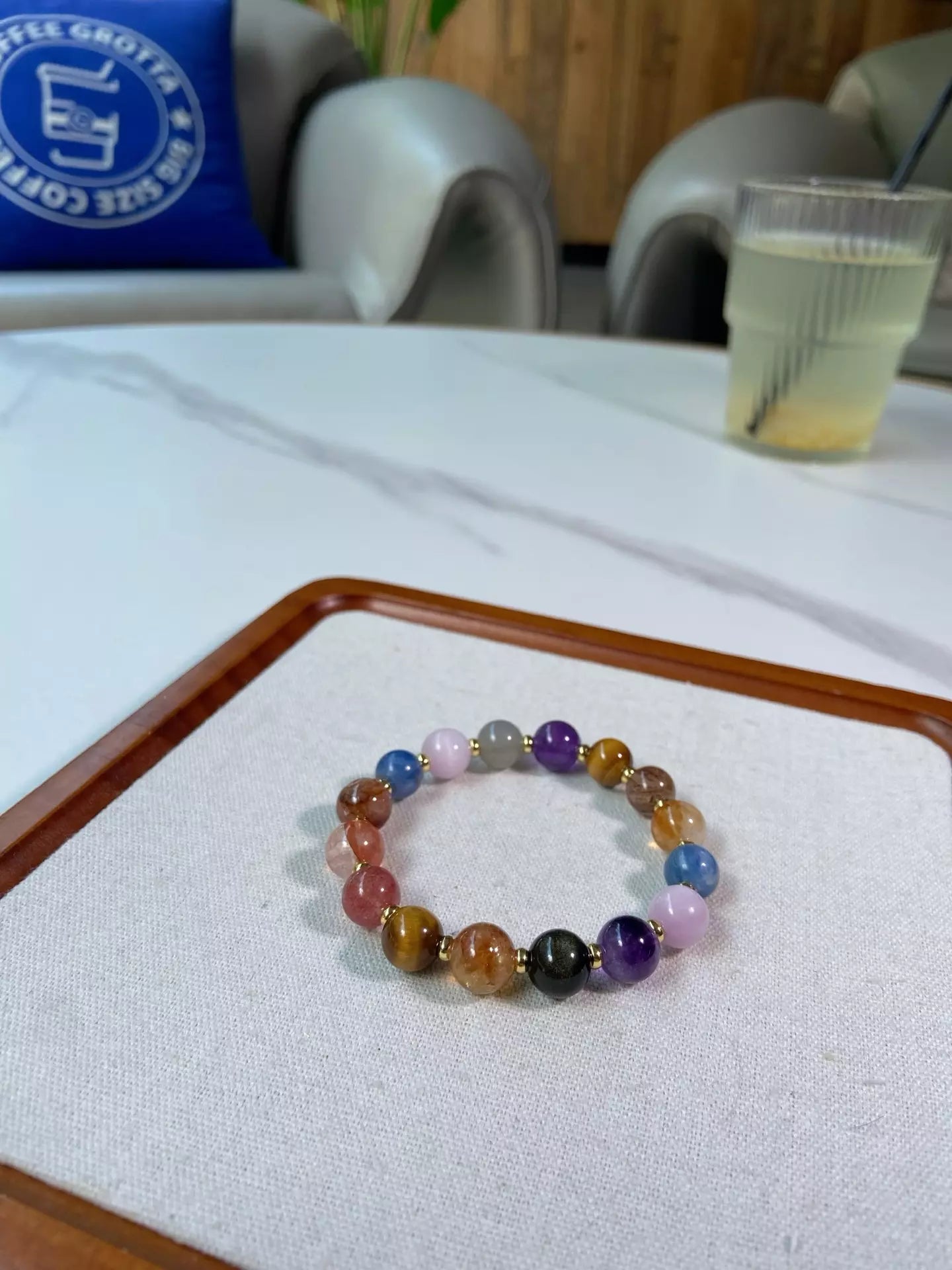 Immerse in the dazzling, blessed energy of this bracelet💎✨! Yellow Tiger’s Eye & Golden Tower Quartz draw wealth luck💰, Strawberry Quartz ignites sweet romance💞. Amethyst boosts wisdom🔮, Black Gold Super Seven wards off negativity, and Grey Moonstone sharpens intuition. Its vibrant multi-color palette shines like a treasure trove, wrapping you in abundant blessings. Wear daily to embrace fortune, charm and all-around positive vibes💫!
