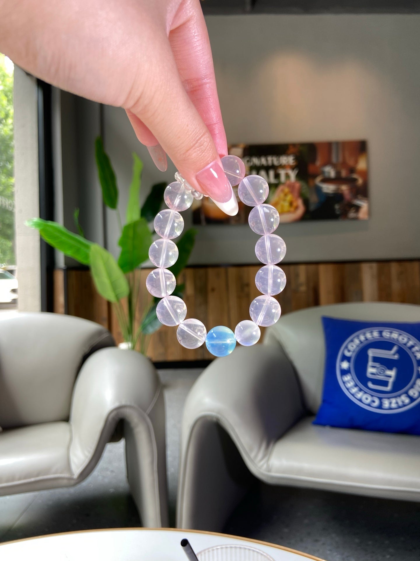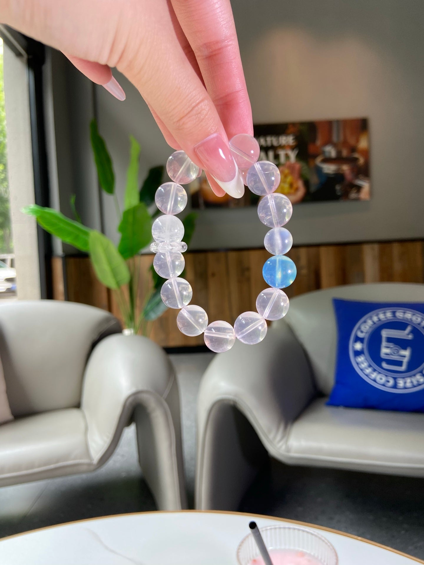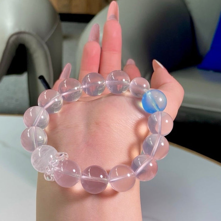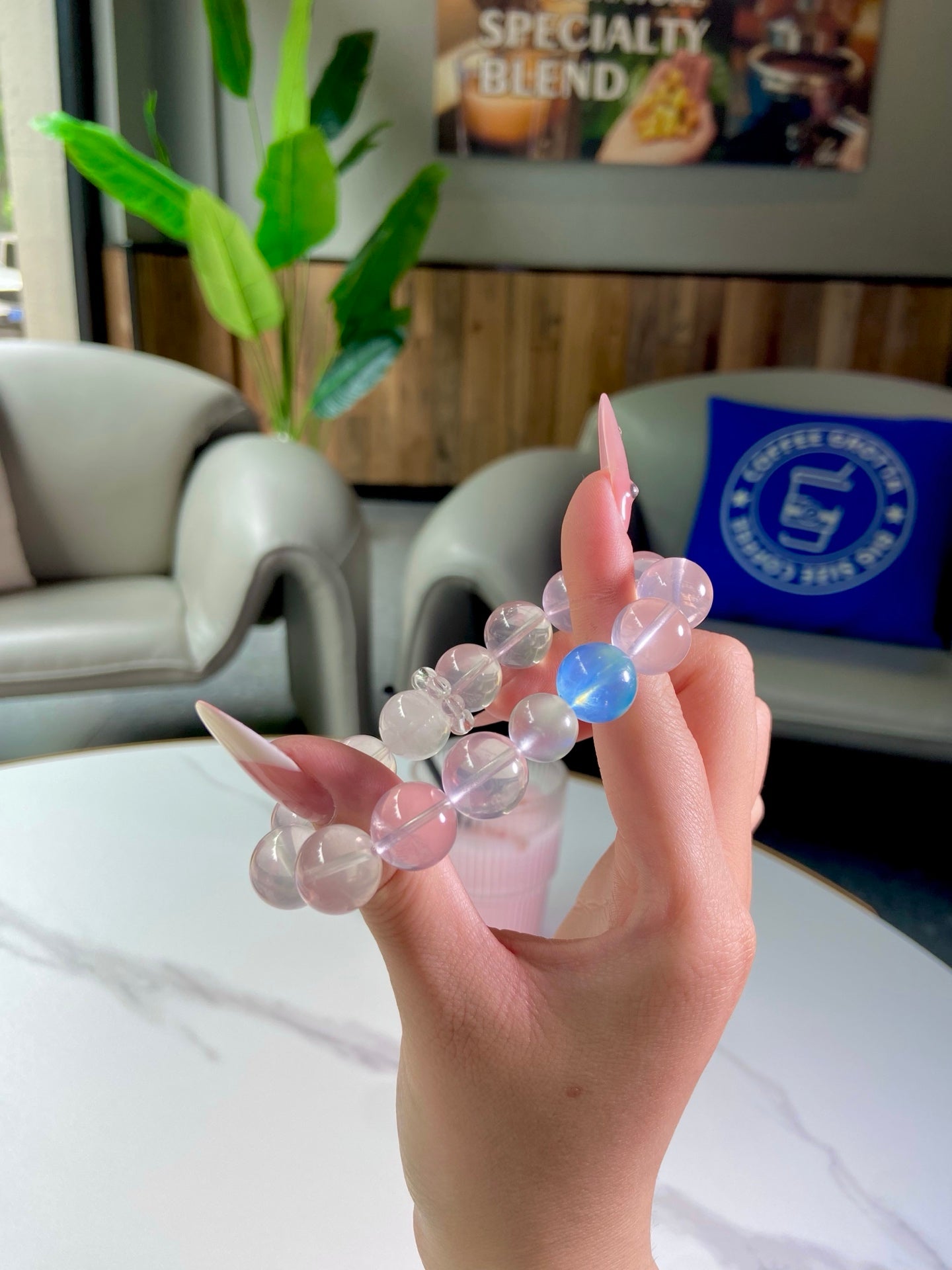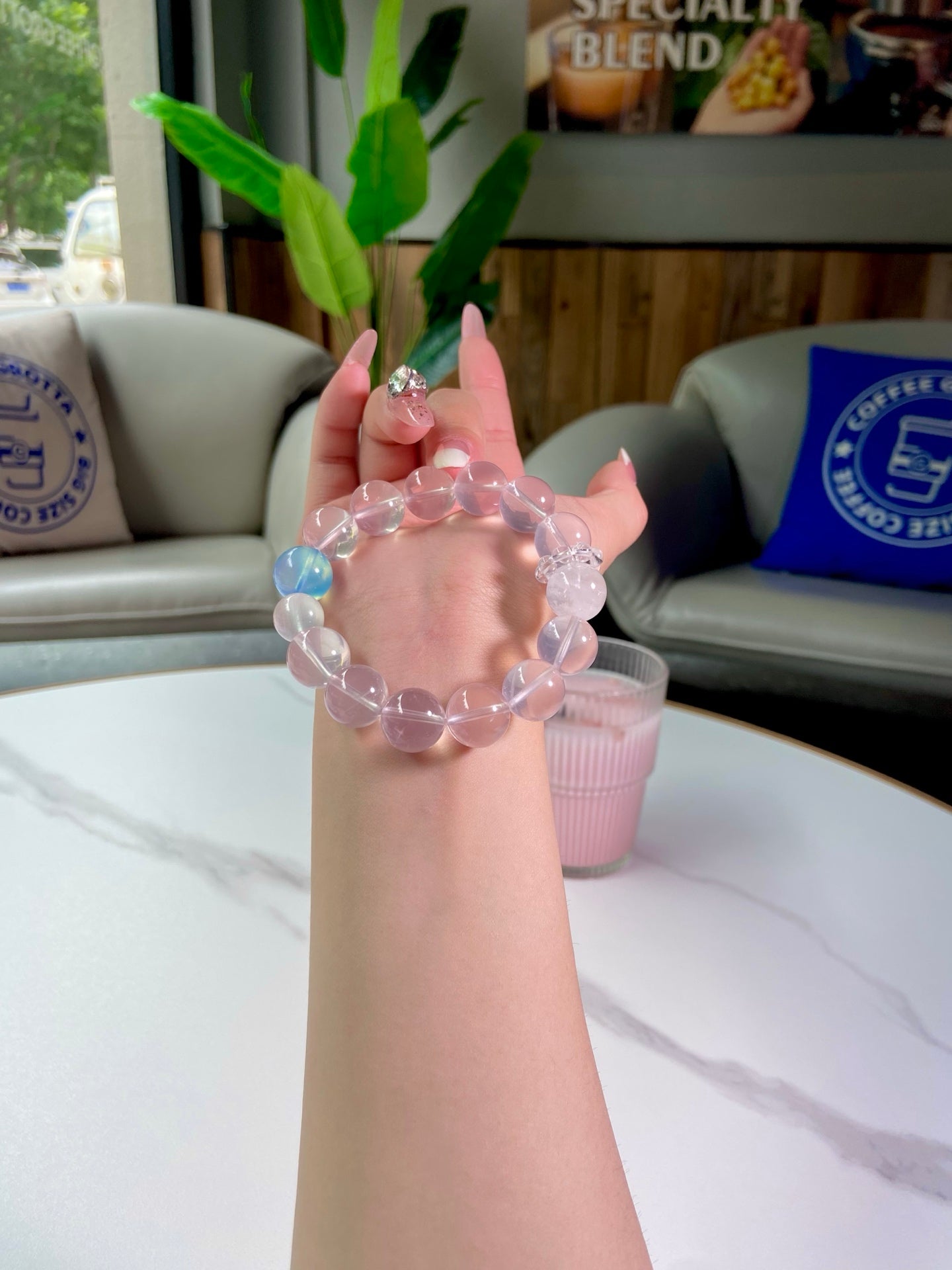 Indulge in this dreamy piece where sky-blue aquamarine, blushing rose quartz, and milky white phantom crystal intertwine! Aquamarine guards your safety, eases discomfort and fuels your confidence, while rose quartz wraps you in warm love and self-kindness. White phantom crystal adds pure vibes, with soft light pink, milky white and sky blue hues shining like a starry night over the ocean. It’s a wearable romance that heals your heart and lights up your days!