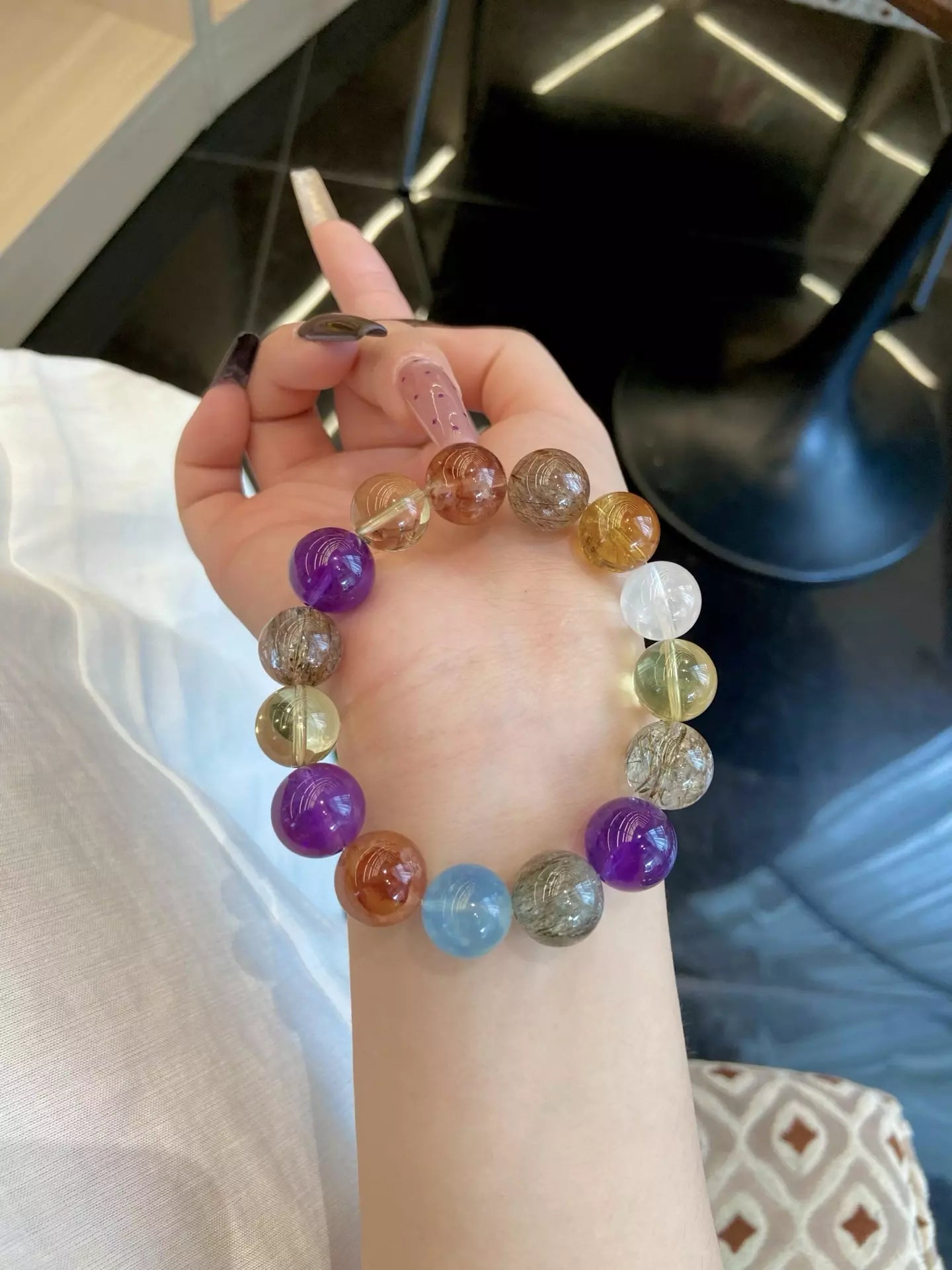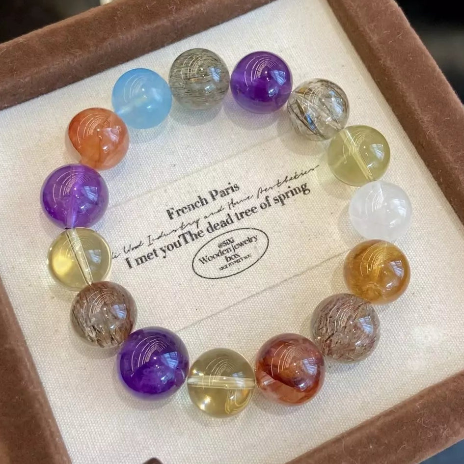 Ignite dynamic crystal energy💥🔥! Black Gold Super Seven fuels confidence💪, Red Rutilated Quartz warms relationships🤝, Amethyst calms the mind🔮 for sharper thinking. Citrine & Yellow Tower Quartz nourish the body🌿, aiding trace element absorption, while Aquamarine brings serenity😌 and White Phantom Quartz purifies vibes🧹. This vibrant multicolor blend merges power & balance—wear daily to glow with focus, confidence, and harmonious connections that light up every moment🌟!