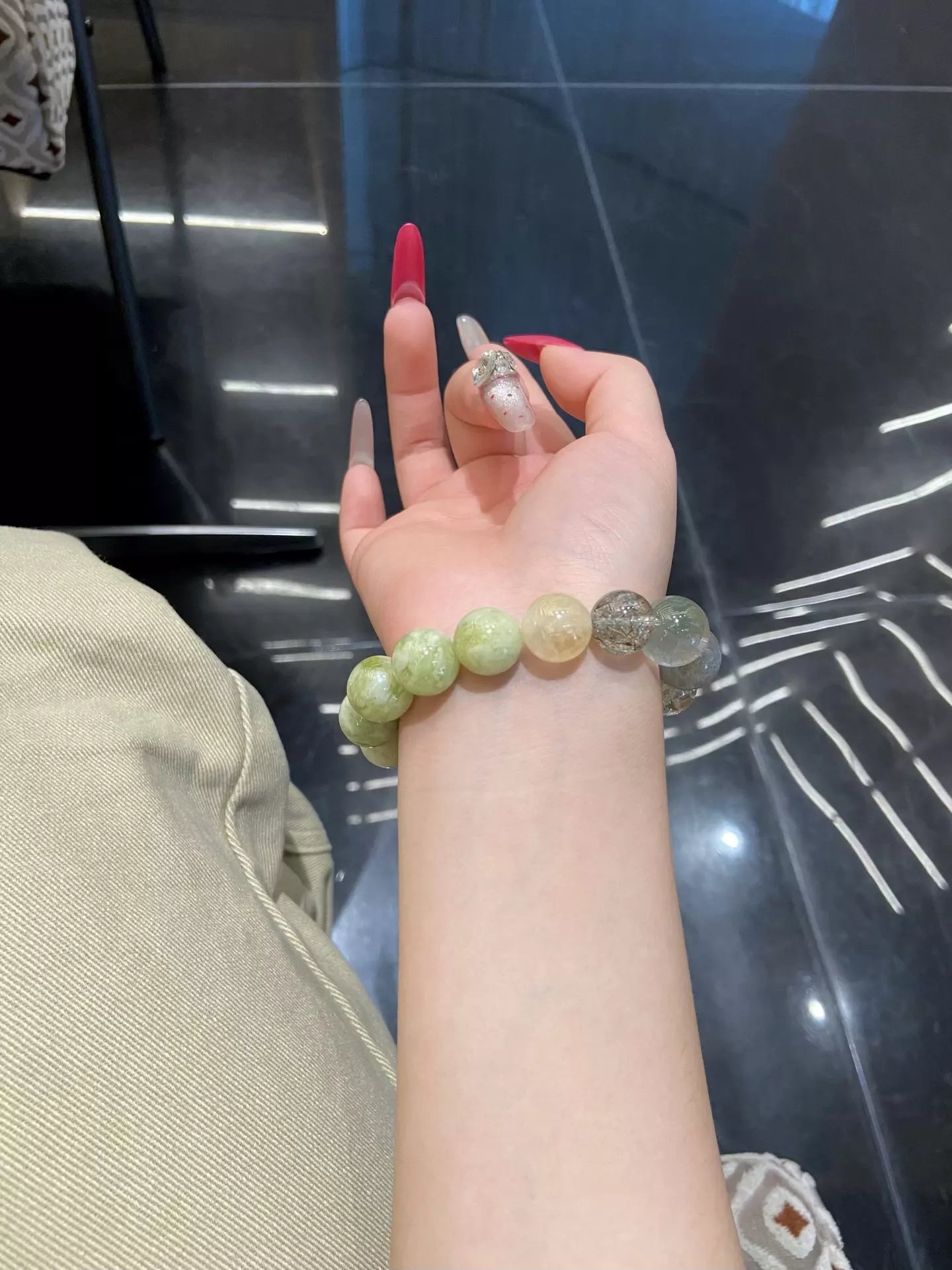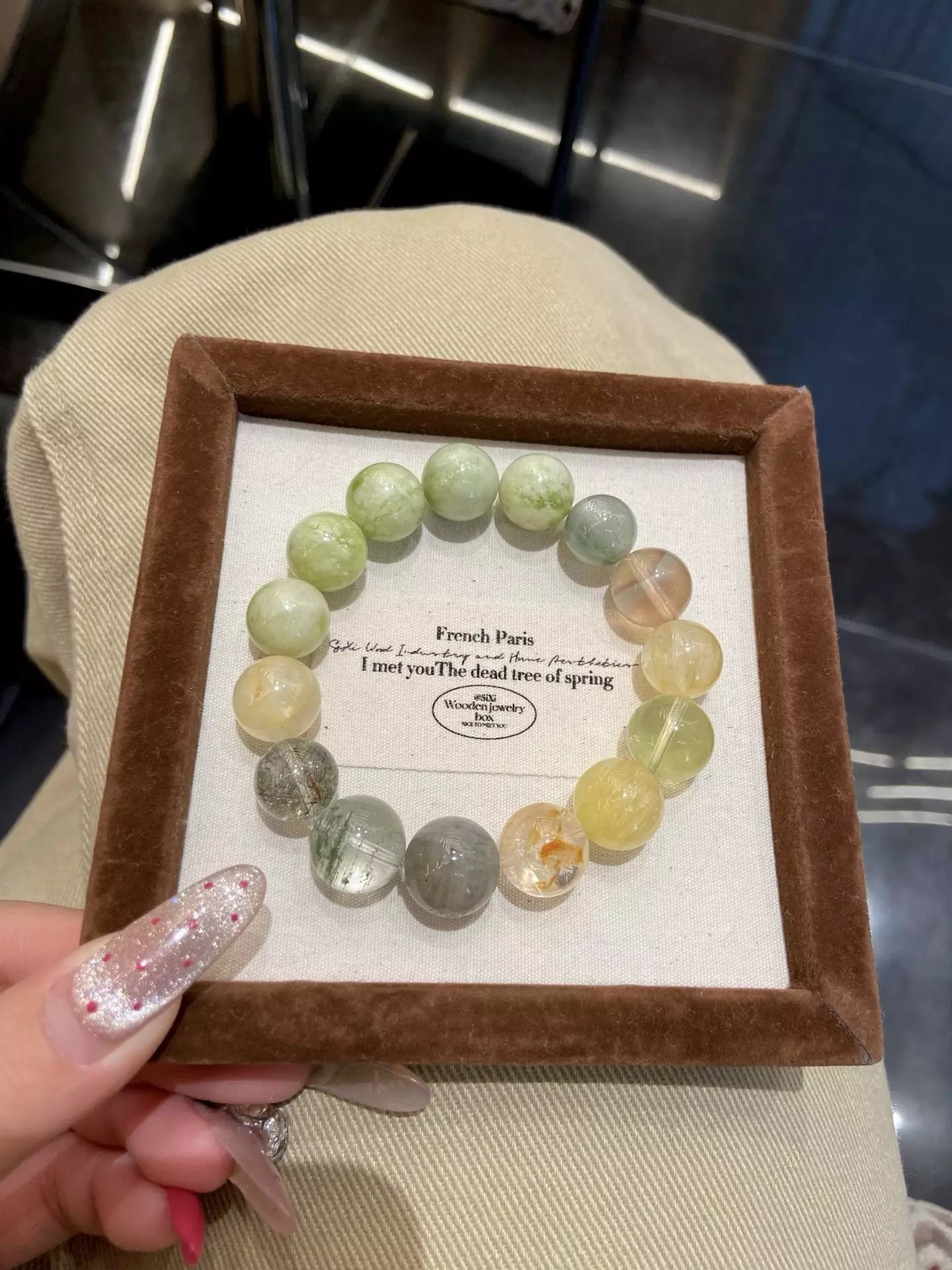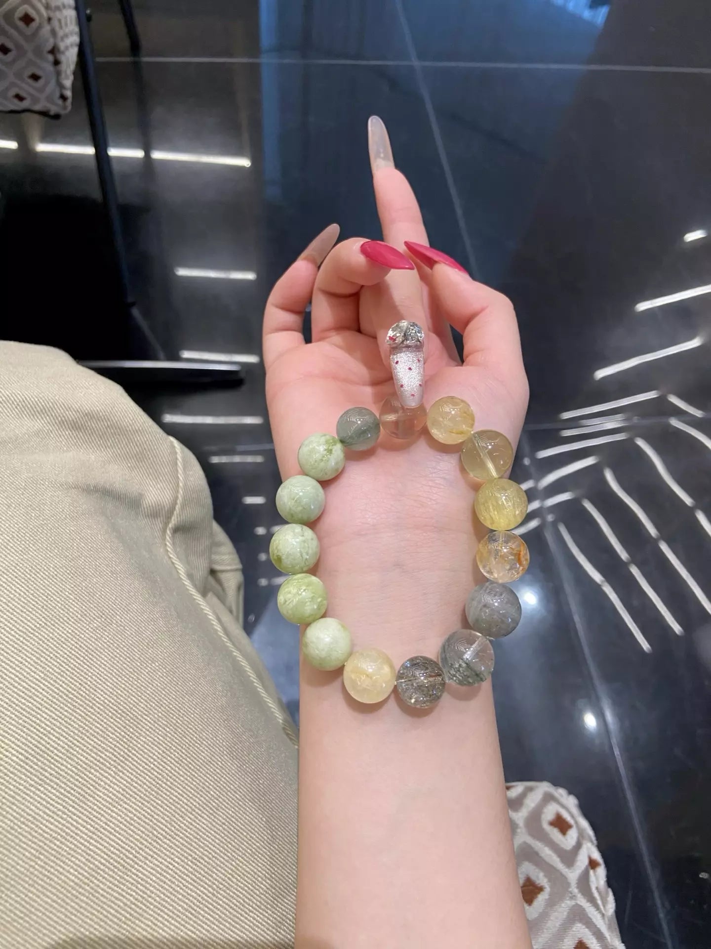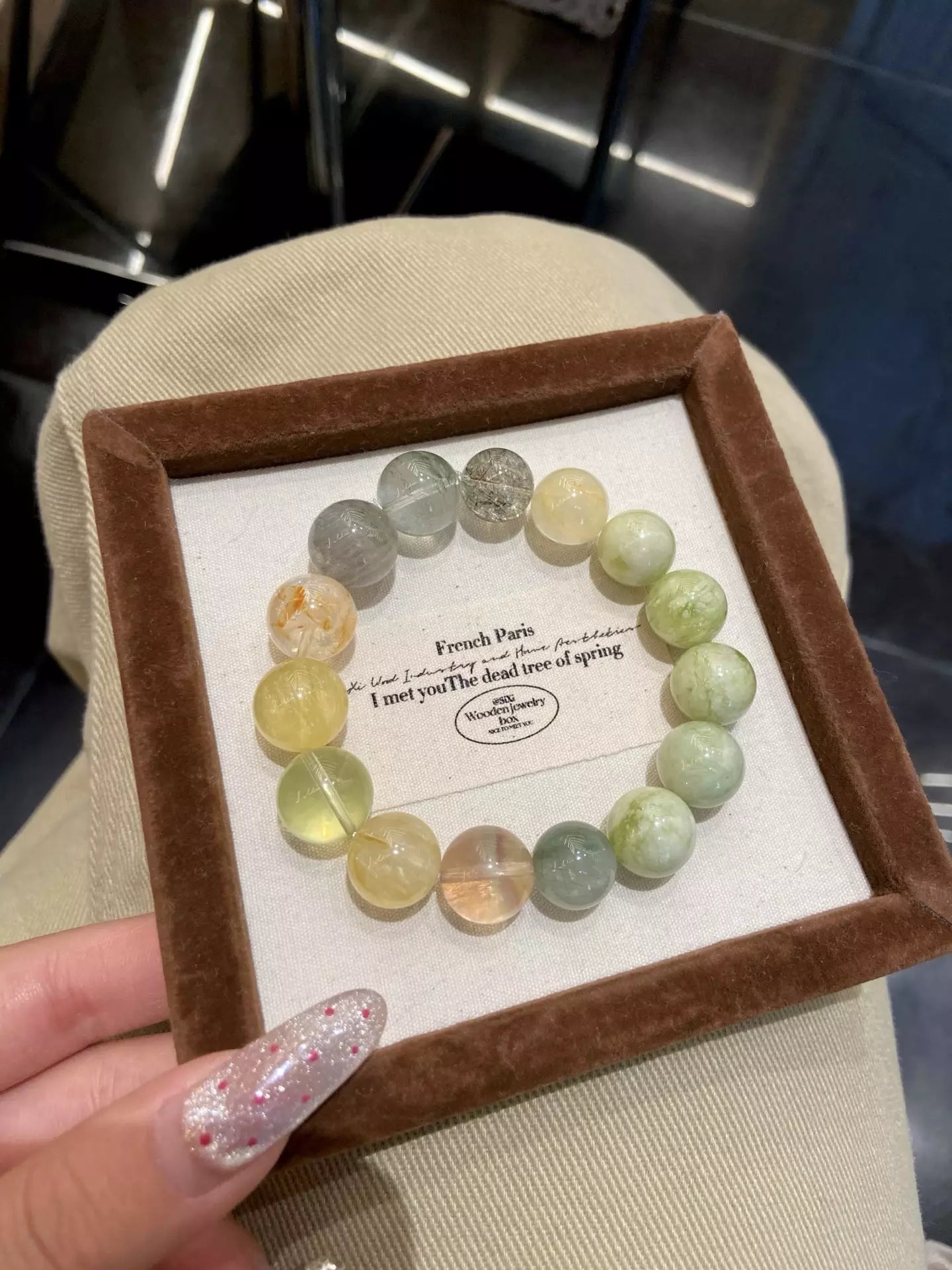 Experience the bold fusion of fire and earth🌋🌿! Green Phantom Quartz + Green Rutilated Quartz boost blood flow🩸, while Citrine + Yellow Rutilated Quartz ignite warm vitality. Black Gold Super Seven purifies negative energy🧹, Gray Moonstone calms your mind😌, and Rainbow Fluorite regulates bodily functions🧬. Blending green, yellow, black, gray and transparent hues, it glows like mossy tundra kissed by lava—grounding, revitalizing and powerful! Wear daily for holistic wellness✨🔮!