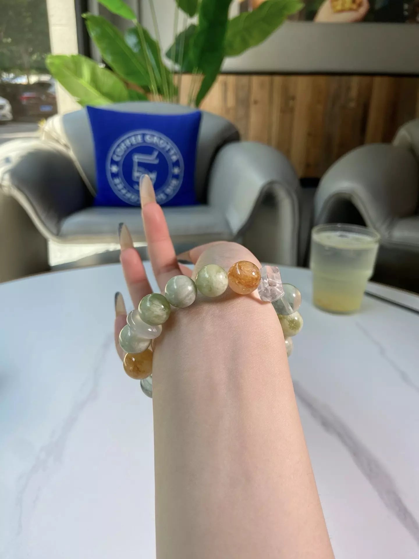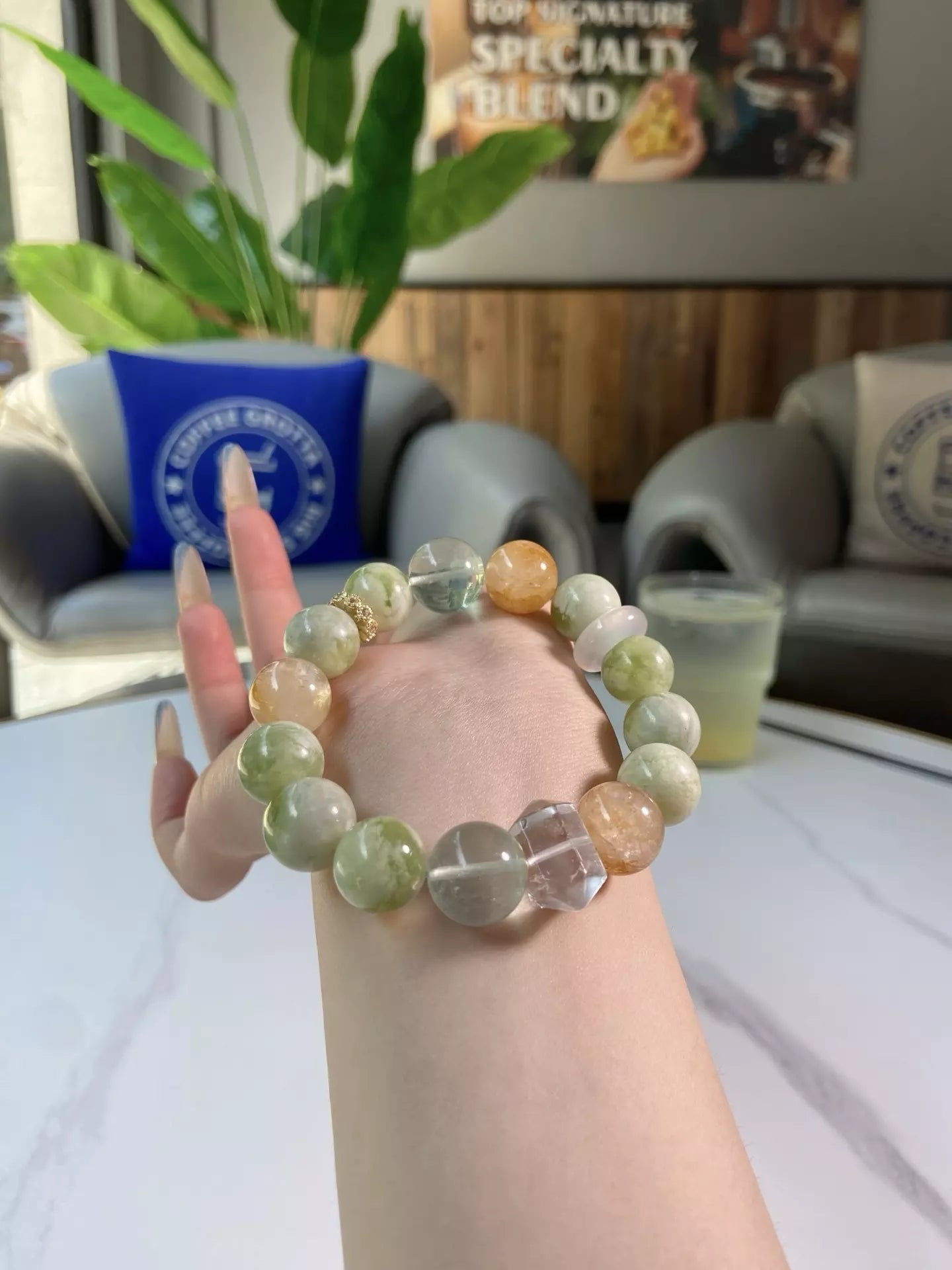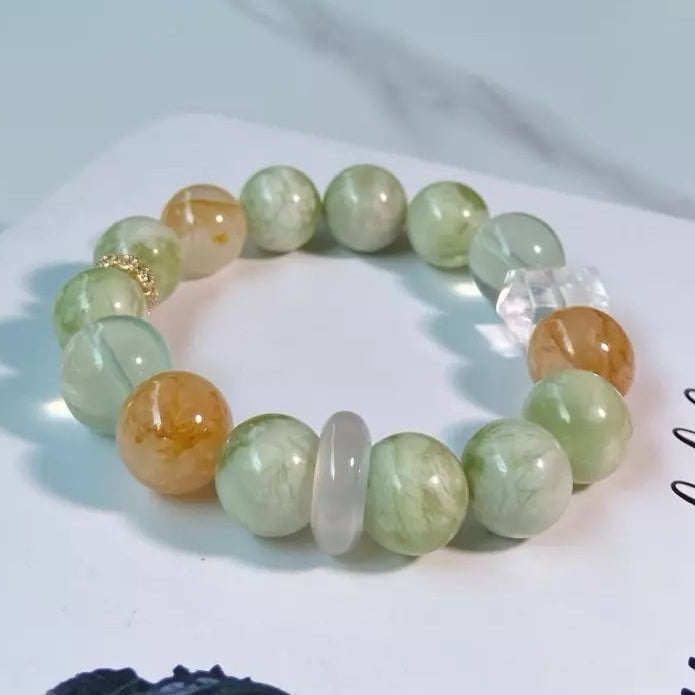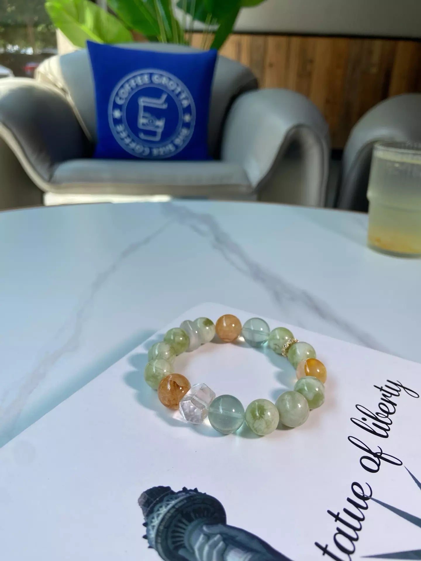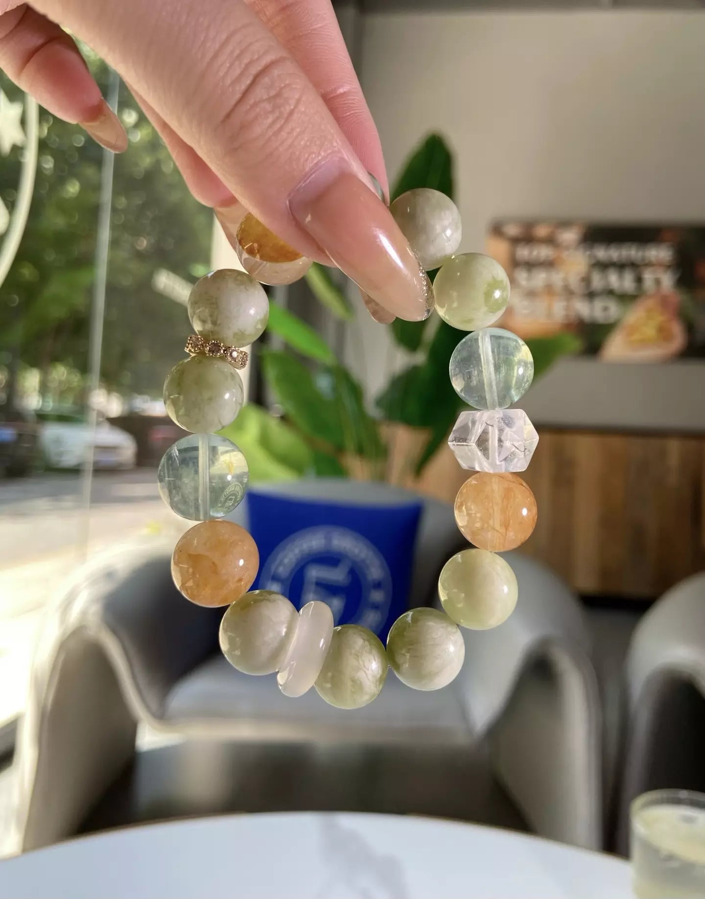 Immerse in the fresh, revitalizing energy of this bracelet💎🍋! Green Grape Milk Cap Crystal & Green Fluorite clear inner heat, detoxify your body and melt away stress smoothly🌿. Yellow Hematoid Quartz boosts blood circulation and regulates physiological functions effectively. Its vibrant green-yellow-clear palette glows like fresh lime mixed with sweet nectar—wear daily to embrace vitality, radiance and relaxed vibes✨!