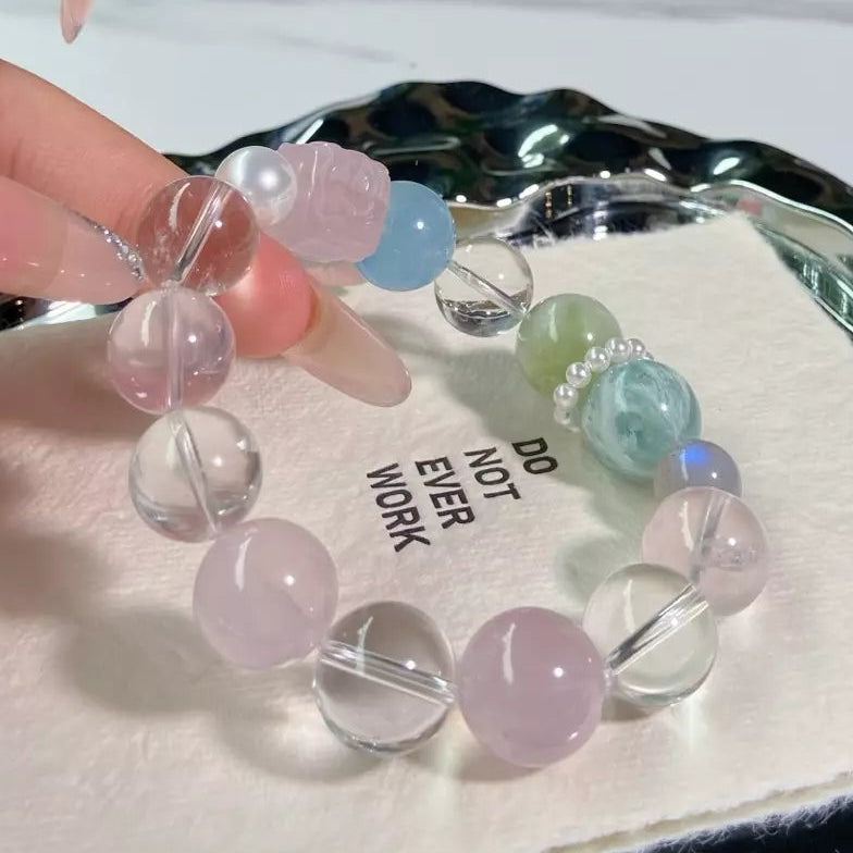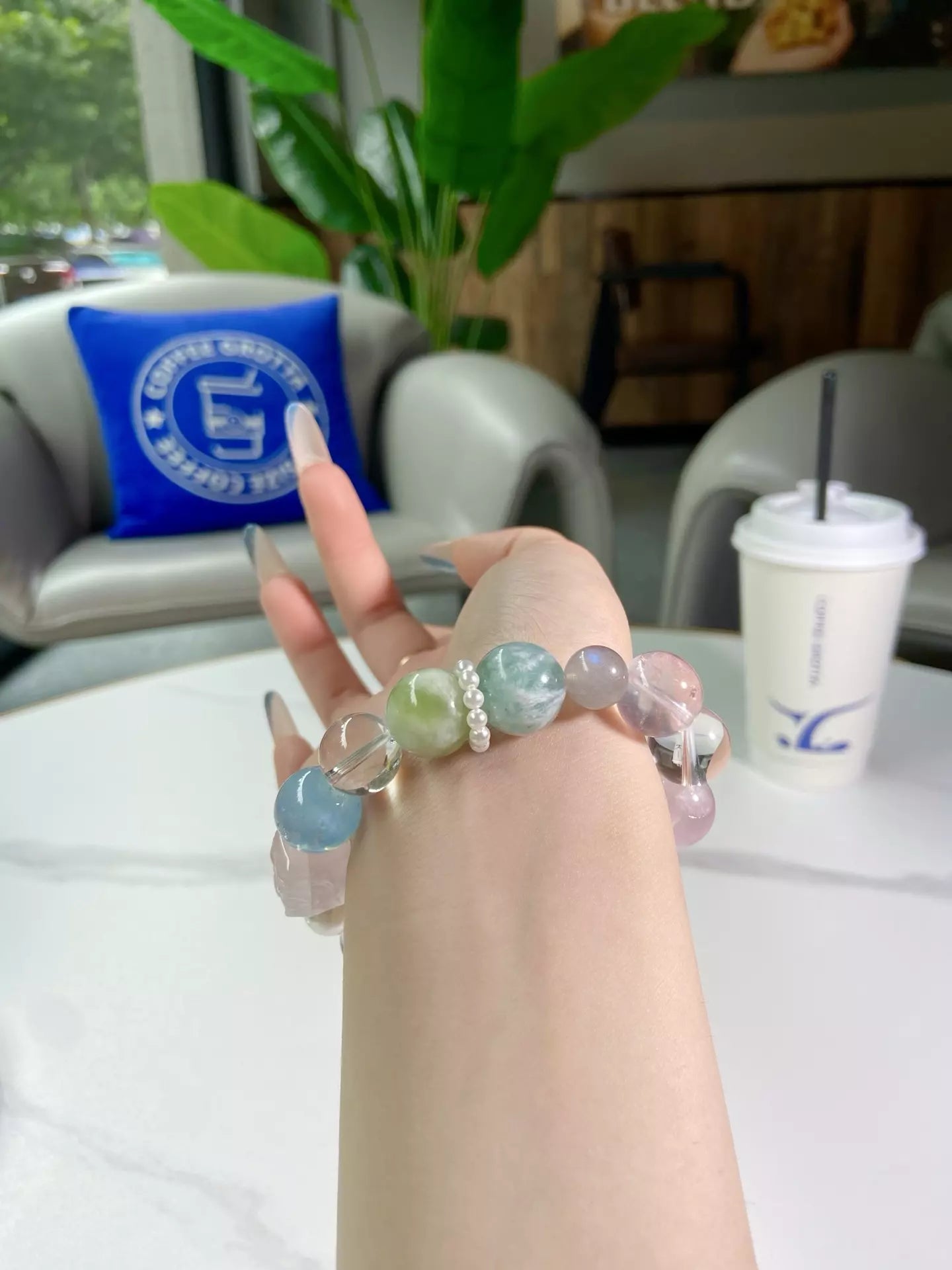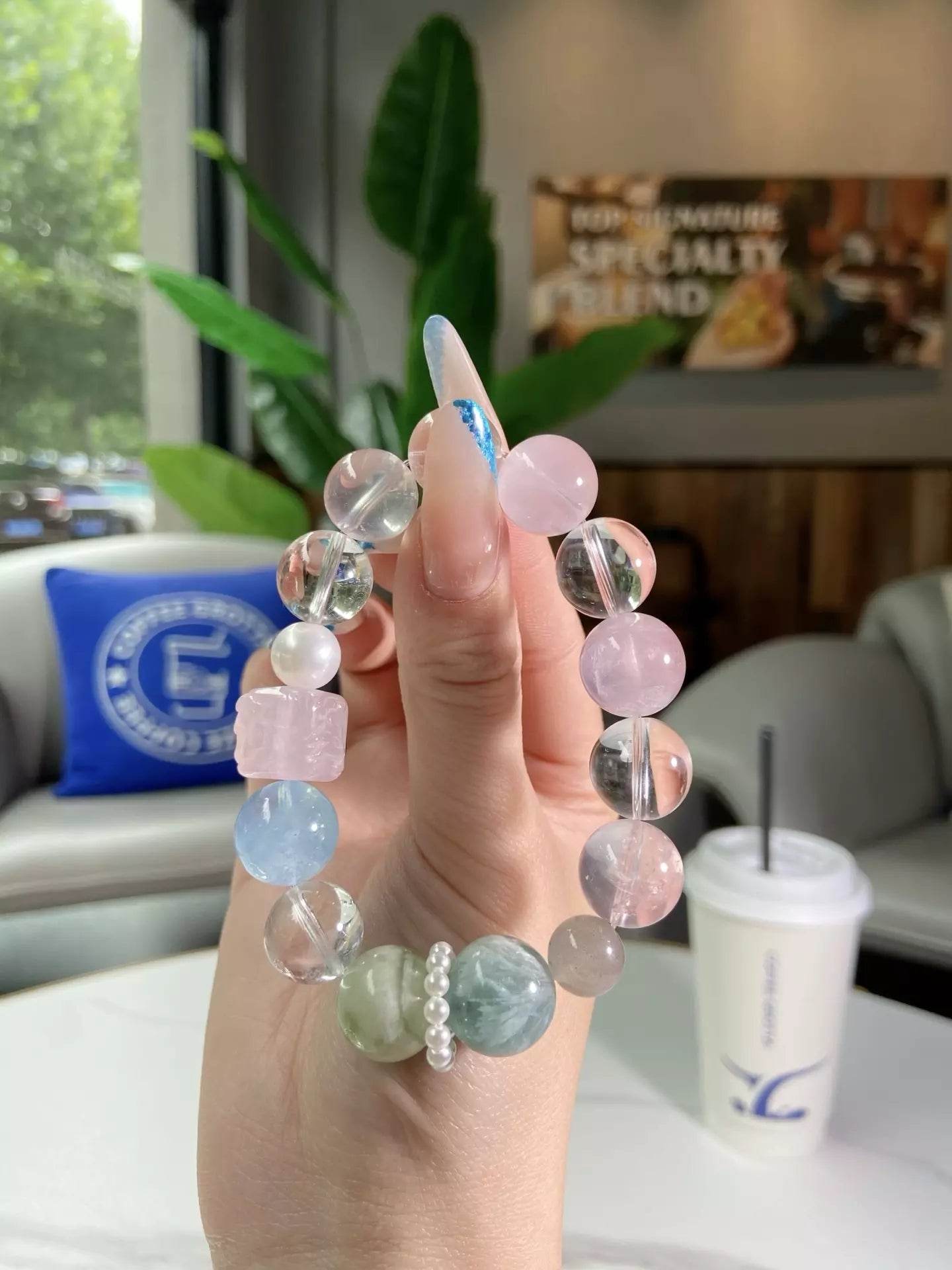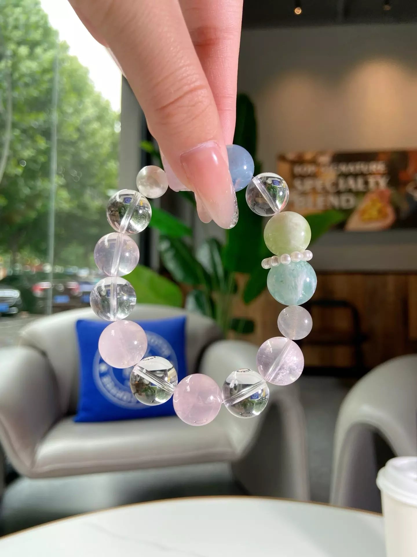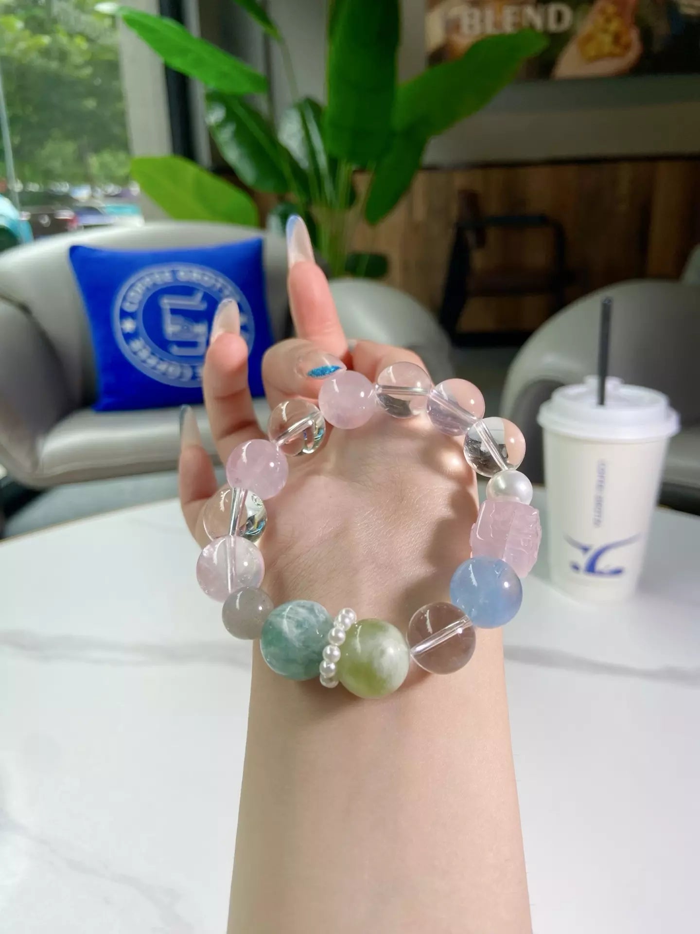 Immerse in the gentle healing energy of this crystal blend💎! Feather Fluorite sharpens focus 🧠 and boosts memory, while Green Grape Cream soothes your senses. Clear Quartz wipes out bad vibes 🧹, Aquamarine calms mood swings 🌊, Rose Quartz draws warm connections 🤝, and Grey Moonstone brings inner peace. Its rainbow hues shine bright—dreamy and vibrant. Wear daily to stay focused ✨, balanced 😌 and surrounded by positive vibes!