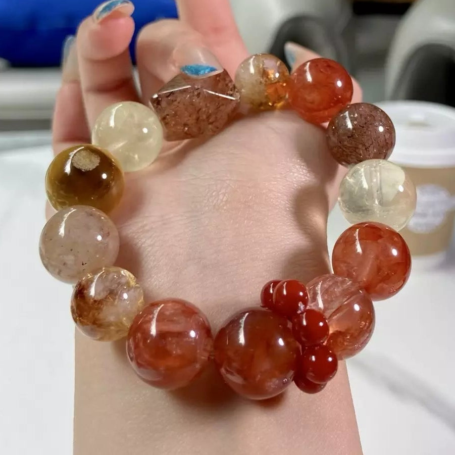 Immerse in the fiery, empowering energy of this crystal medley💎! Yellow Tower Quartz and Citrine supercharge confidence 🌟, while Tiger Eye sharpens focus to upgrade your thinking skills 🧠. Red Rutile ignites positive vibes, Black Gold Super Seven adds a touch of mystique, and Layered Phantom helps your body absorb beneficial trace elements 🫶. Its red-yellow-black gold palette blazes like molten gold—bold, radiant and uplifting. Wear daily to stay poised 😌, energized ✨ and socially charming!