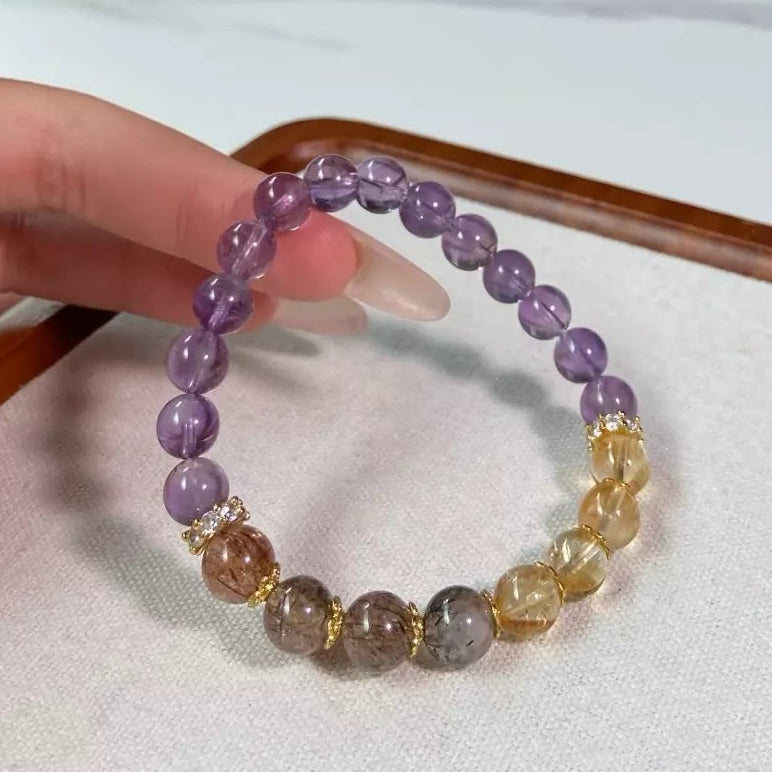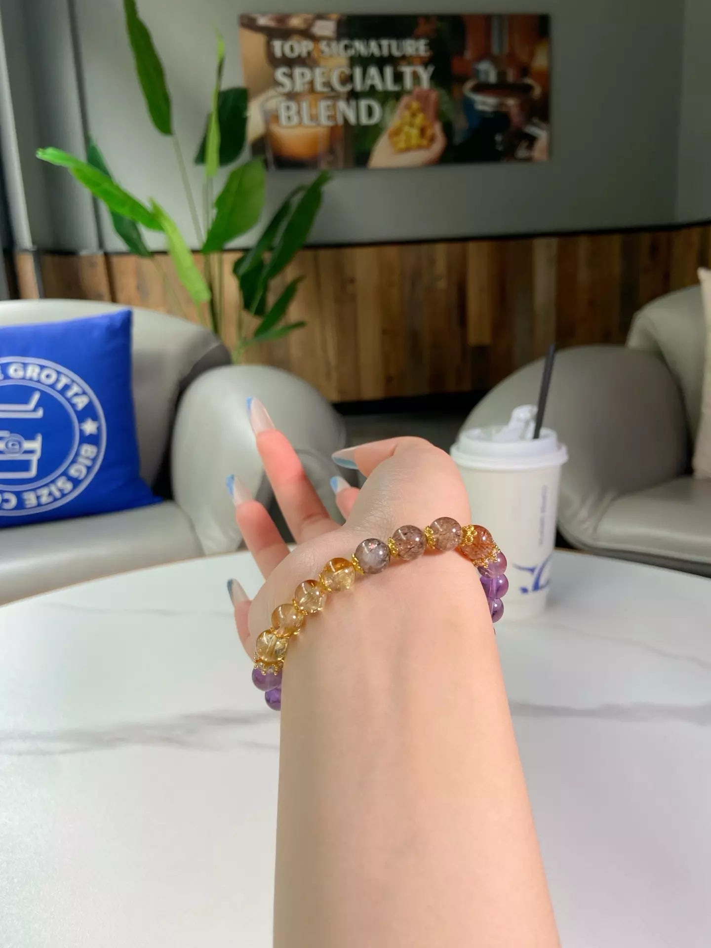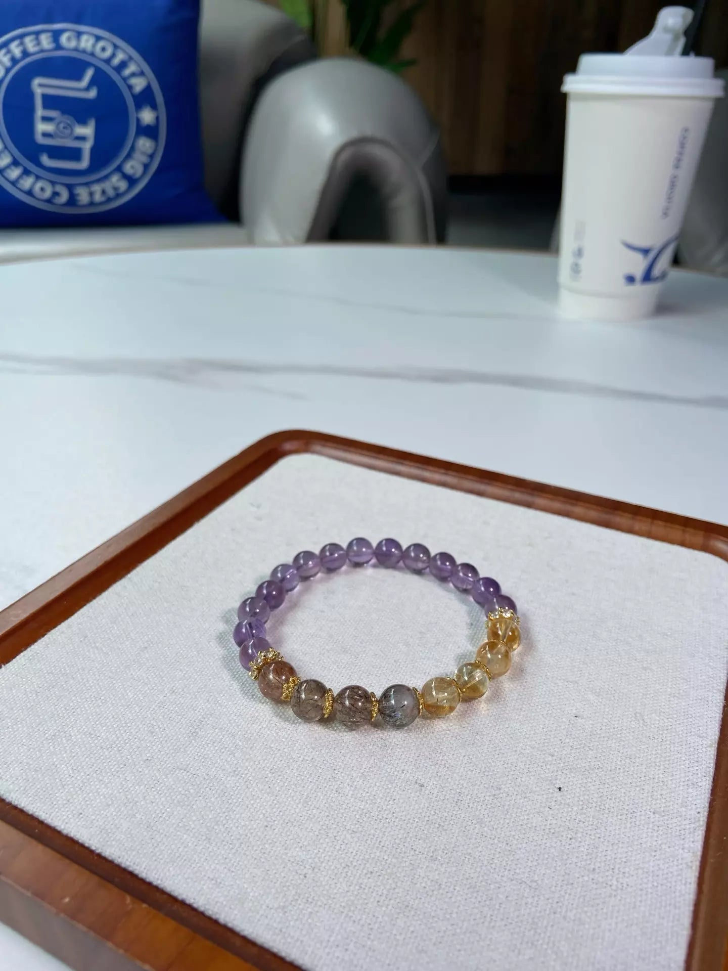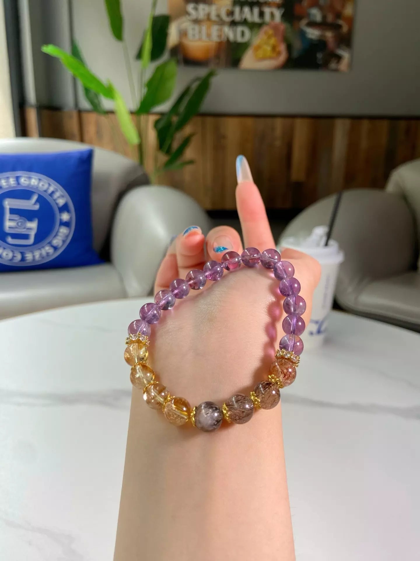 Meanings: Amethyst: Symbol of happiness & peace, symbol of wisdom & courage, guardian of love; Black Gold Super Seven: Soothe mood, enhance vitality, improve sleep quality, relieve pain