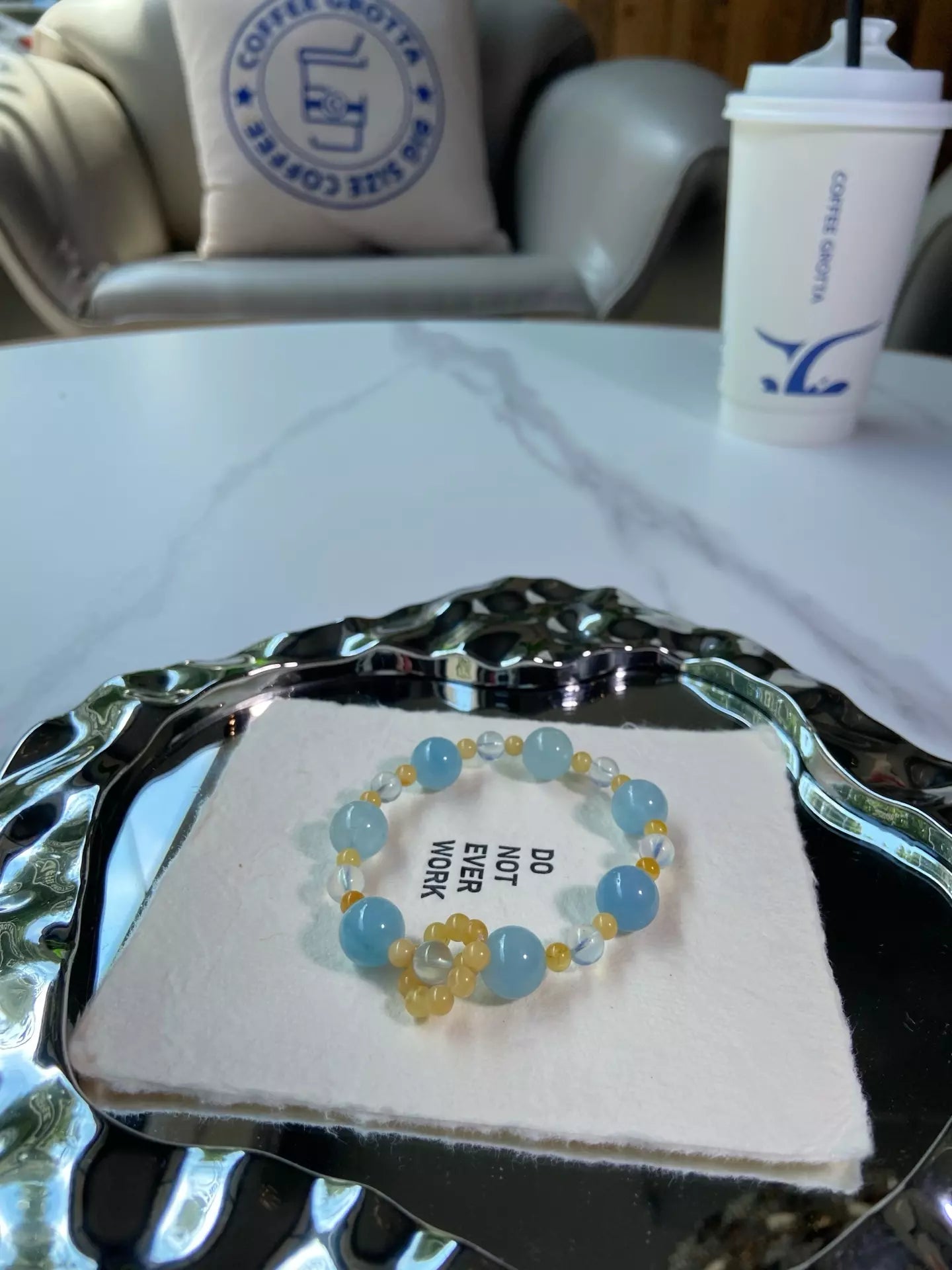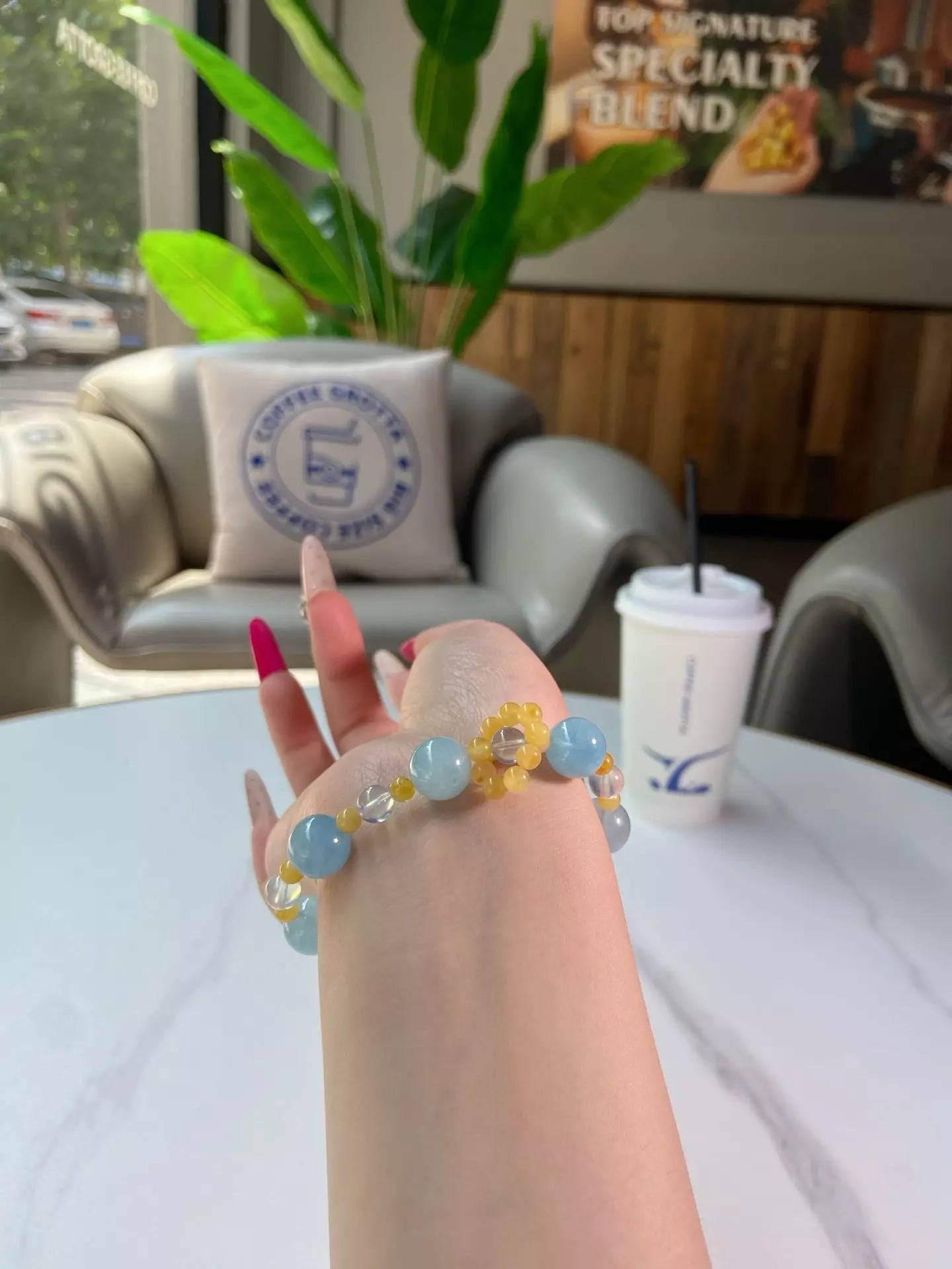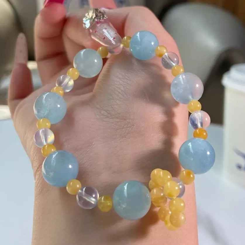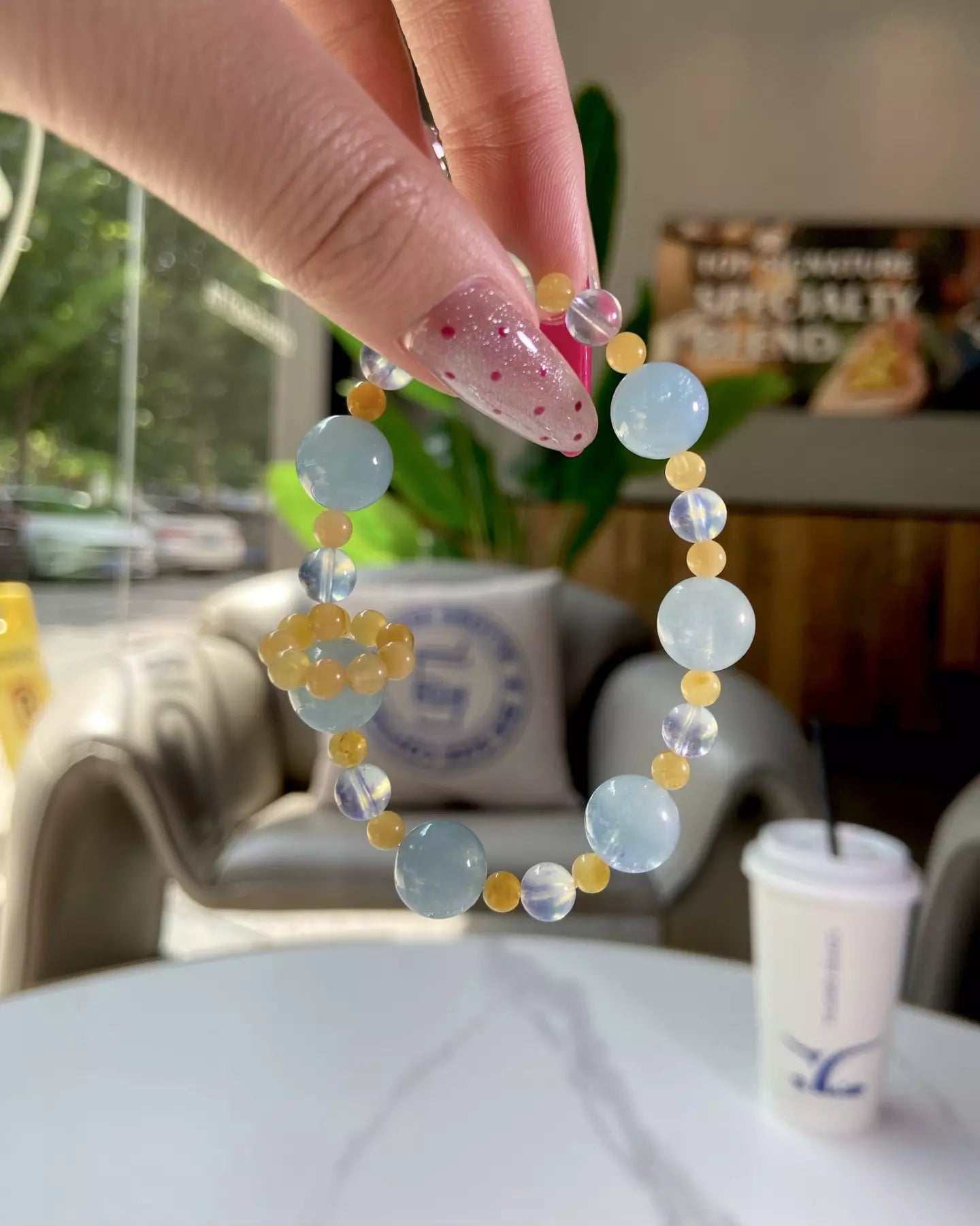 Immerse in the gentle, comforting energy of this bracelet💎🌊! Aquamarine wraps you in a shield of safety and eases body discomfort smoothly😌. Amber ignites inner confidence and brings warm vibes to your daily life✨. Its fresh blue-yellow-clear palette glows like sunlight over the ocean waves—wear daily to embrace peace, courage and cozy energy💫!