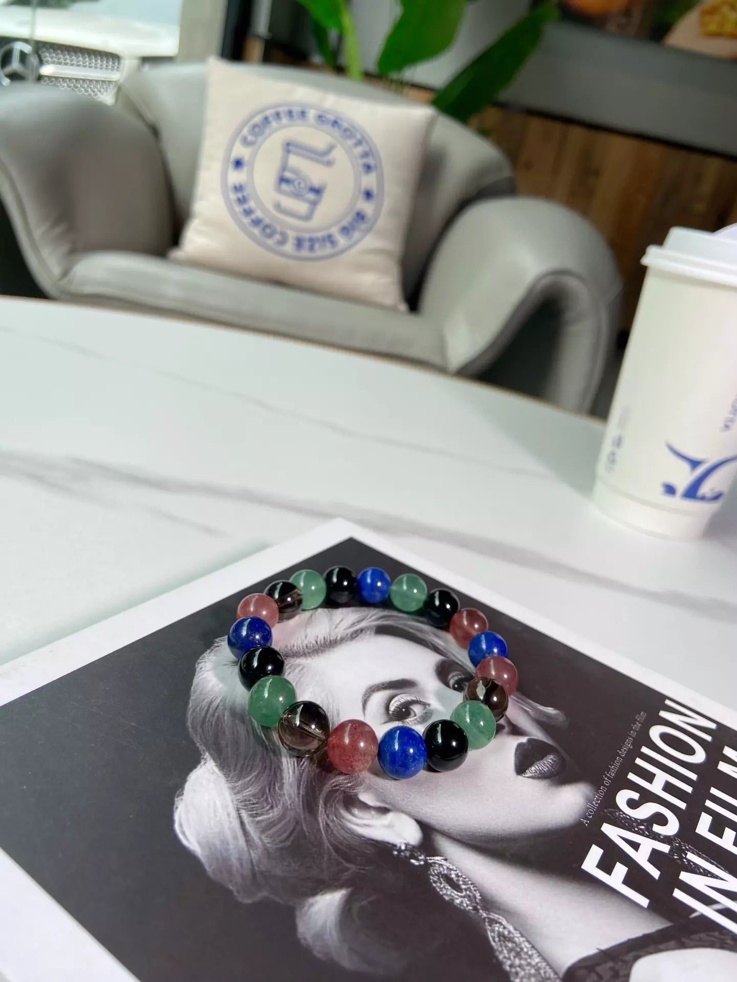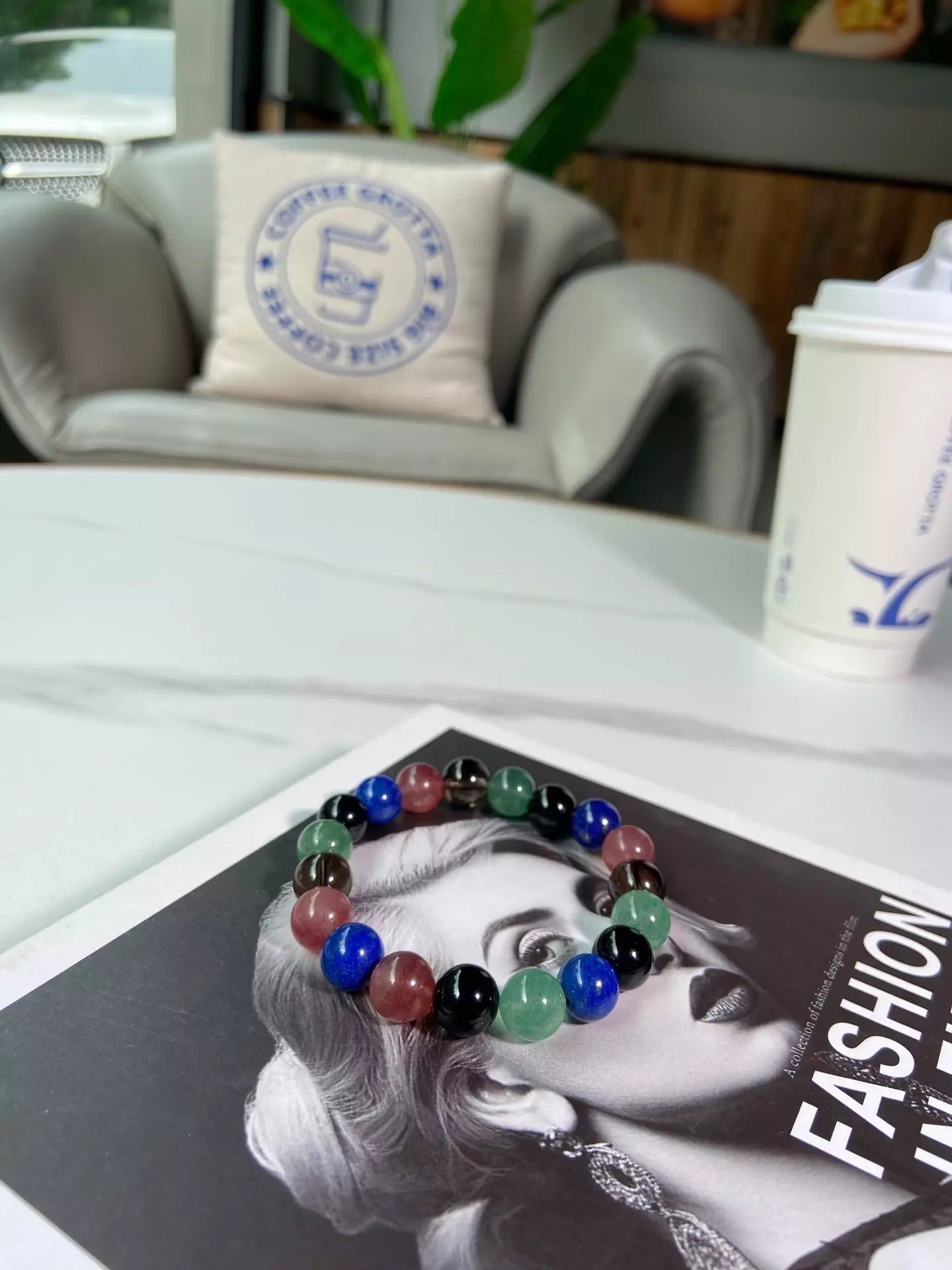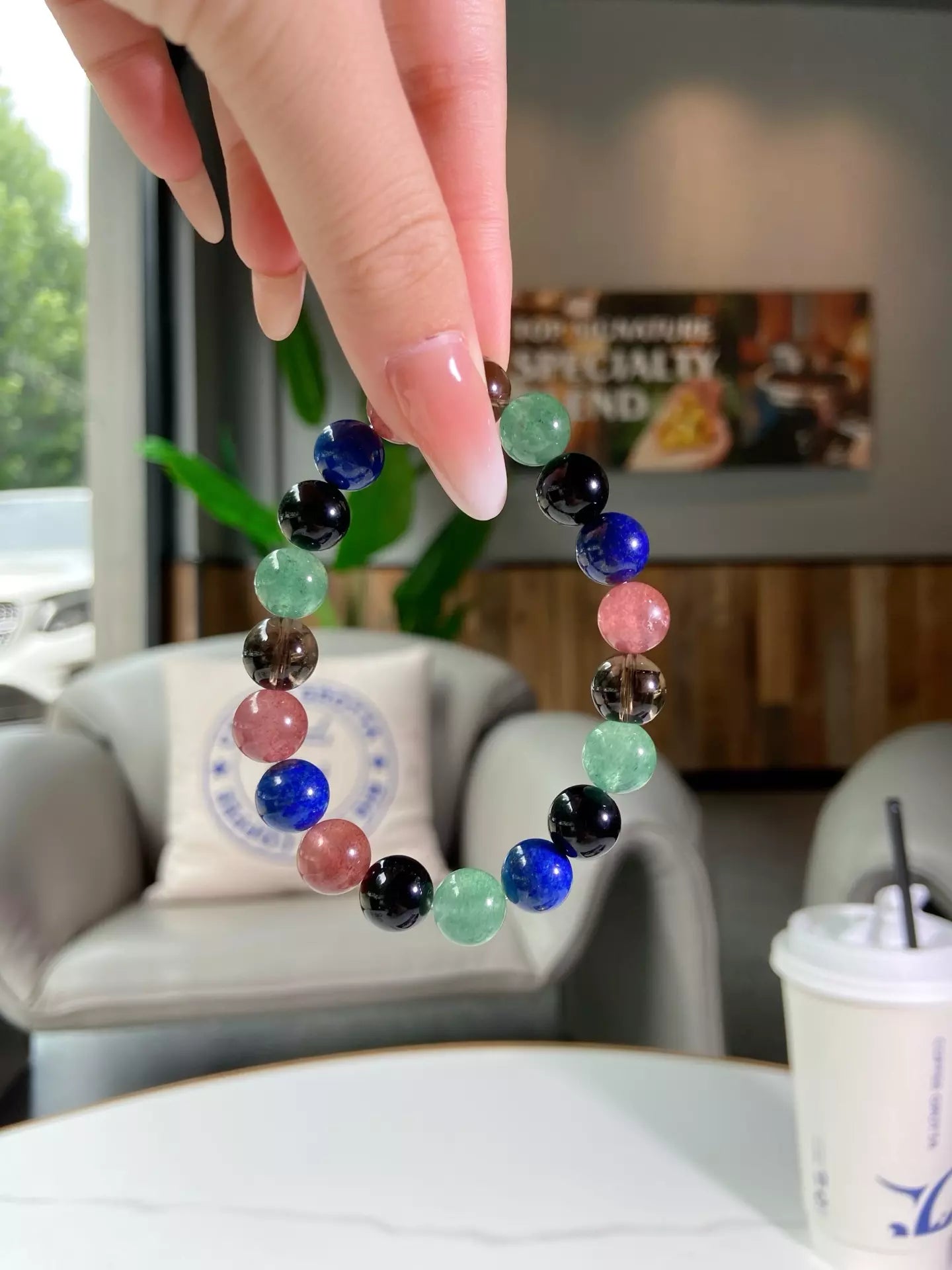 Embrace the nourishing magic of Pink Blush & Green Frost🌸🌿! Strawberry Quartz & Green Strawberry Quartz boost immunity💪 and fight aging with antioxidant power⏳. Smoky Quartz aids digestion🌿 and supports metabolism🔥, while Lapis Lazuli assists in blood pressure regulation🩸. Obsidian shields from negative vibes🛡️, balancing the crystal blend’s energy. The mix of pink, green, blue and black exudes elegant charm—wear daily to nurture your body, feel revitalized, and radiate healthy, glowing vibes that shine from within✨!