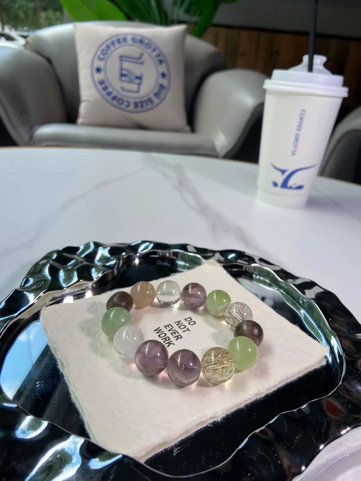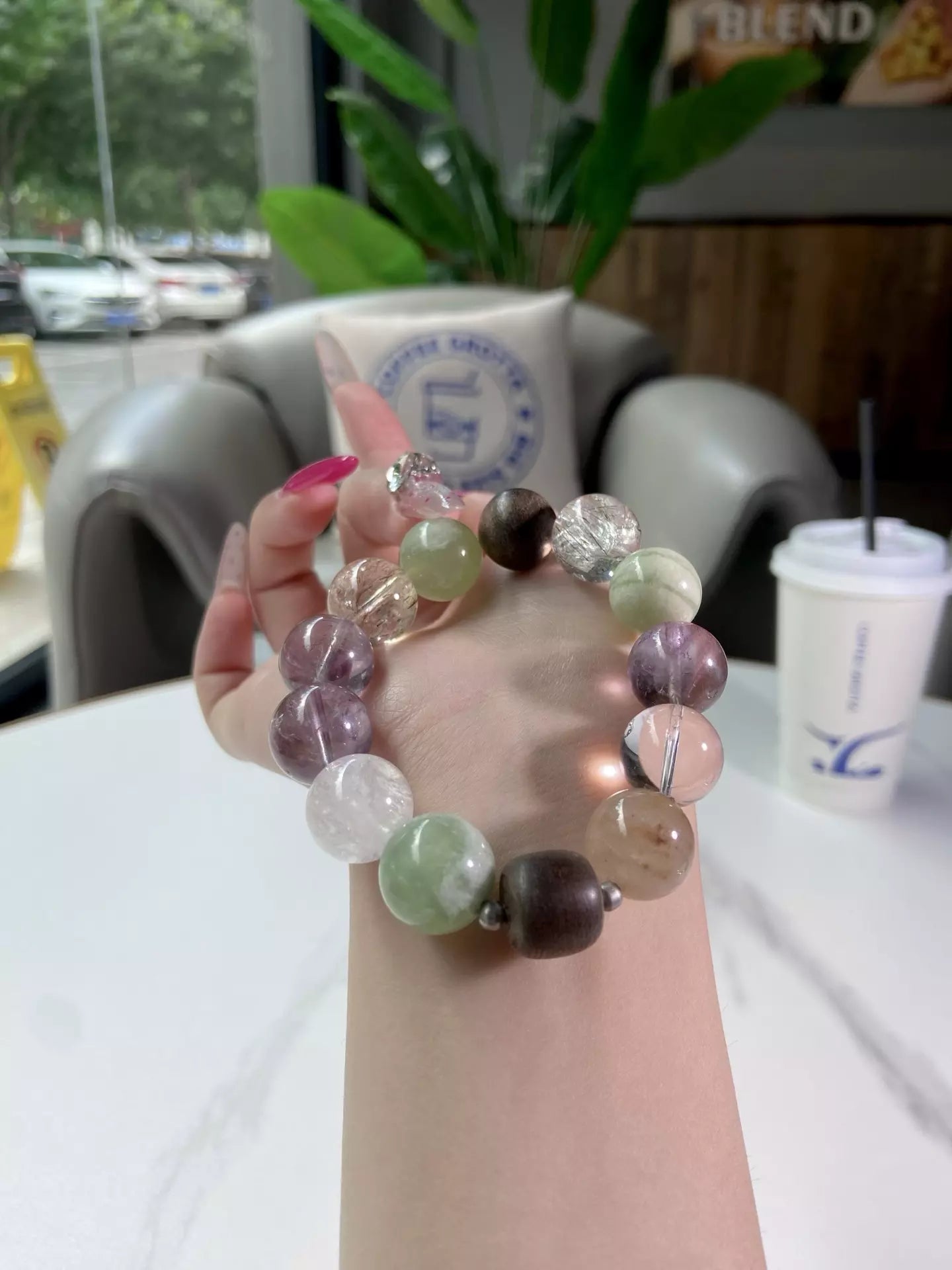 Immerse in the pure, protective energy of this bracelet💎🔮! Amethyst awakens wisdom and courage, while Black Gold Super Seven guards love and wraps you in peace. Green Grape Milk Cap Crystal eases mood swings smoothly; Clear Quartz, White Phantom and Layered Phantom Quartz boost vitality and improve sleep. Its green-black-purple-clear palette glows like a fairy realm—wear daily to embrace tranquility and positive energy✨!
