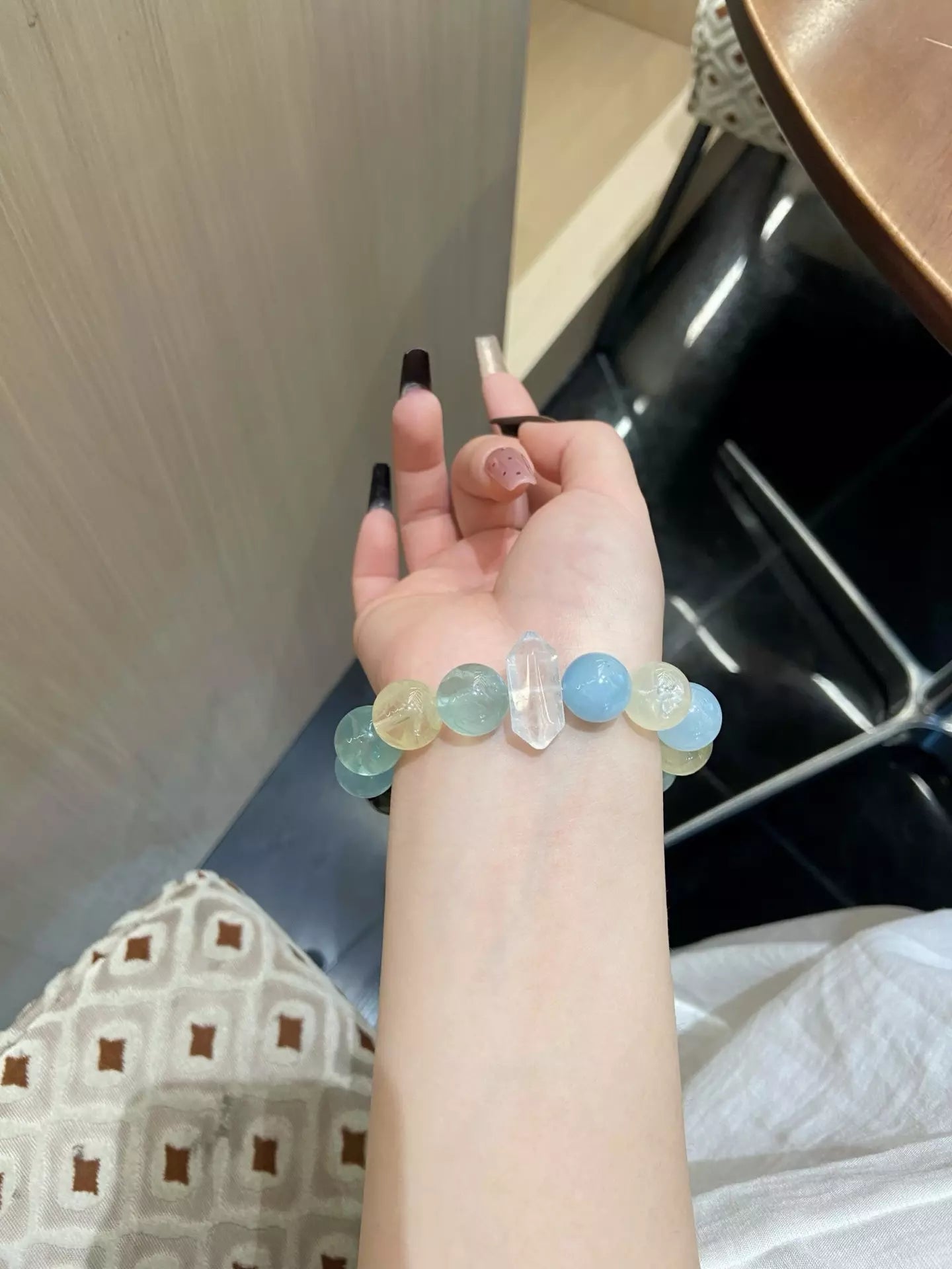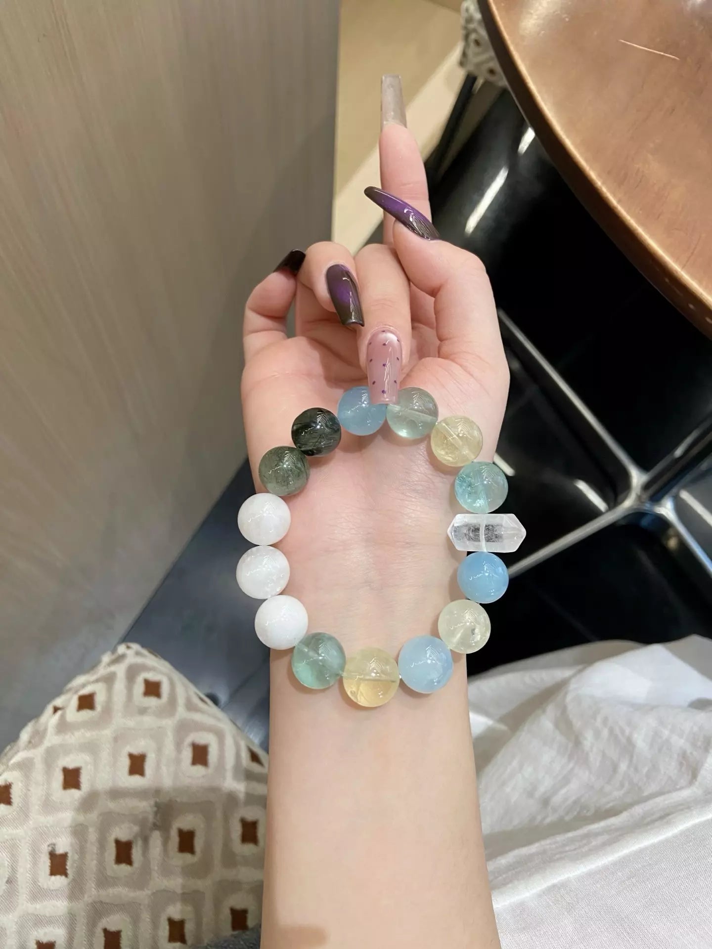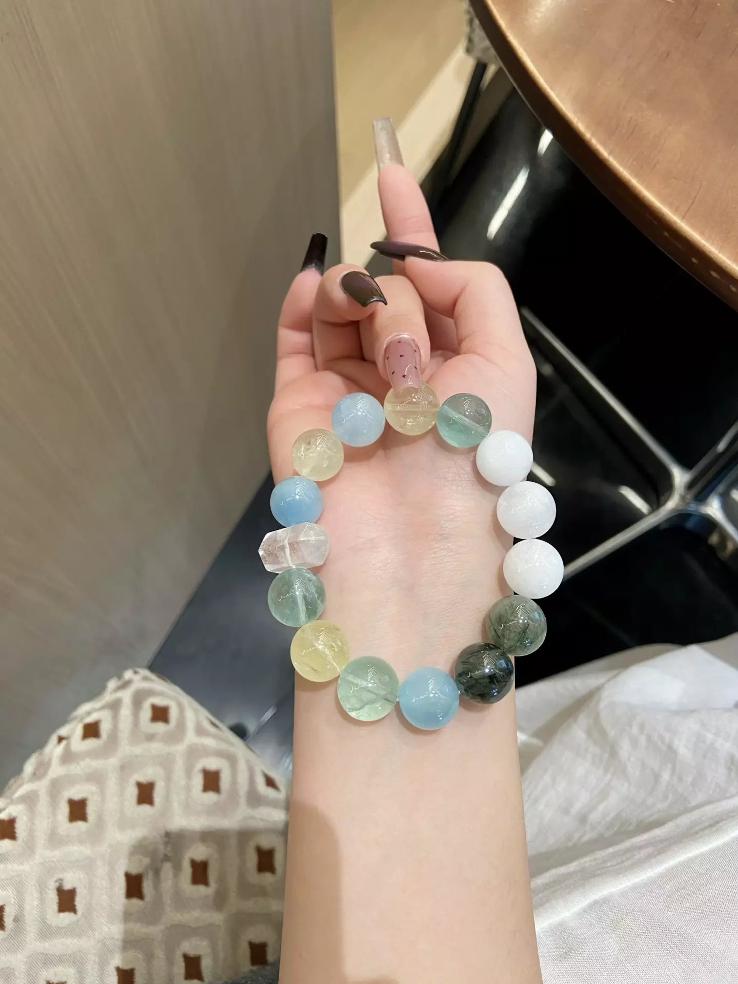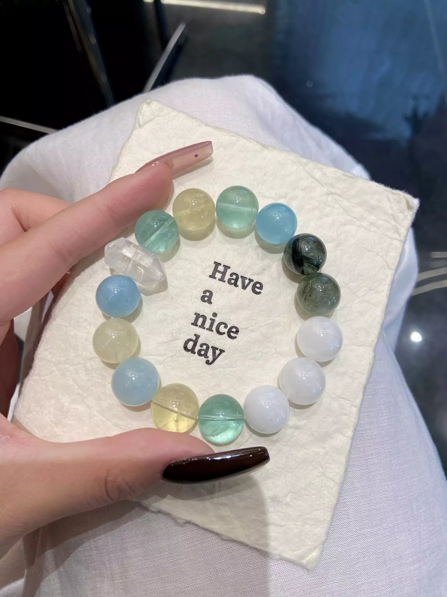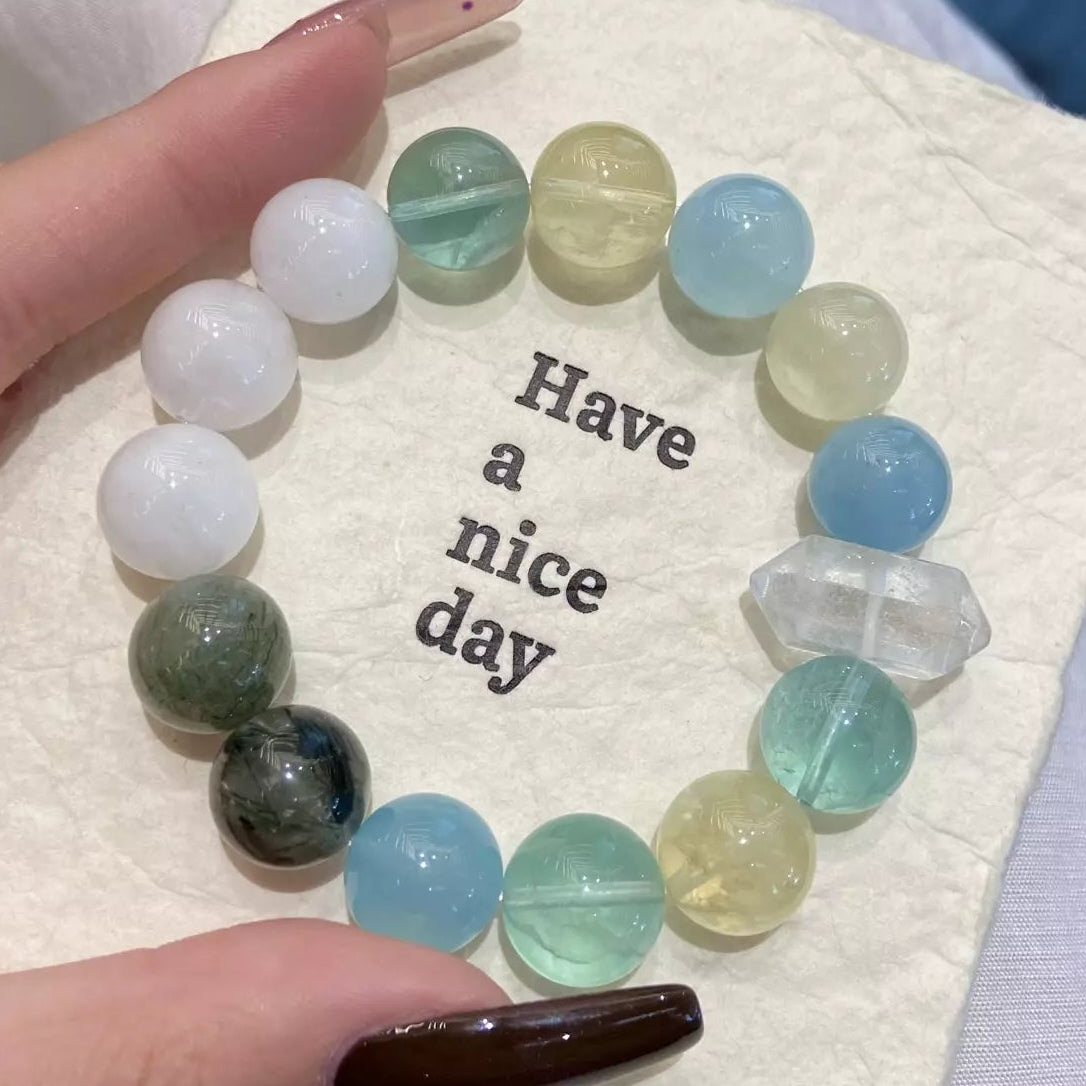 Step into pure renewal with this crystal blend🌿✨! White Phantom Quartz (white/transparent) ushers new beginnings & purity, Green Rutilated Quartz + Green Fluorite (green) bring balance & wisdom🔮. Aquamarine (blue) offers safe protection🛡️ and relieves discomfort, Citrine (yellow) boosts confidence💪. Blending vibrant hues, it’s your daily companion for spiritual growth, calm, and courage. Wear to embrace fresh starts and radiant positive energy!