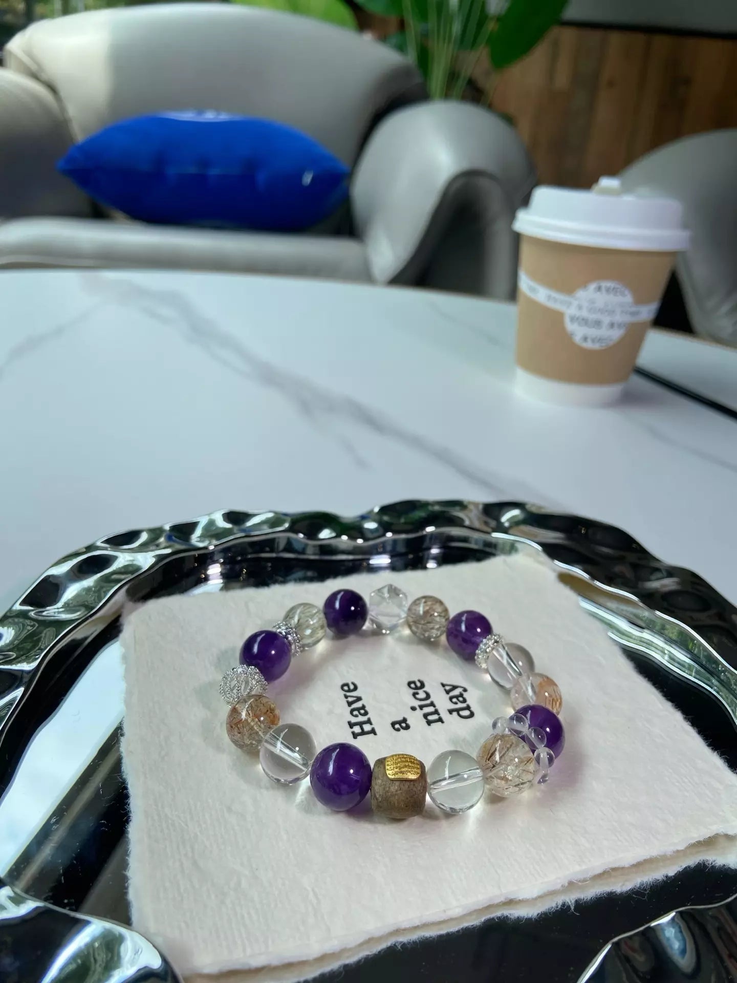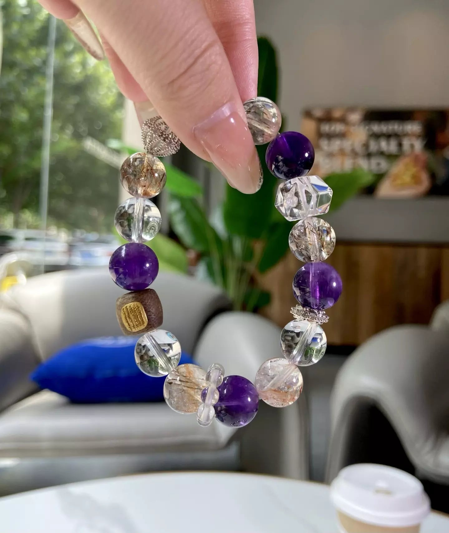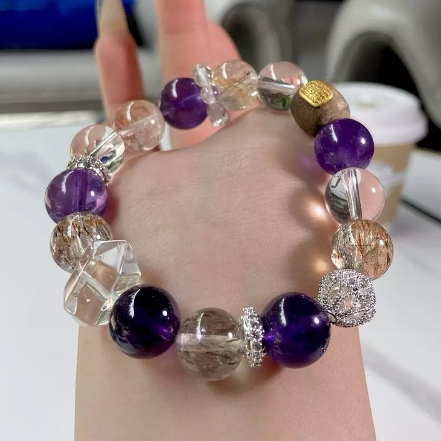 Immerse in the balancing, revitalizing energy of this crystal trio💎! Amethyst wraps you in calming violet vibes 😌, soothing restless emotions and easing aches gently. Black Gold Super Seven ignites your inner spark ⚡, boosting vitality to chase daily goals with zest. Clear Quartz acts as a powerful energy cleanser 🧹, wiping out fatigue to help you drift into deep, restful sleep 🌙. Its sleek purple-black-clear palette feels edgy yet elegant—perfect for everyday wear. Wear daily to stay refreshed ✨, balanced and pain-free!