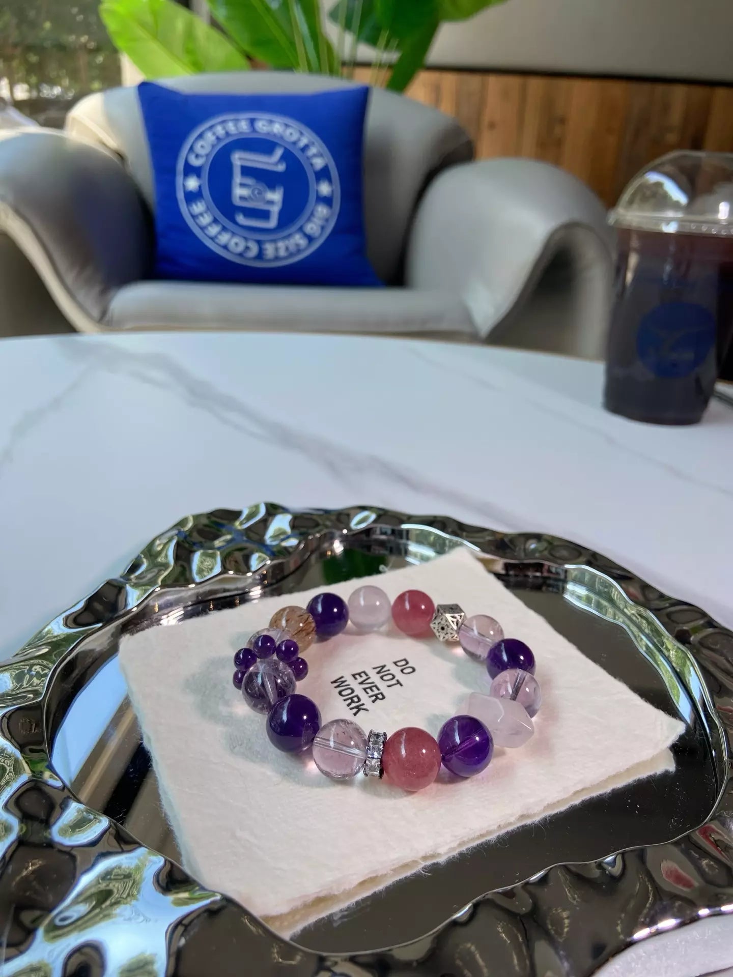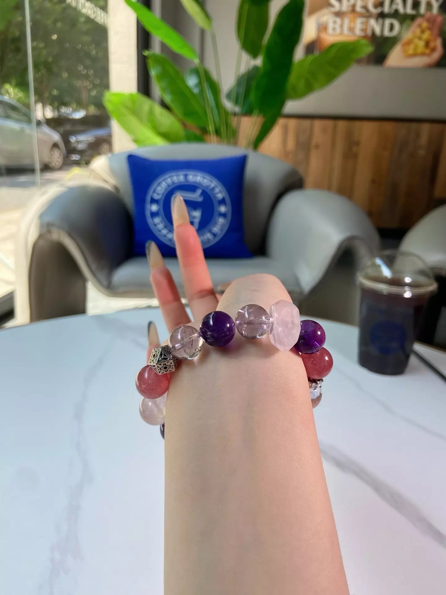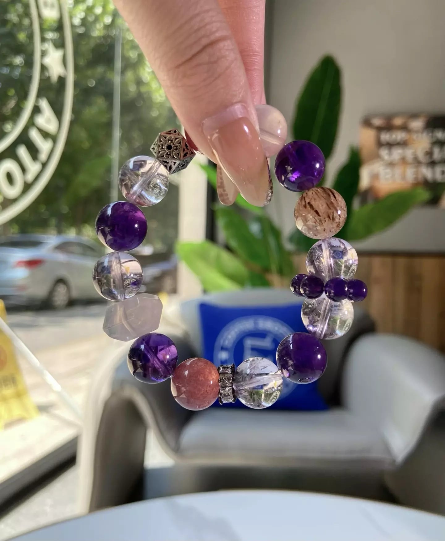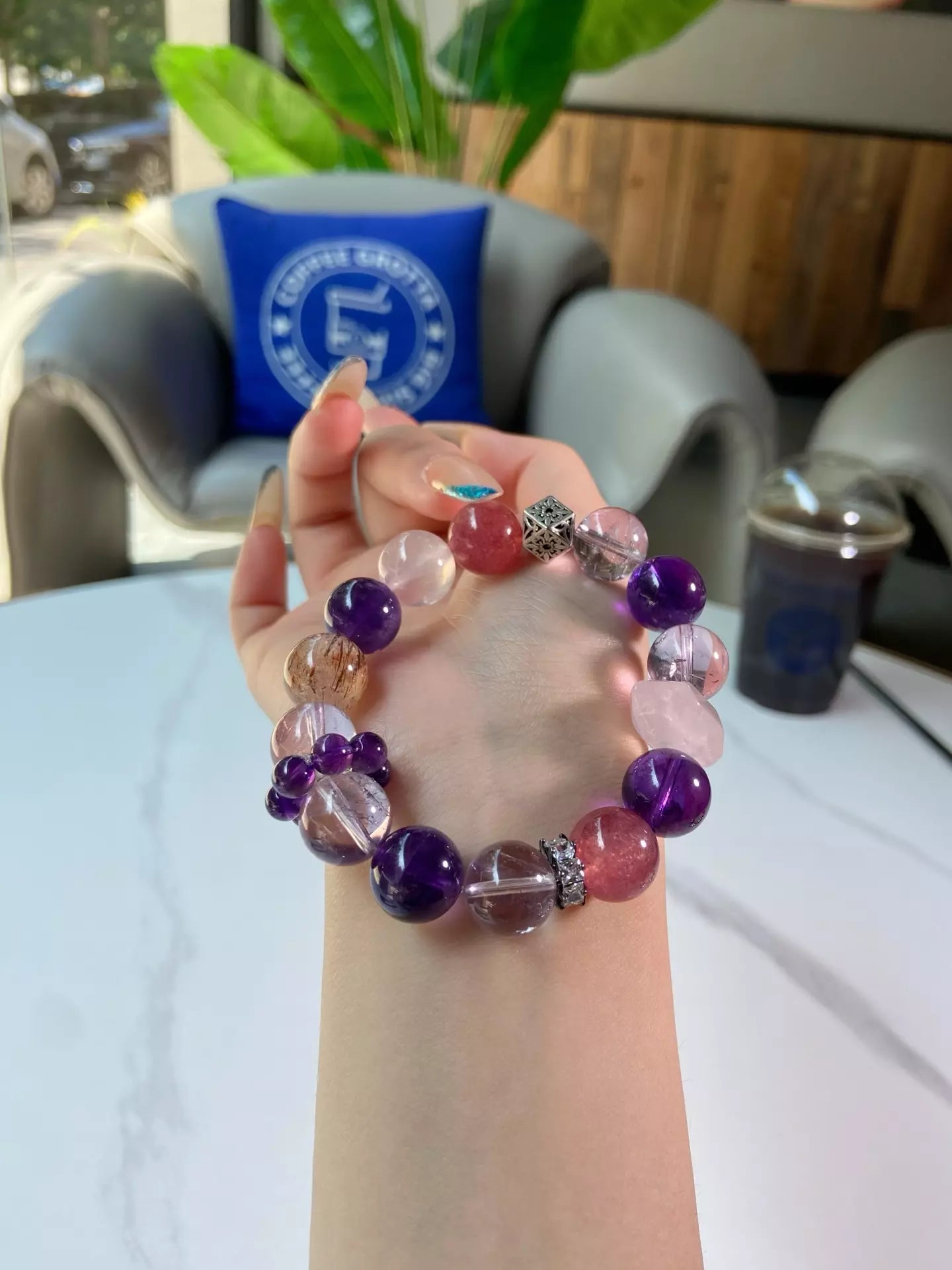 Immerse in the sweet, protective energy of this bracelet💎✨! Amethyst wraps you in happy and peaceful vibes, while fueling inner wisdom and courage💪. Strawberry Quartz acts as a loyal guardian for your precious love💞. Black Gold Super Seven shields you from negative energy around you🛡️. Its lovely purple-red-clear-pink palette glows like sweet berries mixed with brown sugar—wear daily to embrace warmth, bravery and sweet romance💫!