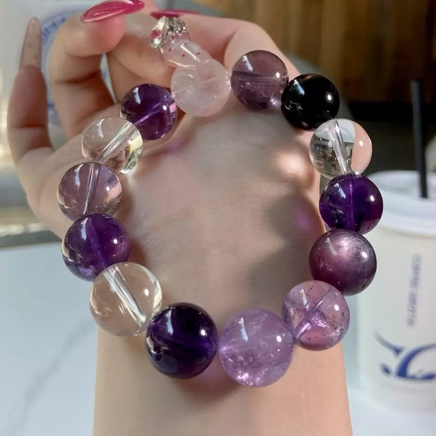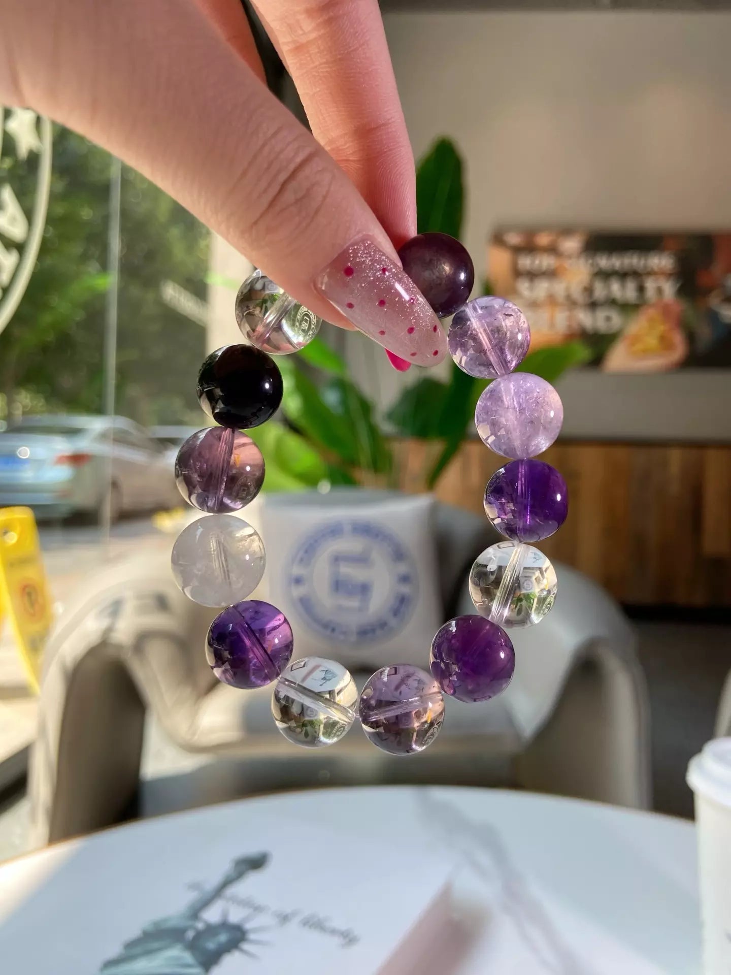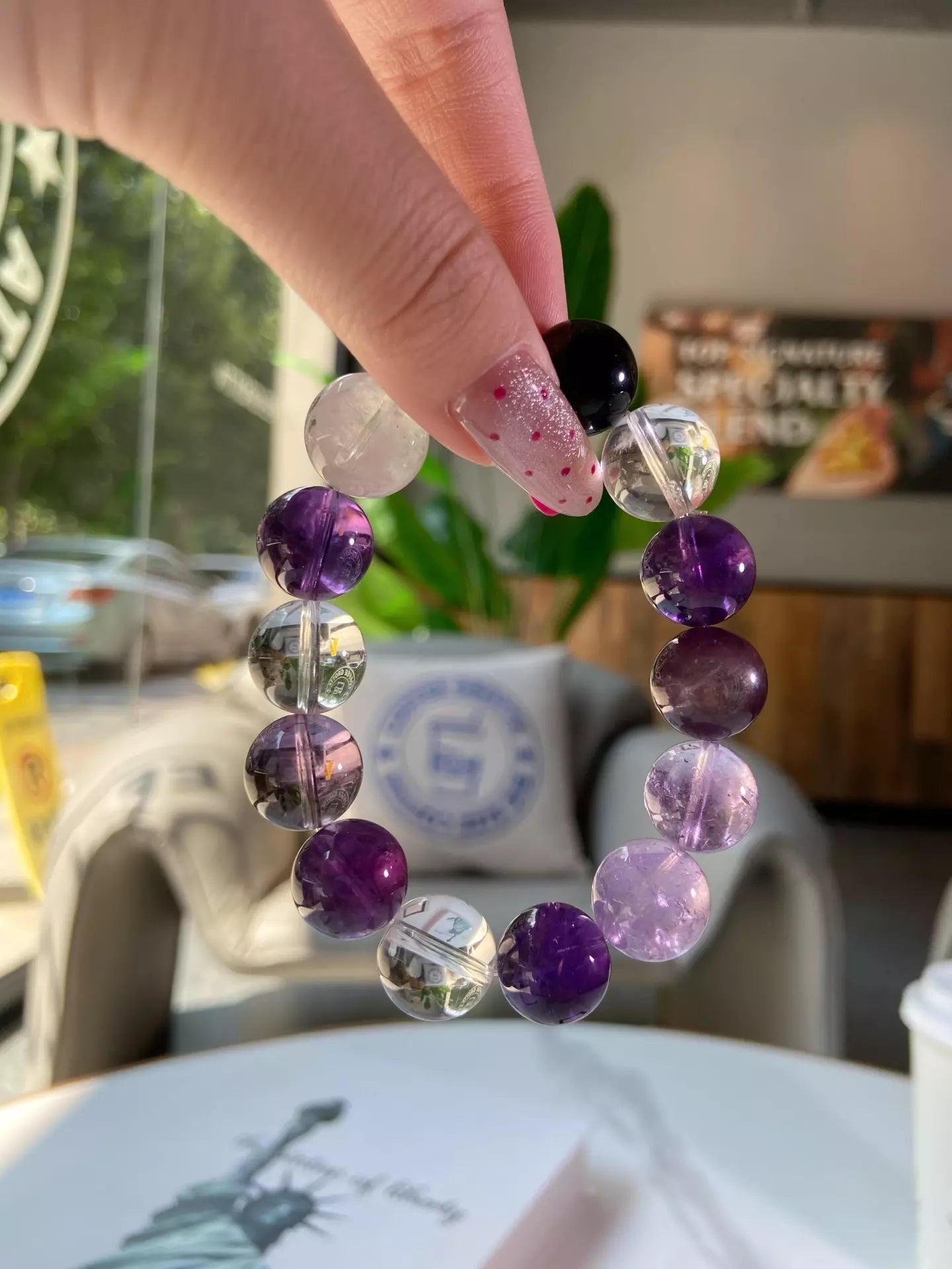 Immerse in the ethereal, protective energy of this bracelet🔮✨! Amethyst awakens inner wisdom and courage, while Purple Lepidolite wraps you in warm vibes of happiness and peace. Silver Sheen Obsidian guards precious love tenderly💖, and Clear Quartz & White Phantom amplify positive energy to purify your aura. Its delicate clear-purple-pink palette glows like divine light in the purple sky—wear daily to embrace tranquil strength and romantic charm🌙!