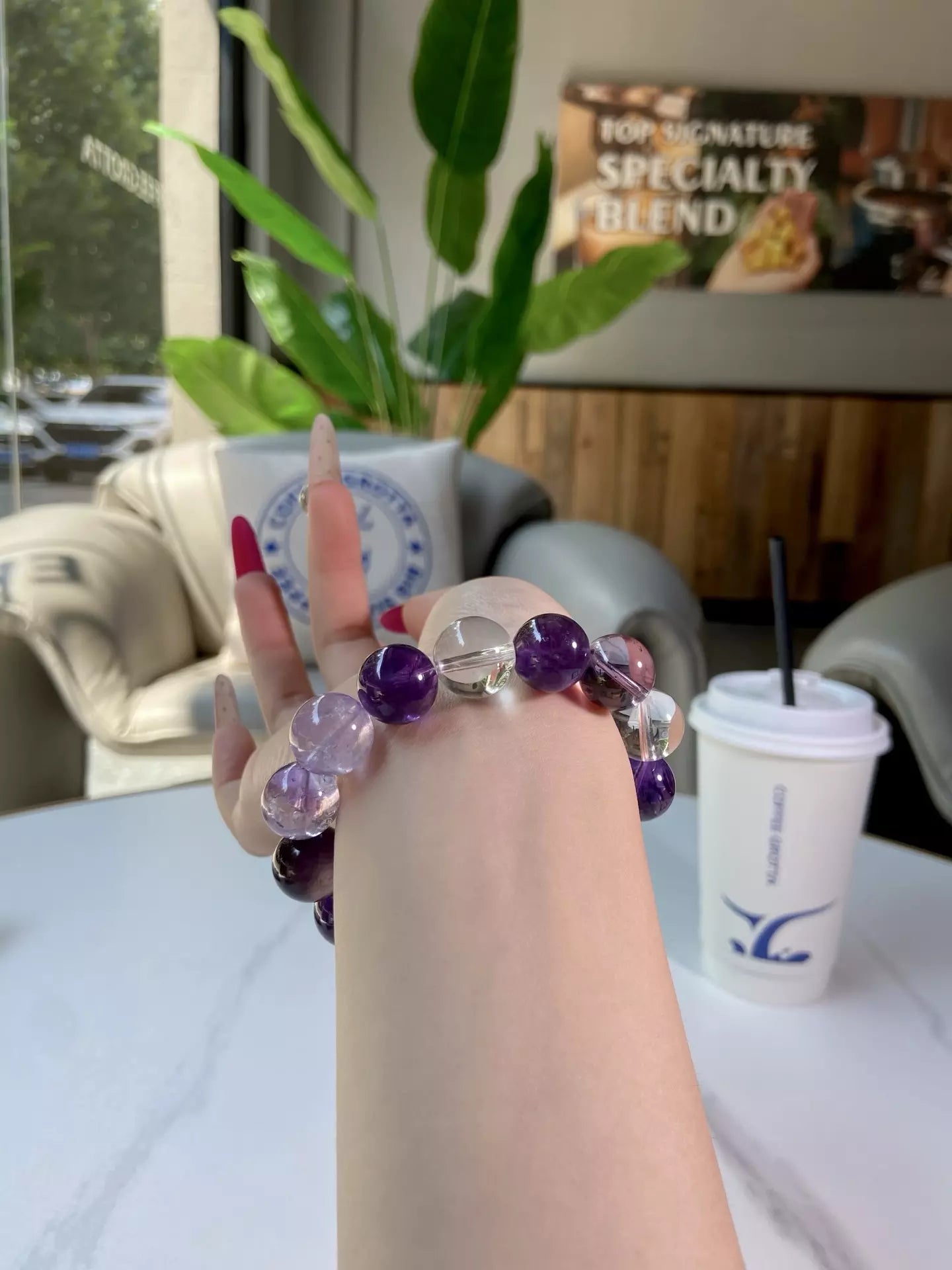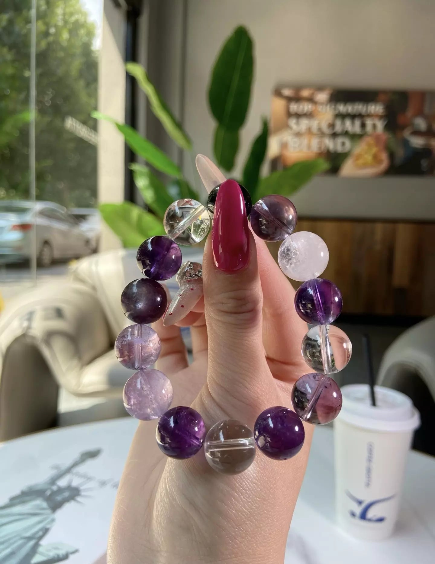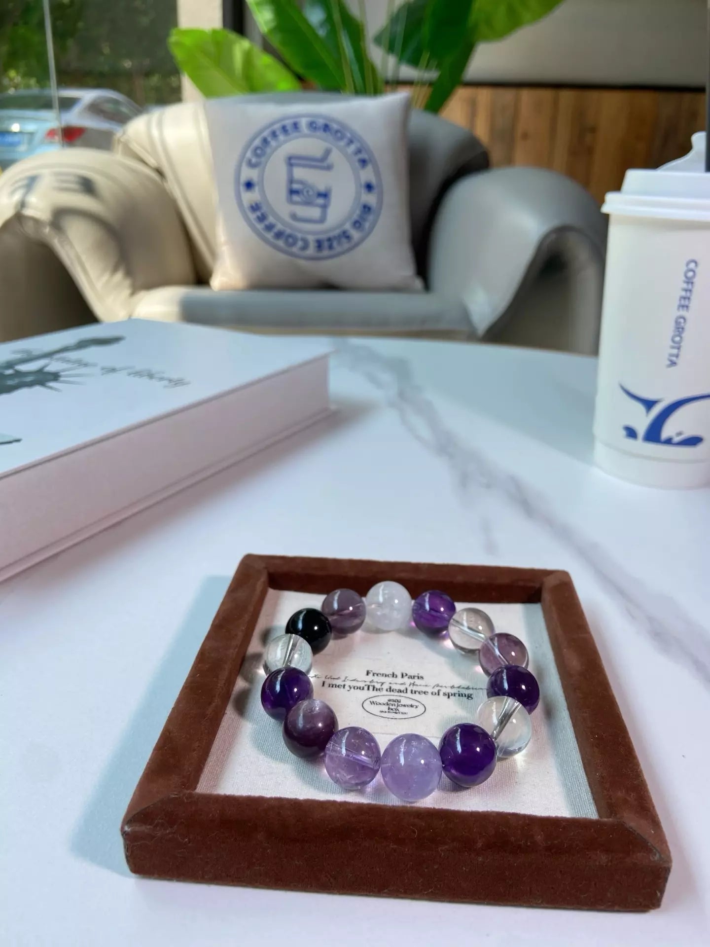 Immerse in the ethereal, protective energy of this bracelet🔮✨! Amethyst awakens inner wisdom and courage, while Purple Lepidolite wraps you in warm vibes of happiness and peace. Silver Sheen Obsidian guards precious love tenderly💖, and Clear Quartz & White Phantom amplify positive energy to purify your aura. Its delicate clear-purple-pink palette glows like divine light in the purple sky—wear daily to embrace tranquil strength and romantic charm🌙!