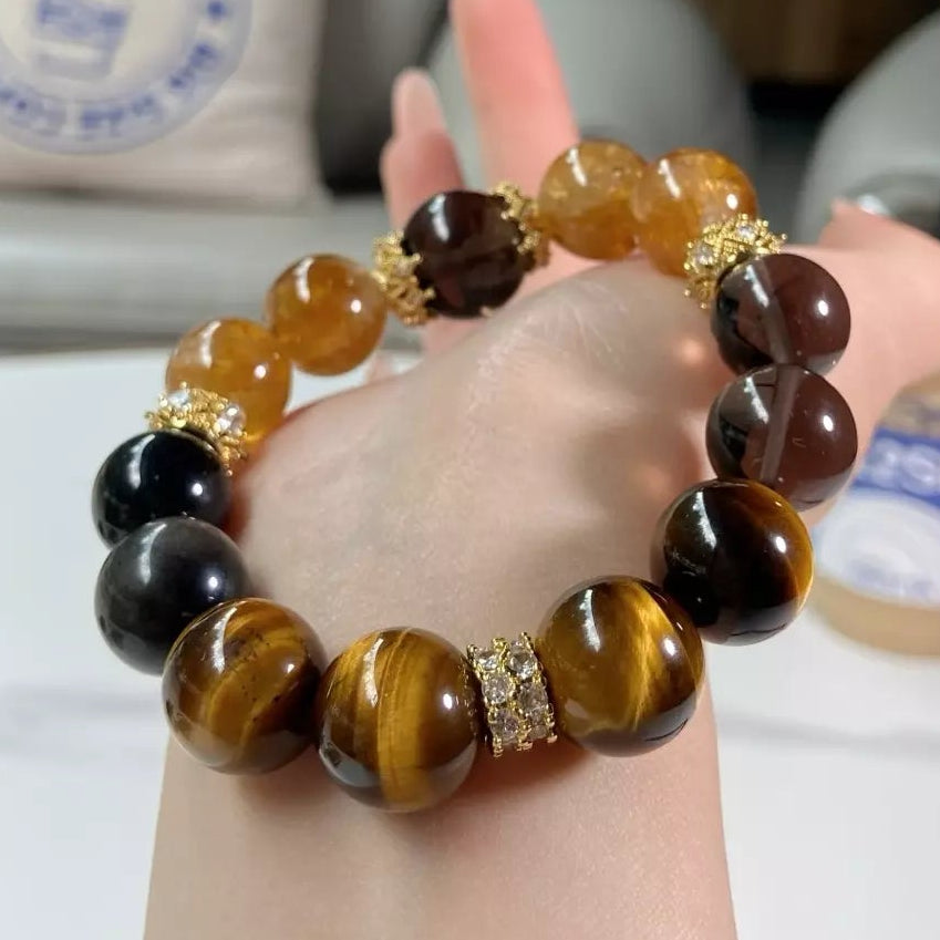 Embrace earthy luxury with Quicksand & Gleaming Gold✨! Yellow Tiger's Eye & Citrine radiate golden warmth, boosting confidence💪 and stabilizing mood. Smoky Quartz relieves stress😮💨 and enhances focus🧠, while Silver Obsidian balances energy⚖️ and promotes health🩺. The blend of black depth, yellow vibrancy, and golden shimmer mirrors sunlit quicksand—wear daily to stay grounded, energized, and wrapped in understated elegance that shines with every move🌞!