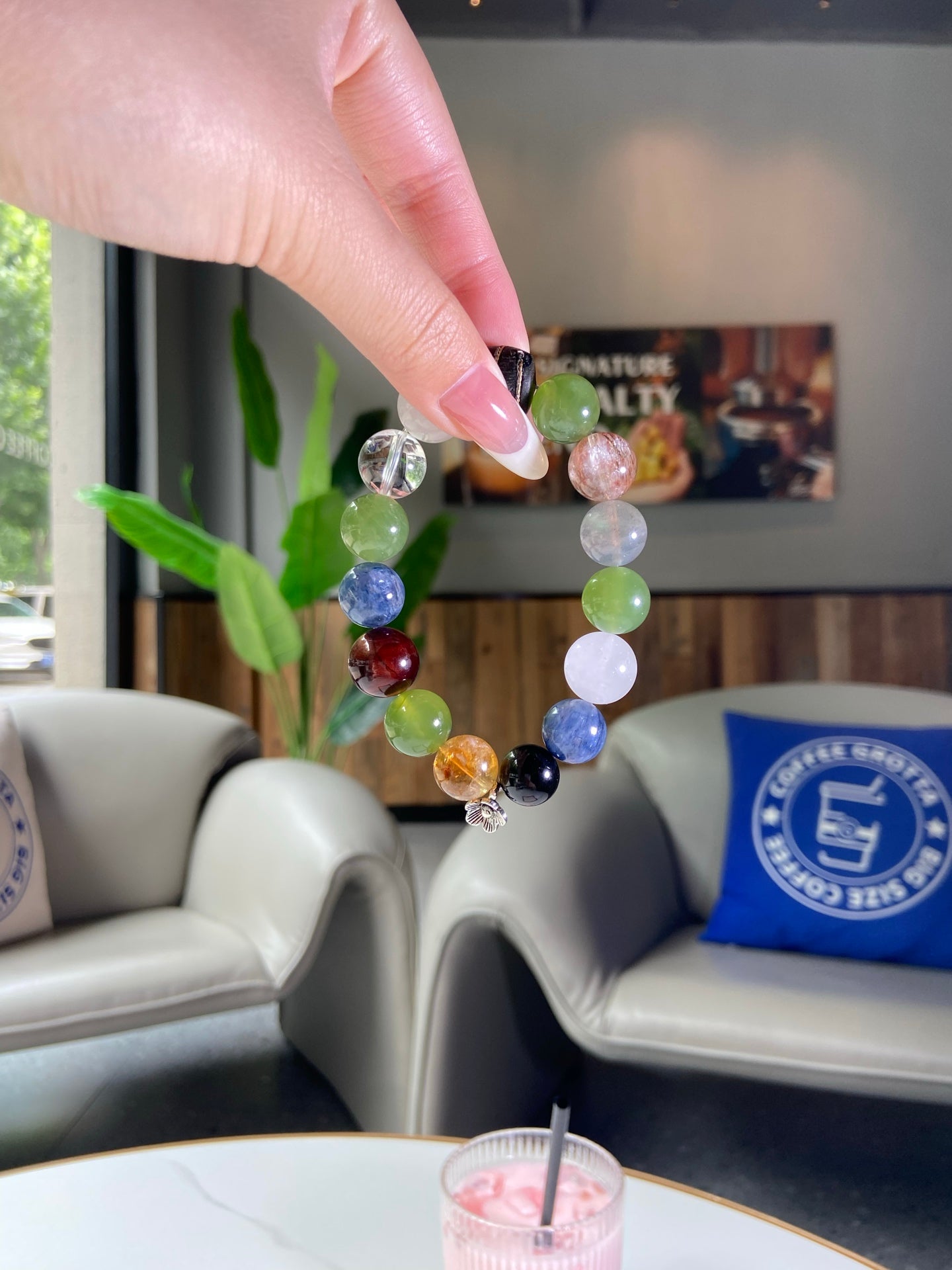 This luxurious multi-gem bracelet gathers seven precious crystals in a vibrant color symphony! Black Gold Super Seven radiates strong protective energy, Gray Moonstone soothes moods like soft moonlight 🌙, Clear Phantom Quartz purifies negativity, Kyanite sharpens clarity, Silver Sheen Obsidian shields aura, Golden Citrine Tower draws wealth 💰, and Red Tiger’s Eye boosts courage. Revered as a lucky charm for prosperity, it blends opulent aesthetics with powerful vibes, making every wear a statement of fortune and elegance!