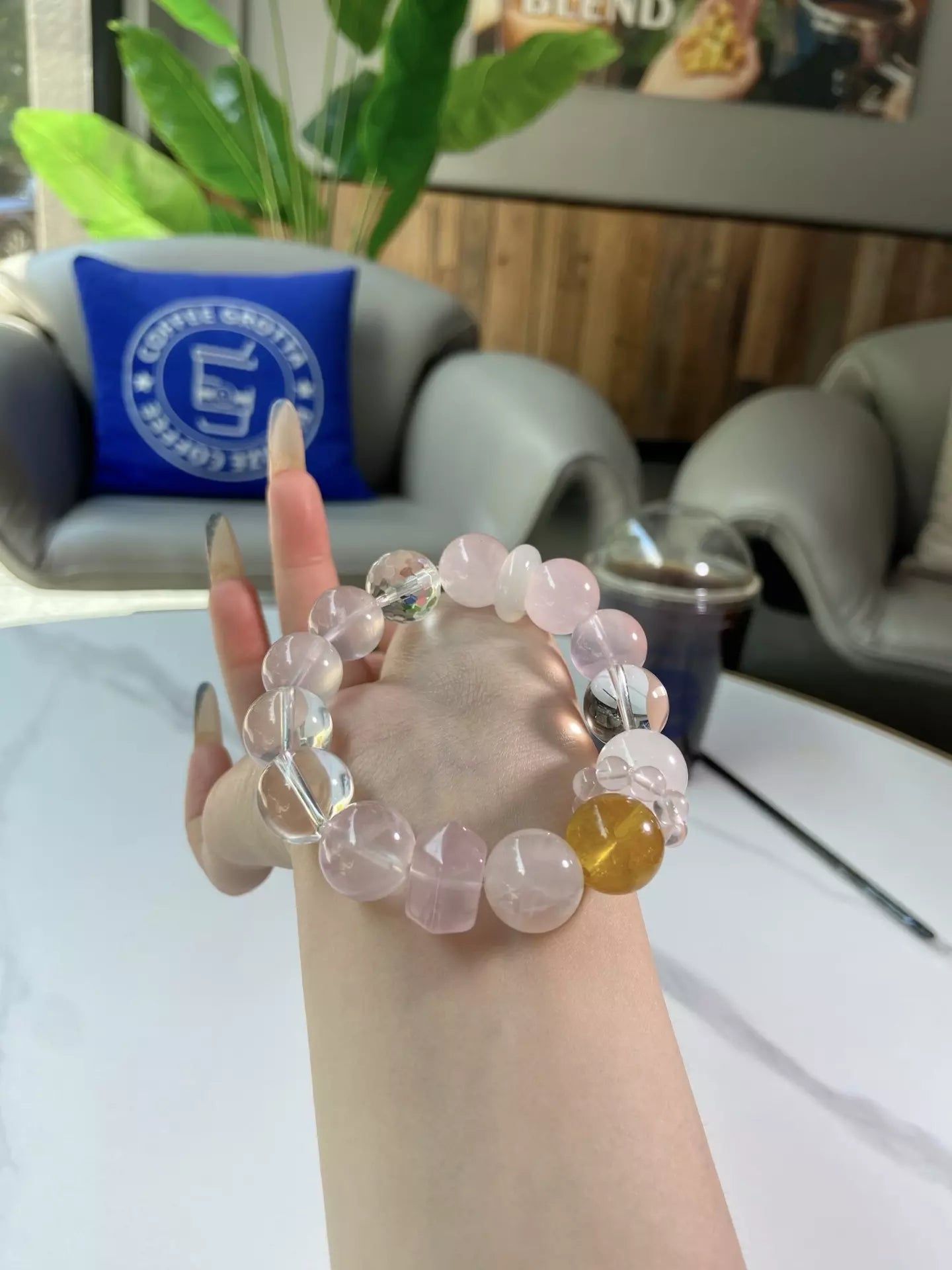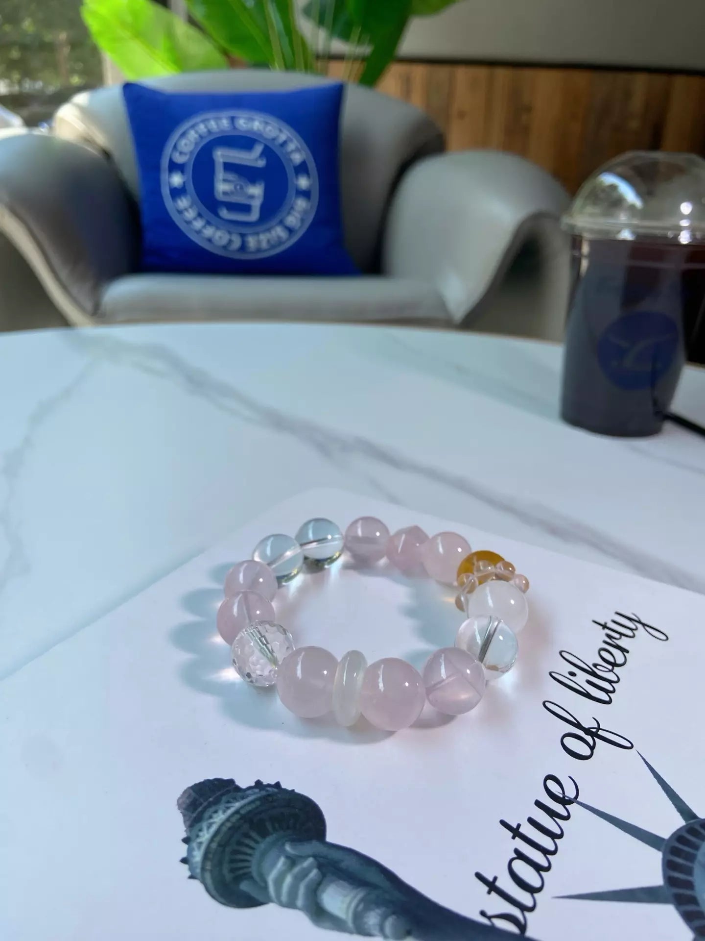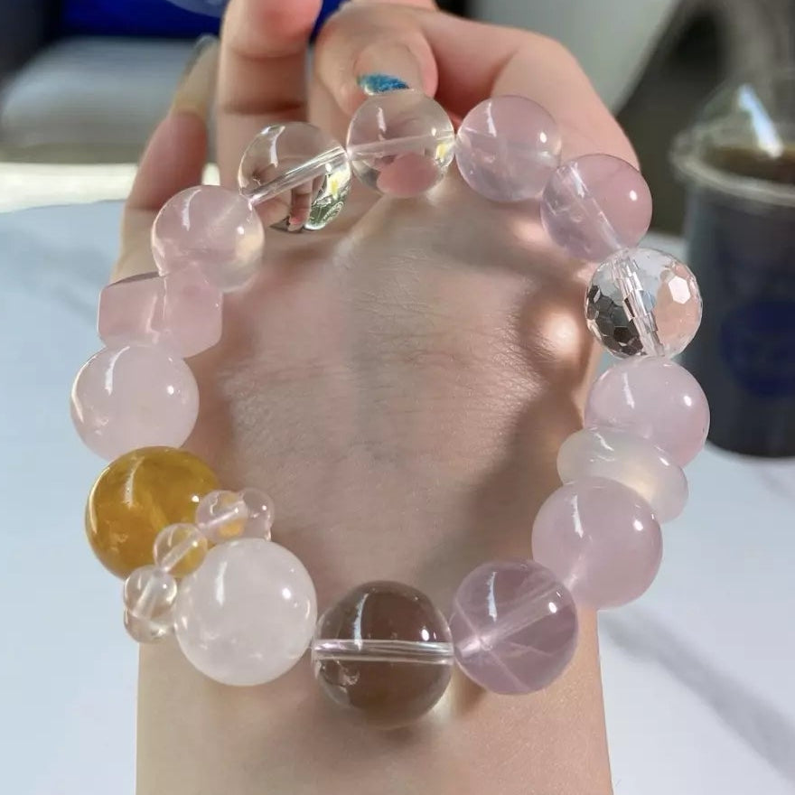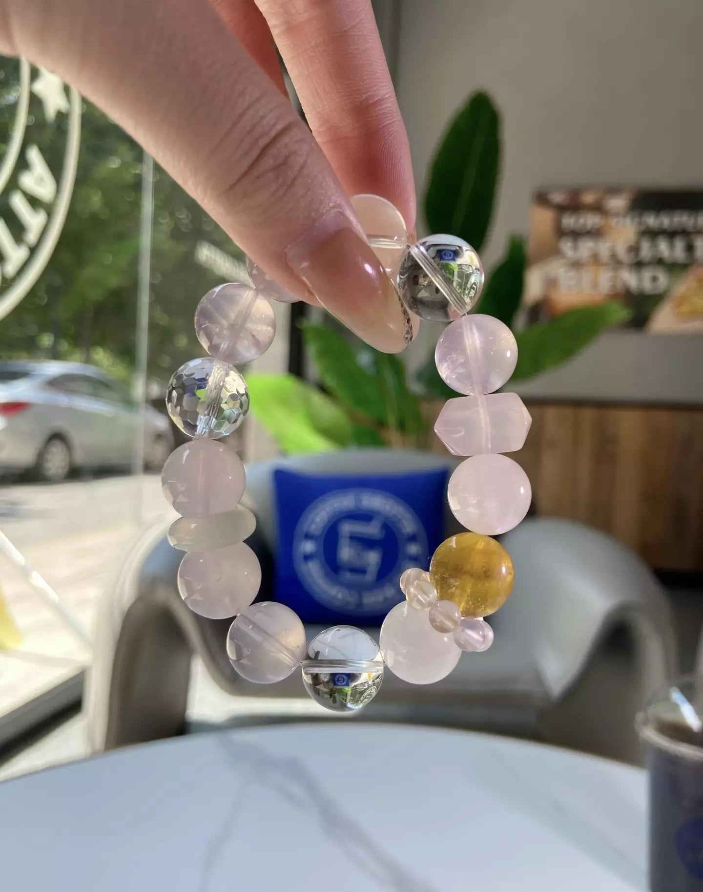 Immerse in the tender, refreshing energy of this bracelet💎✨! Rose Quartz draws sweet love and fosters warm connections. White Phantom & Clear Quartz purify your aura for brand-new starts, while Yellow Fluorite sharpens wisdom and balances your mind. Its soft pink-clear-white-yellow palette glows like snow cherry blossoms in a sweet dream—wear daily to embrace warmth, clarity and blessed harmony💫!