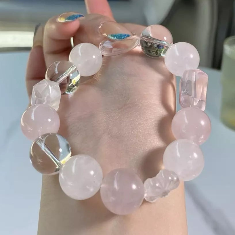 Immerse in the tender, pure energy of this bracelet💎🌸! Rose Quartz fosters sweet love and guides you to embrace self-acceptance deeply💖. White Phantom ushers in pure new starts and awakens inner spirituality🔮. Clear Quartz amplifies positive vibes and perfects mind-soul balance⚖️. Its soft pink-clear palette glows like snow kissed by pink light—wear daily to embrace peace, harmony and warm, uplifting energy✨!