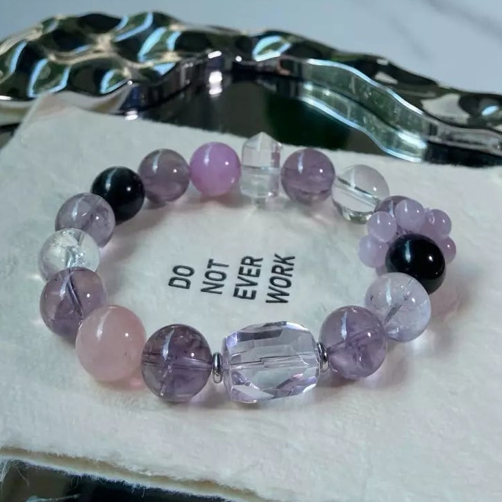 Indulge in the gentle, enlightening energy of this premium crystal collection💎! Amethyst and Kunzite wrap you in happy, peaceful vibes while gifting wisdom and courage to face challenges. Silver Sheen Obsidian guards your precious love tightly💖, Rose Quartz balances fluctuating moods smoothly, and Clear Quartz plus White Azeztulite boost beauty and elevate temperament. Its elegant purple-pink-clear-black palette glows softly—wear daily for grace, love and inner peace🌟!