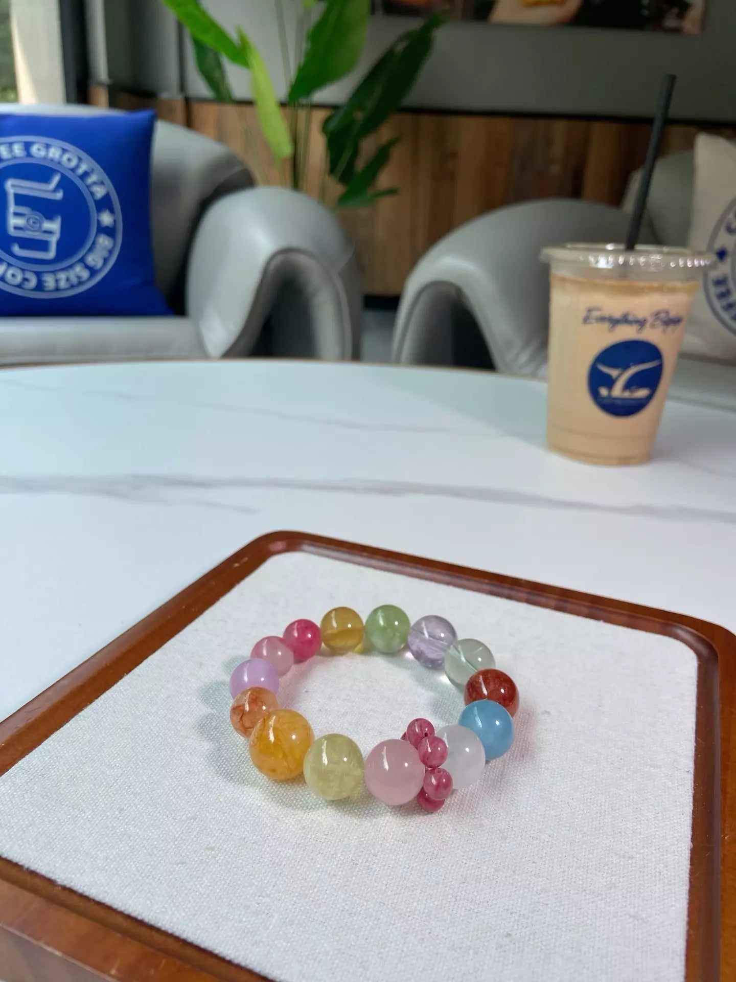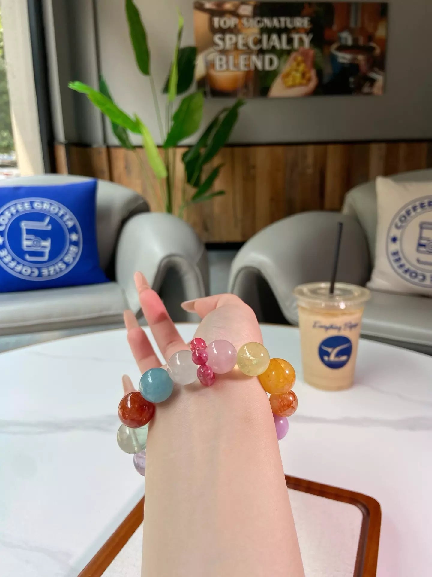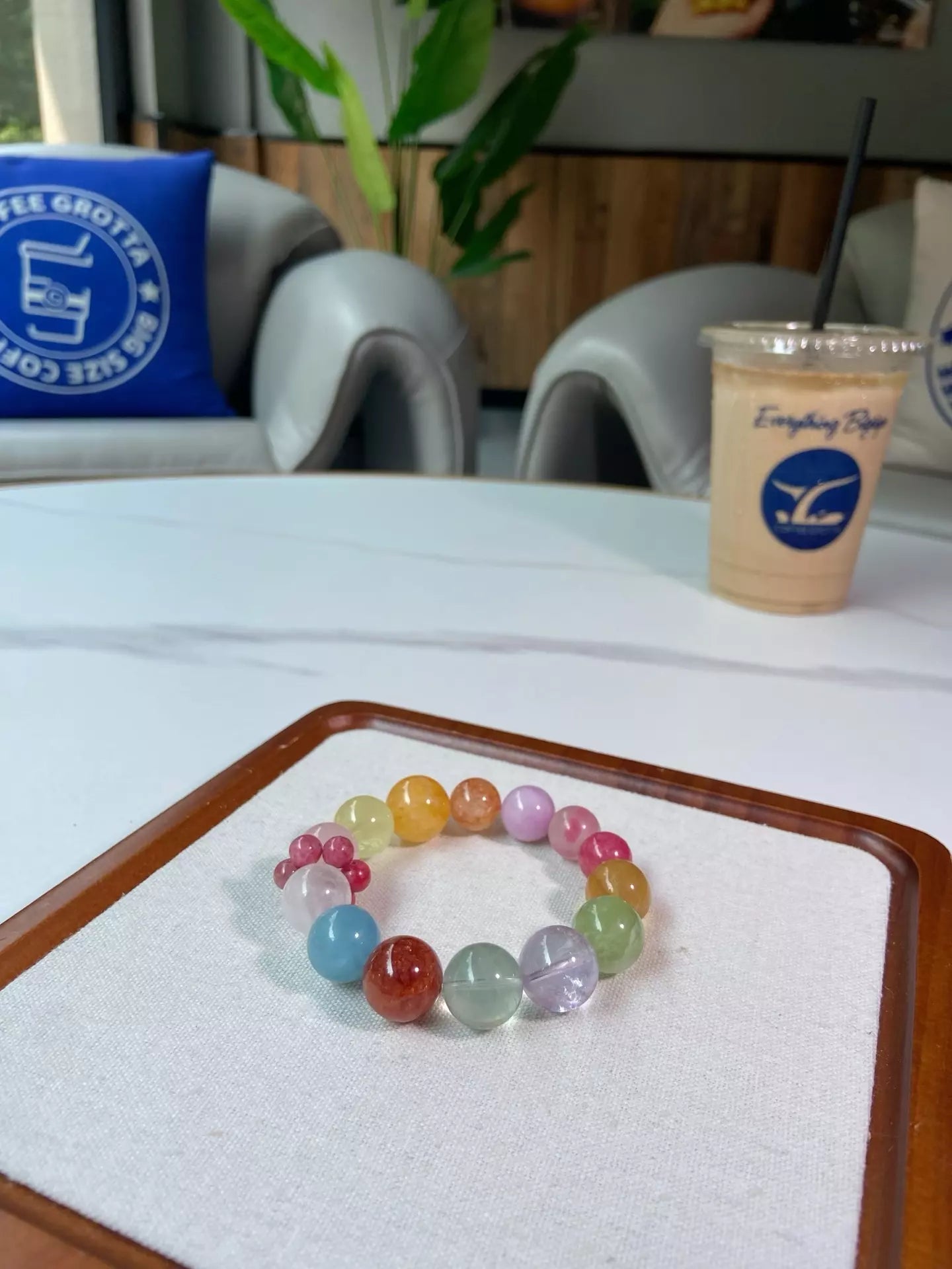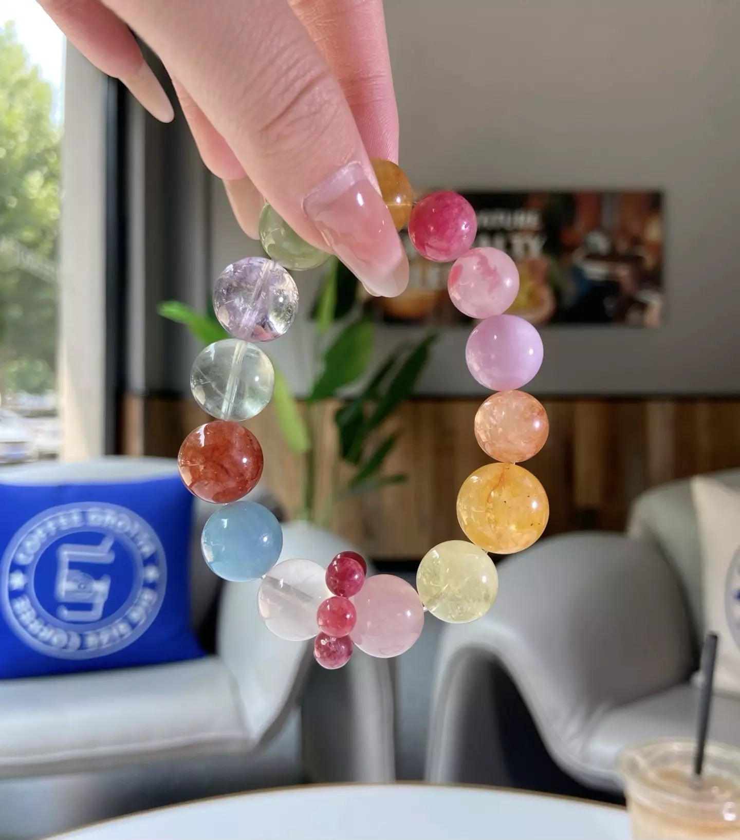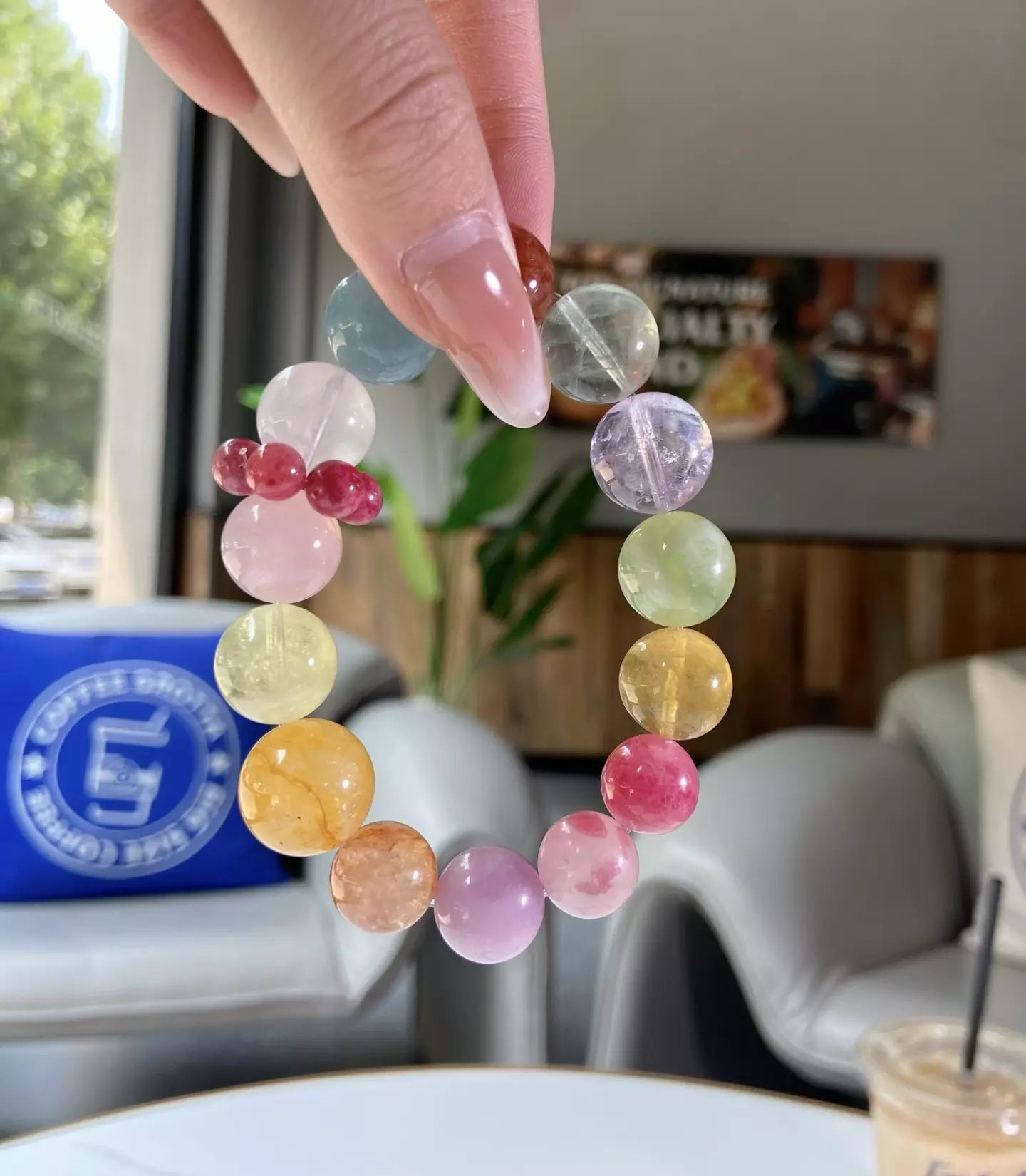 Elements: White Phantom Quartz🌨️, Aquamarine💧, Red Rutilated Quartz❤️, Green Fluorite🟢, Amethyst💜, Matcha Milk Cap Quartz🥛, Yellow Fluorite💛, Rhodonite🌸, Kunzite💖, Yellow Rutilated Quartz🌼