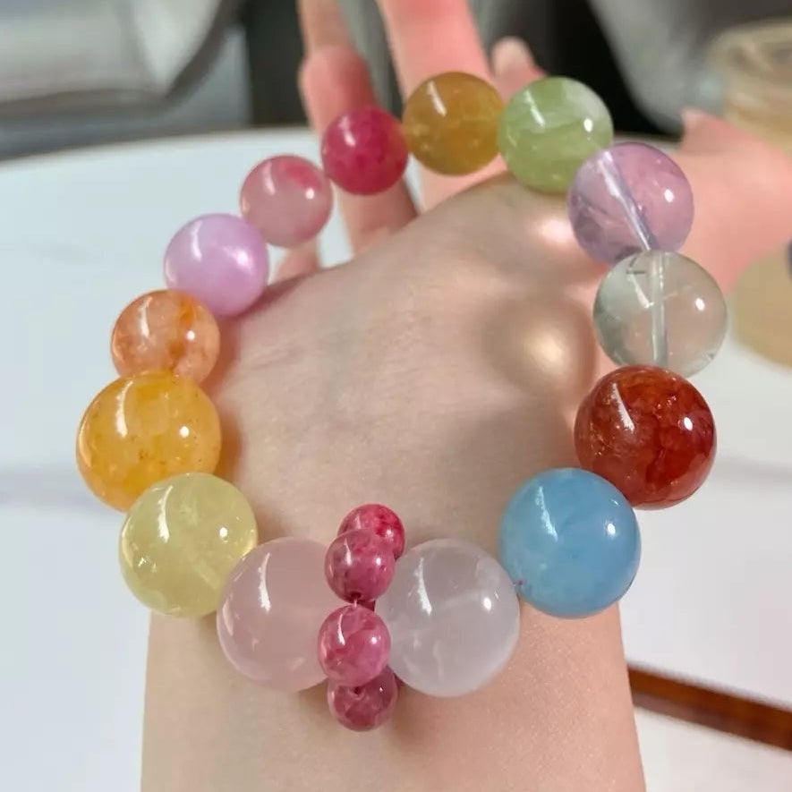 Immerse in the dazzling energy of this multi-crystal blend💎! Bursting with vivid hues, each stone shines with unique charm: White Phantom Quartz🌨️ purifies vibes, Aquamarine💧 calms the mind, Red Rutilated Quartz❤️ ignites passion. Green & Yellow Fluorite🟢💛 boost focus, while Amethyst💜 & Kunzite💖 nurture wisdom and love. Their colorful palette glows like a rainbow—bright and empowering. Wear daily to radiate confidence, embrace positivity, and shine brilliantly in every moment🌟!