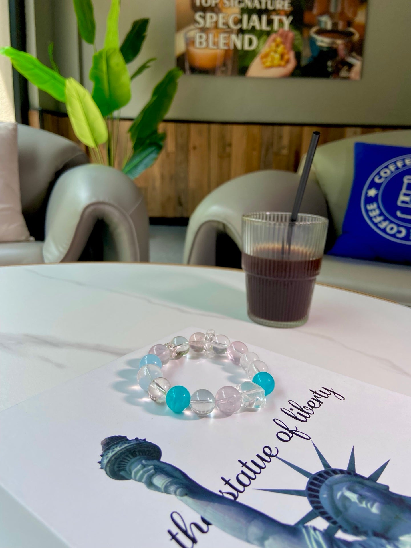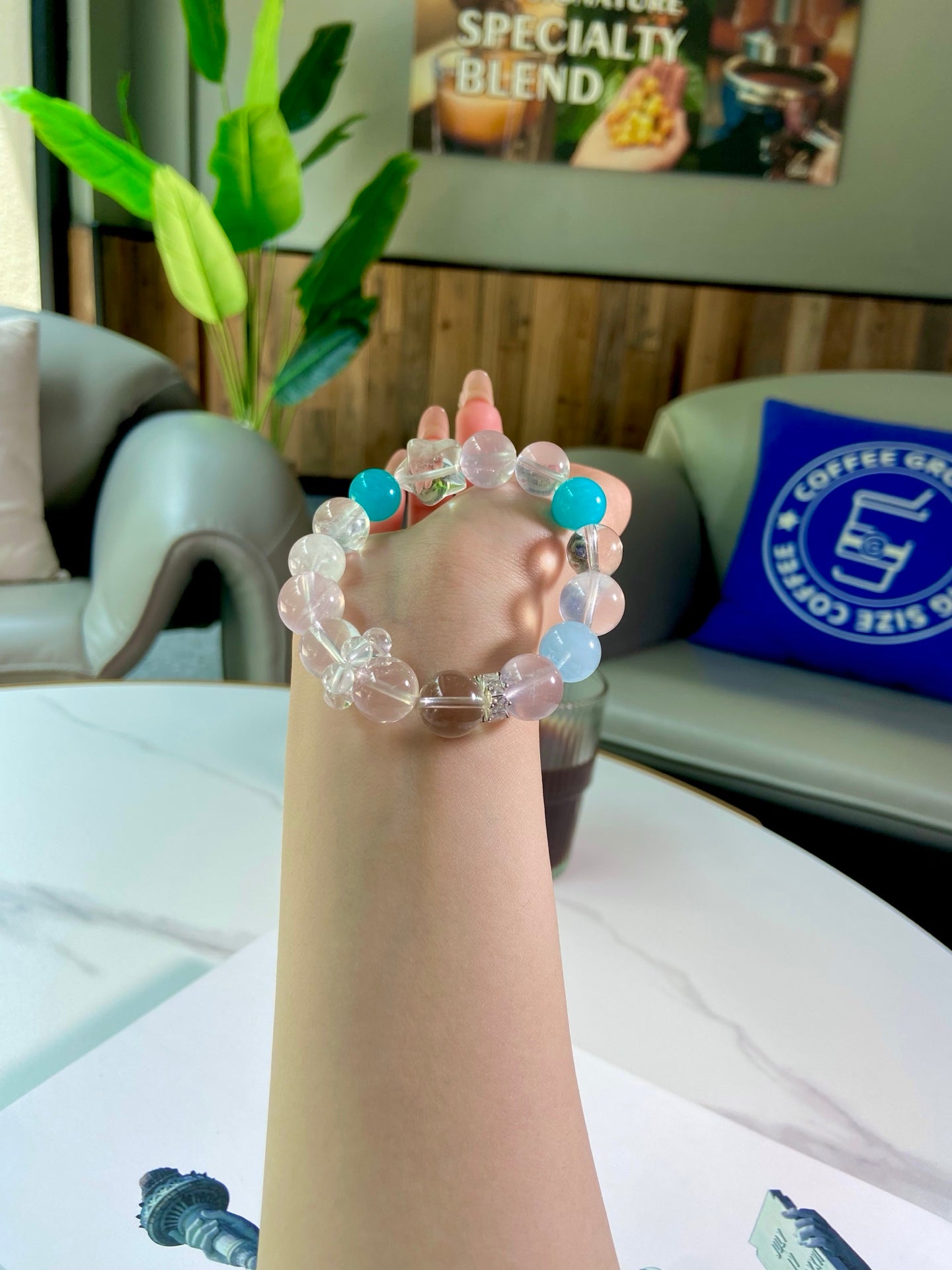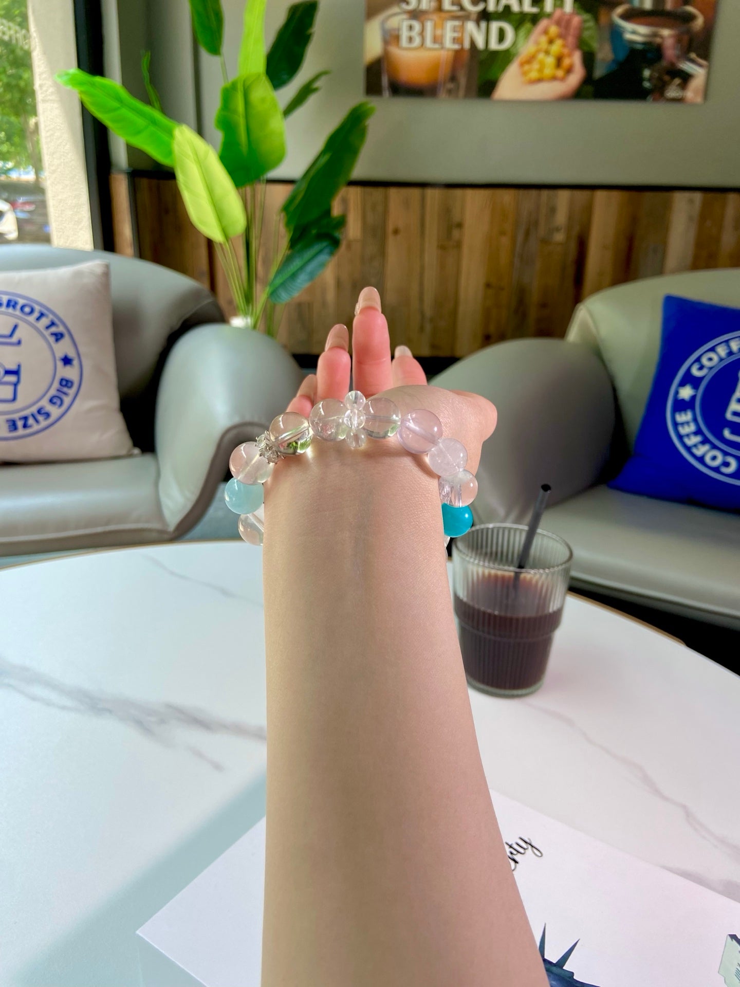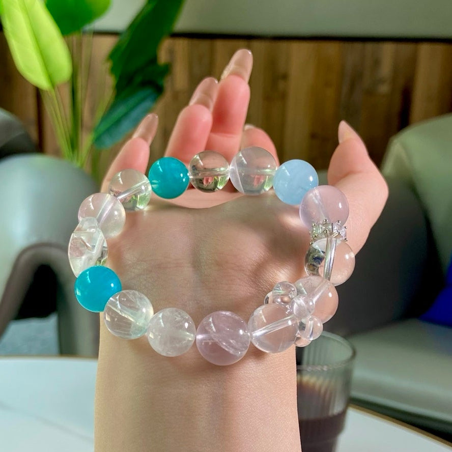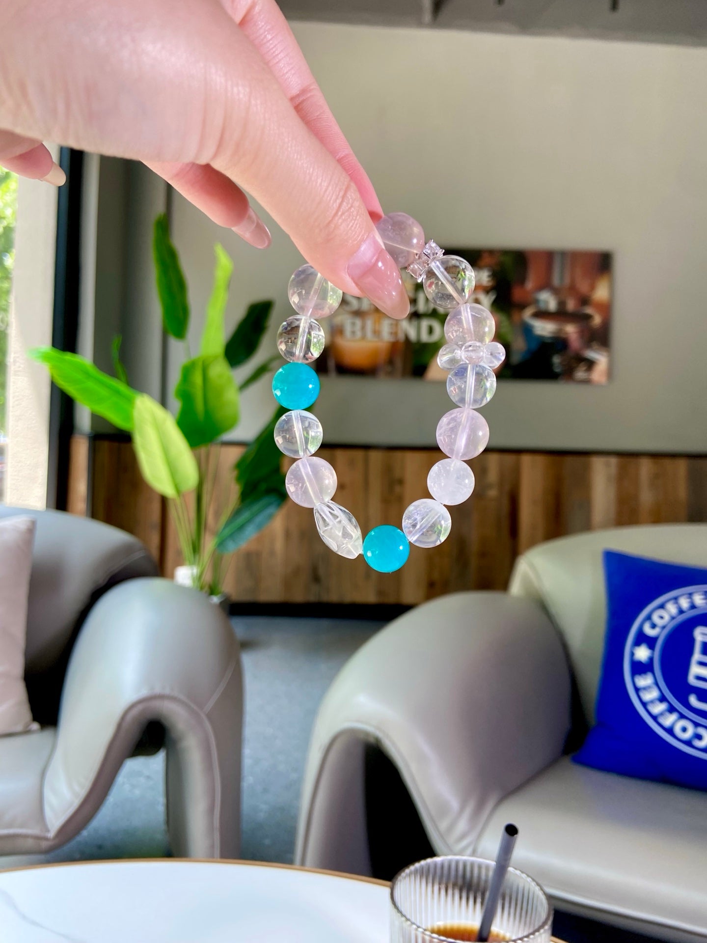A dreamy mix of gemstones: Transparent Clear Quartz/White Phantom/Milky Quartz (like floating star fragments) + tender Rose Quartz + Blue Amazonite/Aquamarine (like misty ocean tides 🌊)!