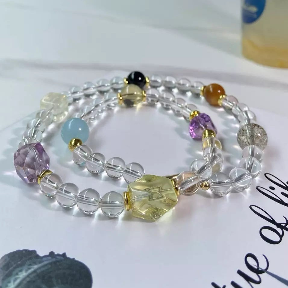 Bask in vibrant, sun-kissed healing with this colorful crystal blend🌞🪸! Clear Quartz sharpens focus🎯 and wipes away negativity🧹, while Aquamarine’s calm blue soothes mood😌. Citrine + Yellow Tiger's Eye ignite positivity & courage💛, Obsidian grounds with steady stability⚫, and Black Gold Super Seven amplifies all benefits for holistic wellness🩹. Blending a rainbow of hues, it shimmers like sunlight dancing on coral reefs—bold, uplifting, and energizing. Wear daily to stay focused, balanced, and radiant with joyful, grounded energy💎✨!