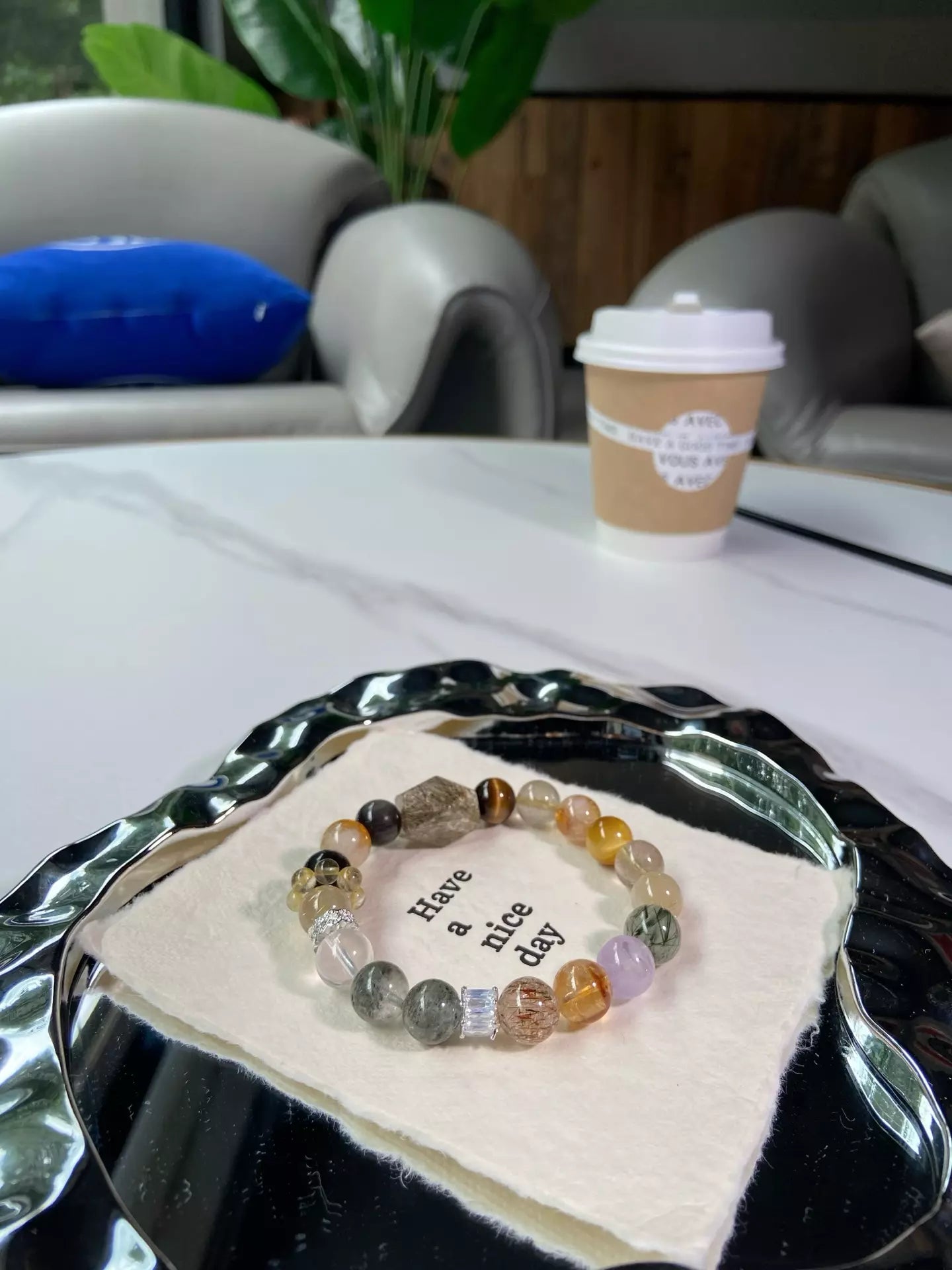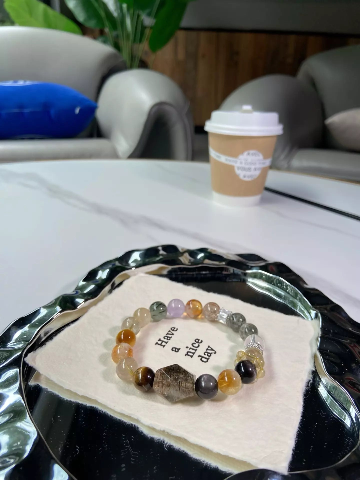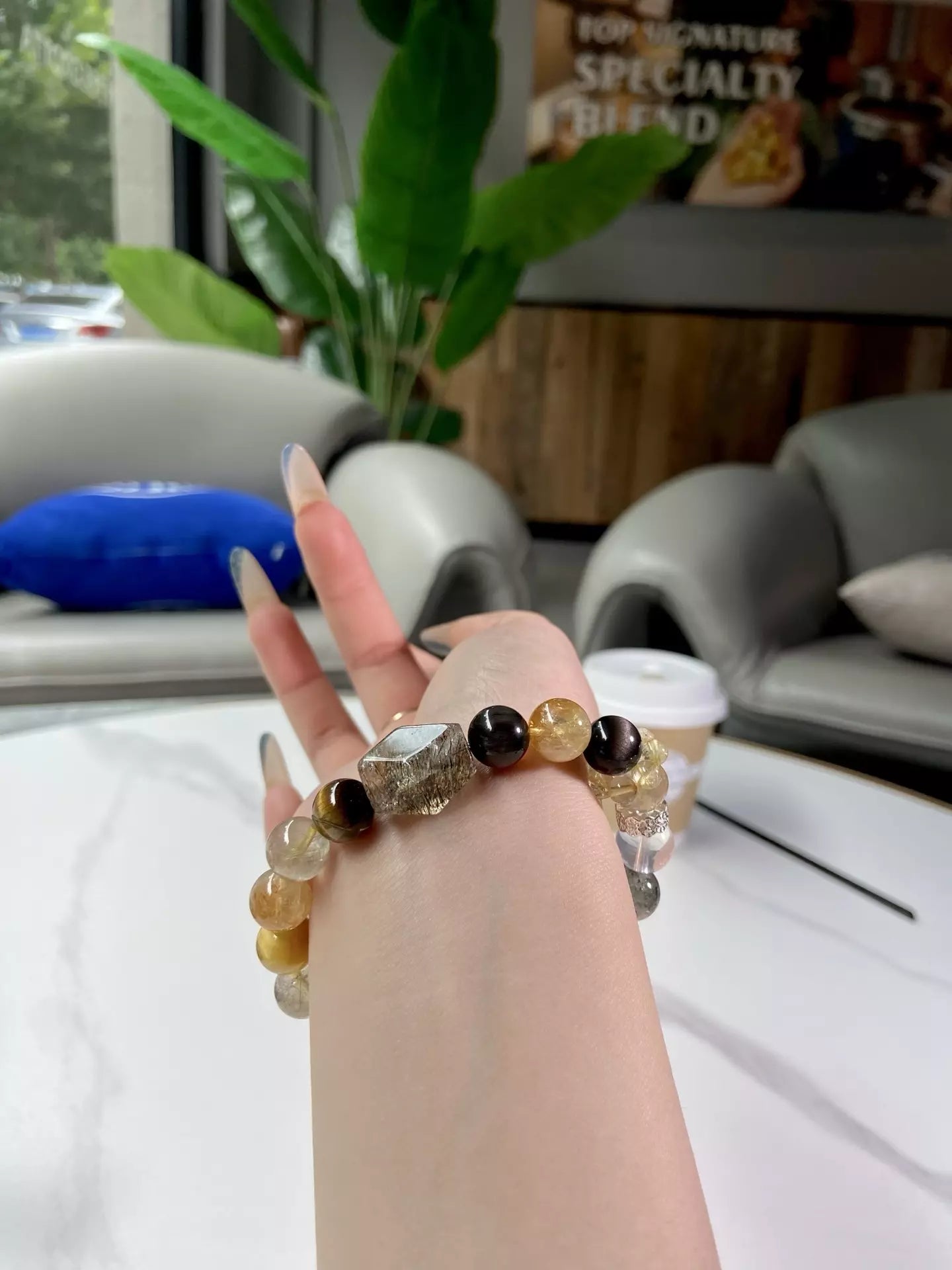 Elements: Silver Sheen Obsidian🖤, Yellow Tower Quartz✨, Rutilated Quartz💛, Golden Tiger Eye🐯, Yellow Tiger Eye☀️, Green Phantom🍃, Green Rutilated Quartz🌿, Black Gold Super Seven🔮, Amethyst💜