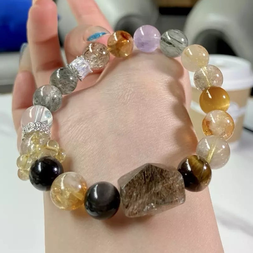 Immerse in the bold, vibrant energy of this crystal medley💎! Golden & Yellow Tiger Eye amp up your inner confidence 🦁, while Yellow Tower Quartz and Rutilated Quartz fuel vitality to support wellness 🫶. Green Phantom and Green Rutilated Quartz bring fresh vibes, Silver Sheen Obsidian shields you from negativity 🛡️, and Amethyst adds a touch of elegance. Its colorful mix shines like a lush mountain—striking, charming and eye-catching. Wear daily to stay poised ✨, healthy 😌 and stylishly radiant!