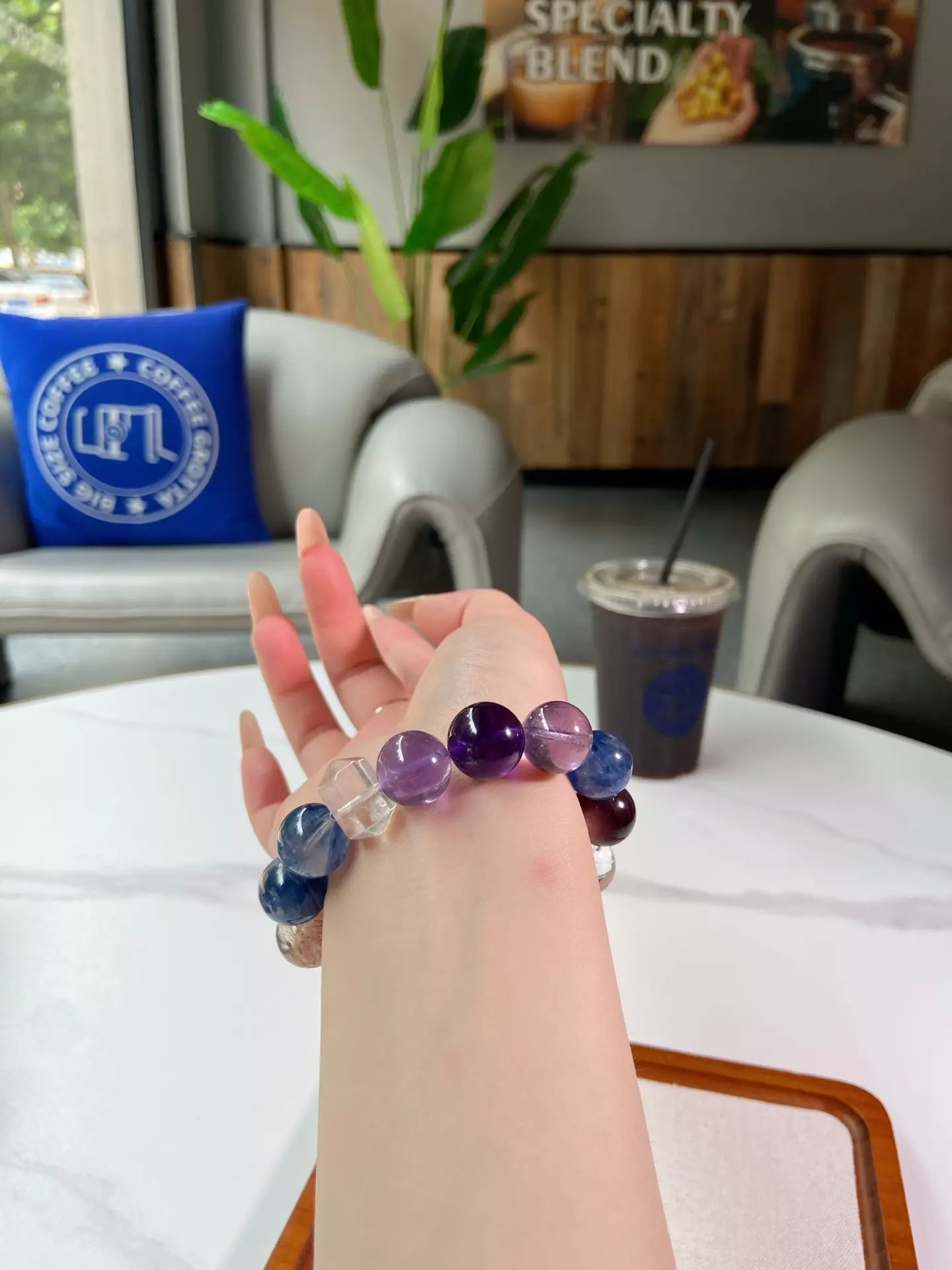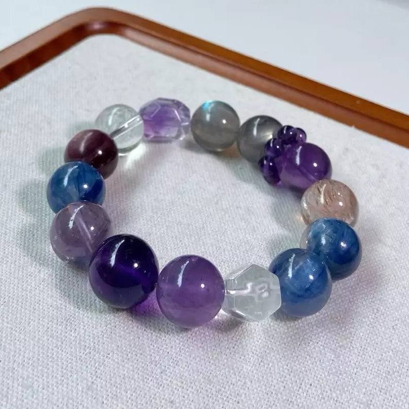 Dive into the mystical aura of this crystal ensemble🌌🔮! Kyanite and Lepidolite calm the mind to balance emotions😌, while Amethyst sharpens intuition for deeper spiritual awareness. Clear Quartz amplifies positive vibes, Grey Moonstone adds gentle guidance, and Black Gold Super Seven fuels courage to elevate communication🗣️. Blending purple, black, grey, blue and transparent hues, it shimmers like a twilight-kissed isle—enchanting, grounding and transformative. Wear daily to stay centered, connect authentically and trust your inner wisdom🌟!